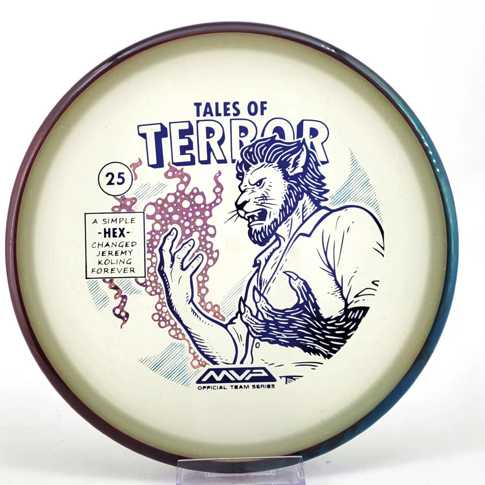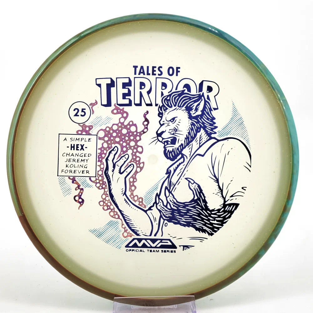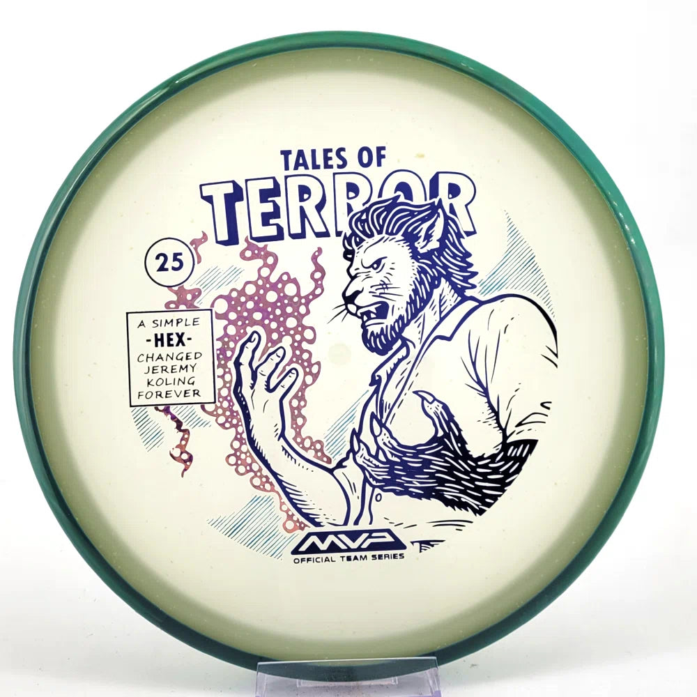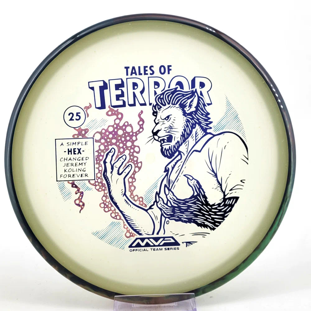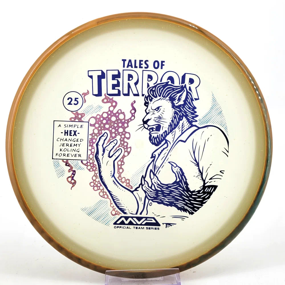 DoubleRam Design shows us the terrifying alternate origin of Jeremy Koling’s childhood nickname - Lionheart - on the new Particle Eclipse Hex! Made with our industry-leading Eclipse plastic, this new blend of glow with colorful particles inside gives the disc its own magical feel.