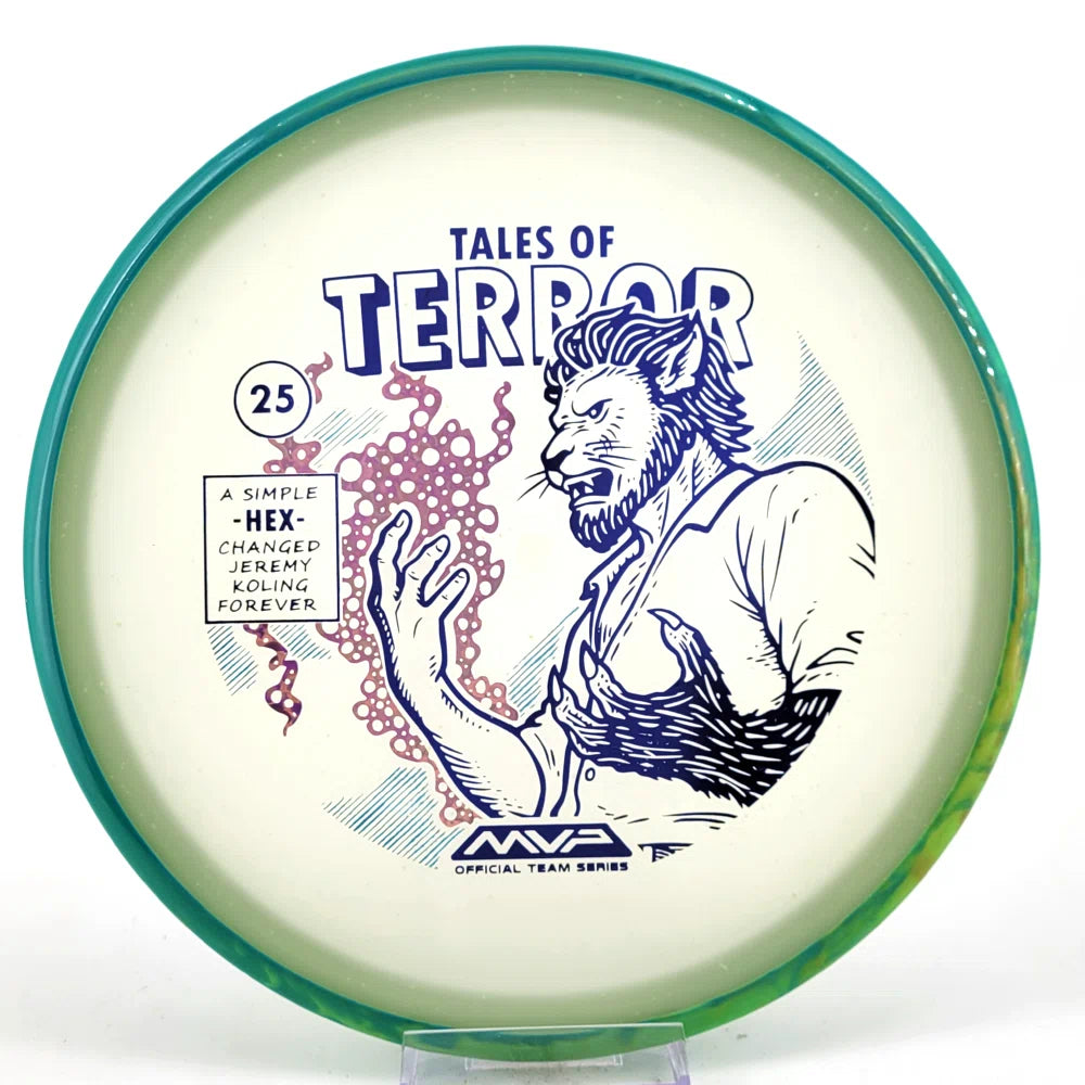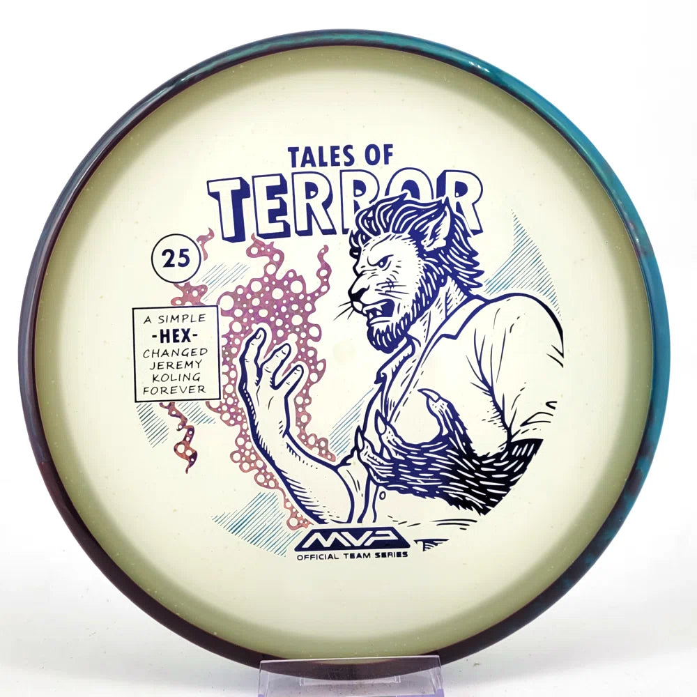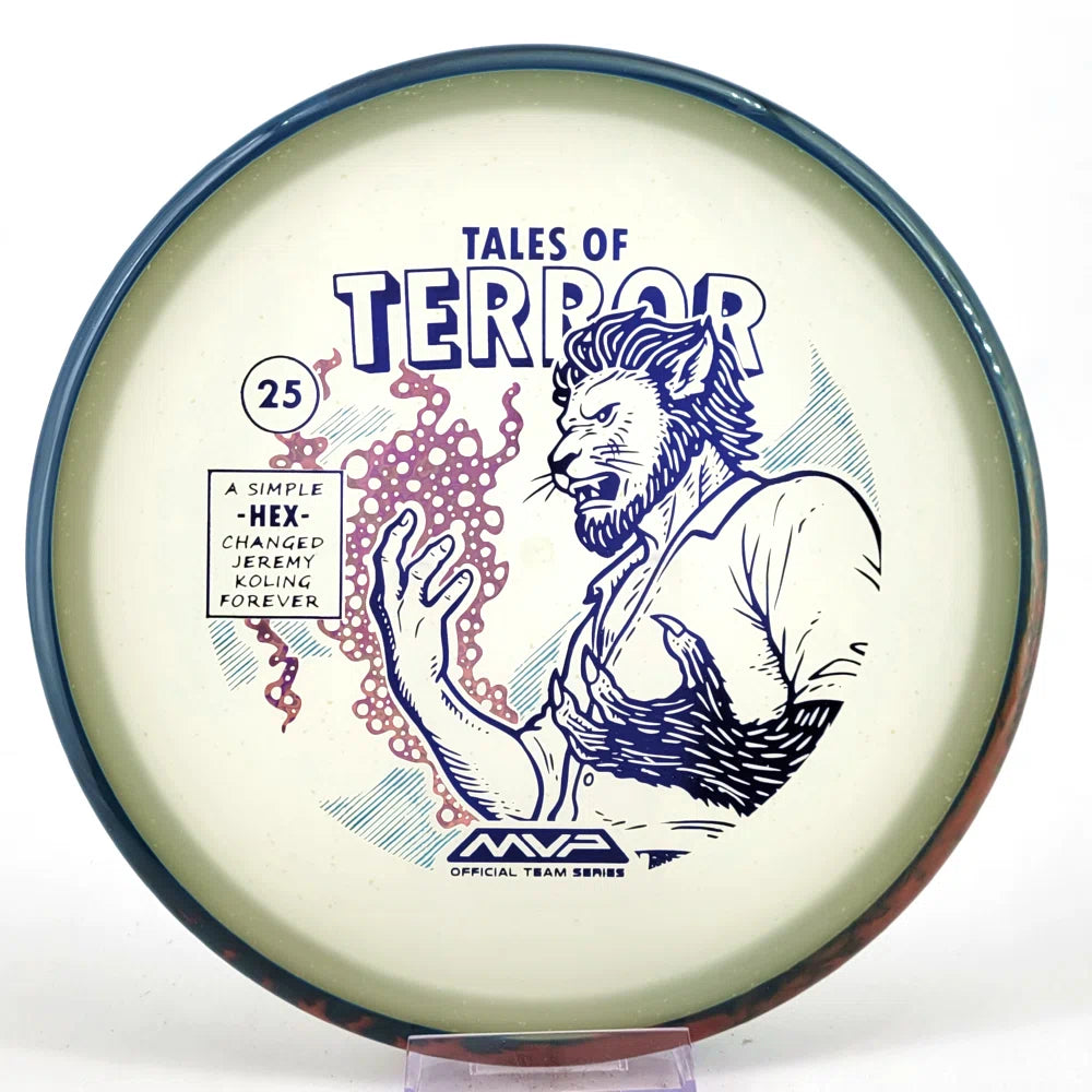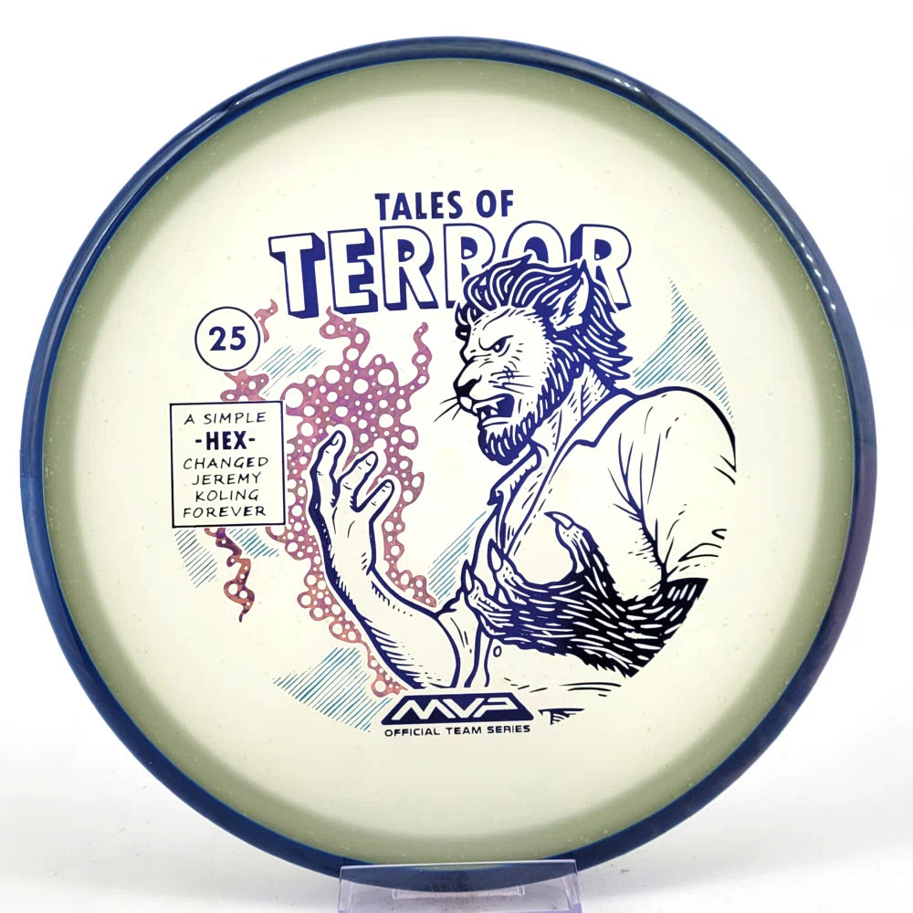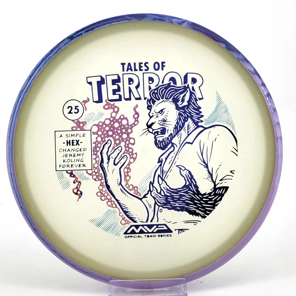 DoubleRam Design shows us the terrifying alternate origin of Jeremy Koling’s childhood nickname - Lionheart - on the new Particle Eclipse Hex! Made with our industry-leading Eclipse plastic, this new blend of glow with colorful particles inside gives the disc its own magical feel.