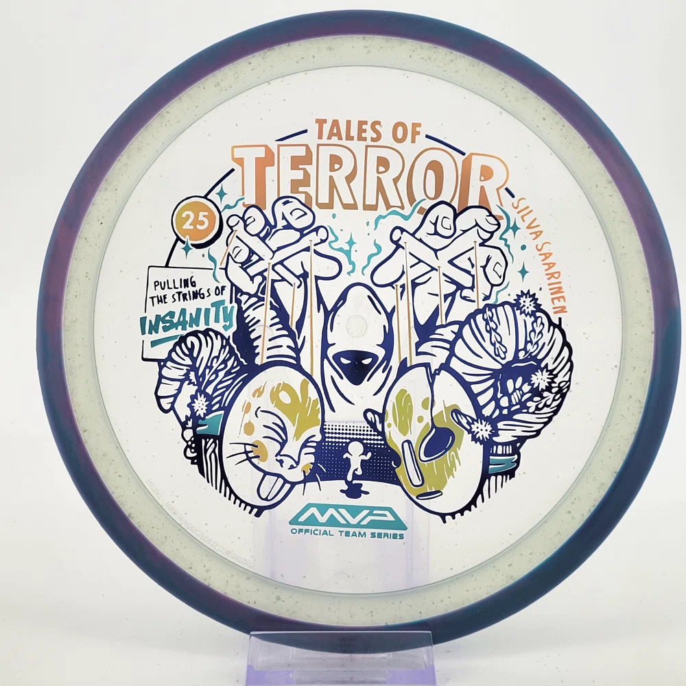 Beware the one pulling the strings during the Finnish Harvest Festival! Stamp newcomer Damian White unveils his first MVP stamp for this Halloween comic inspired design on the Particle Proton Insanity, a warning that some ornaments created for this event are a bit more ghoulish than they appear. The Insanity is a stable-understable driver that players will find easy to manipulate, with average power throws being remarkably straight with forward pushing fade, and higher power throws resulting in precise hyzer-flips, turnovers, and beautiful s-lines. Don’t let the course pull your strings - grab a Particle Proton Insanity today and prove who the true master is.
