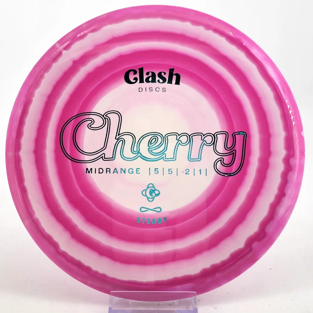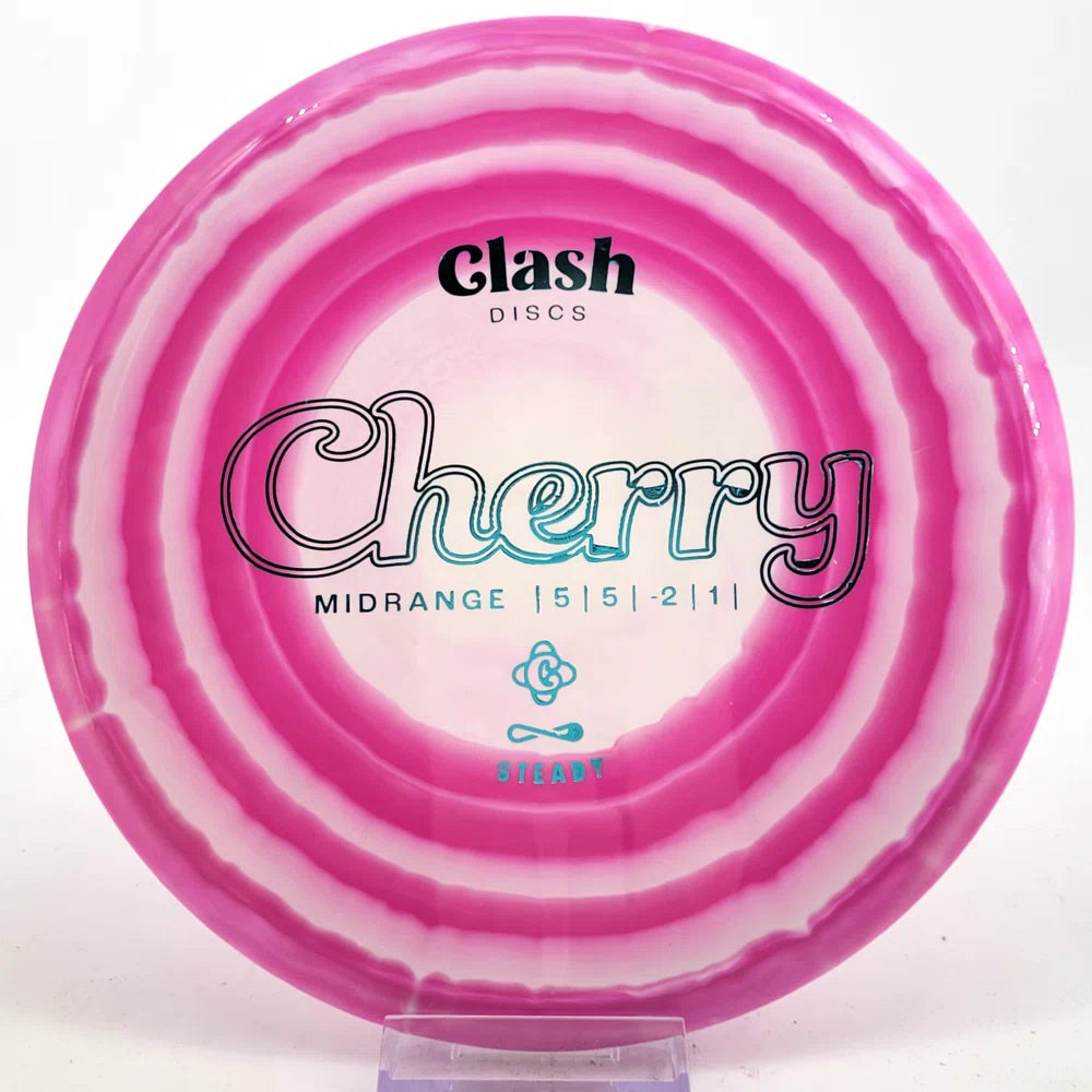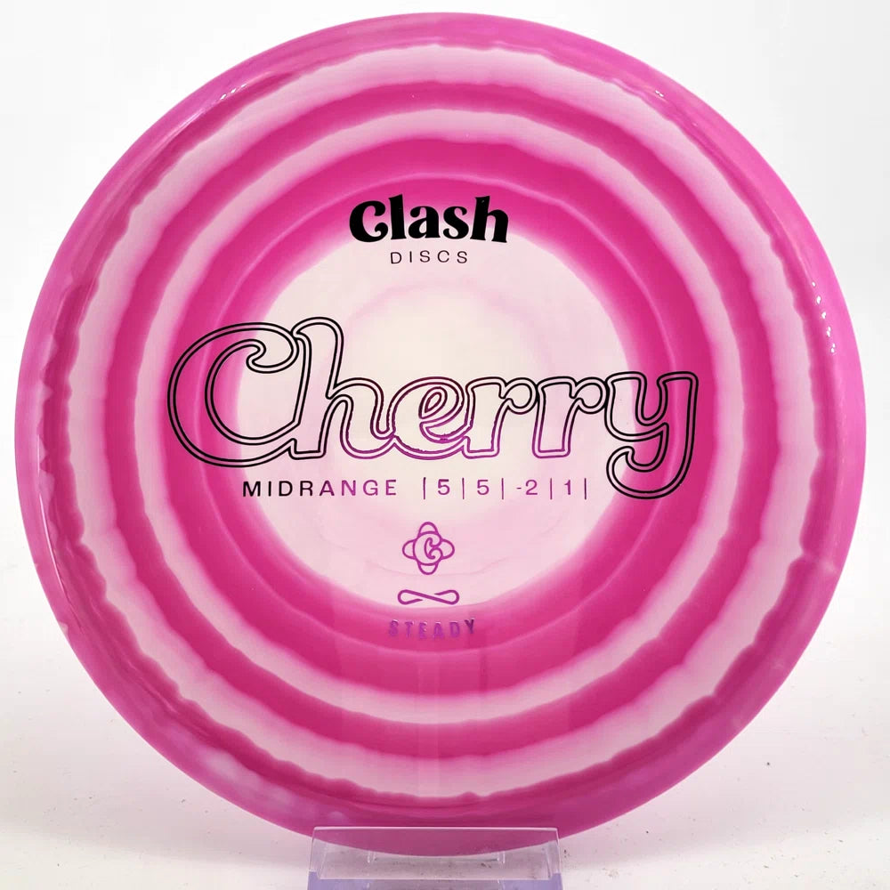 The Clash Discs Cherry is a straight to understable midrange disc with a controlled turn, offering precision and versatility for various shot shapes. Its gradual turnover is easy to manage, making it ideal for executing straight hyzer flips, pushing hyzers, and anhyzers with confidence.