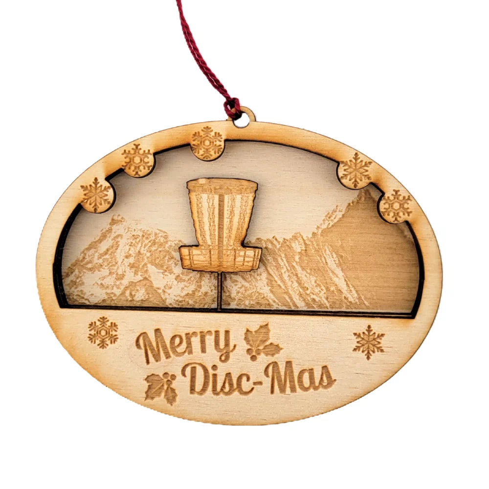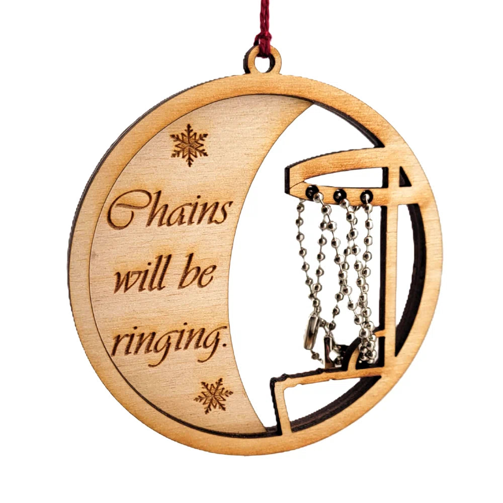 Puns and Sayings: Ornaments engraved with festive, sport-specific phrases like "Merry Disc-Mas" and "Chains will be ringing".
