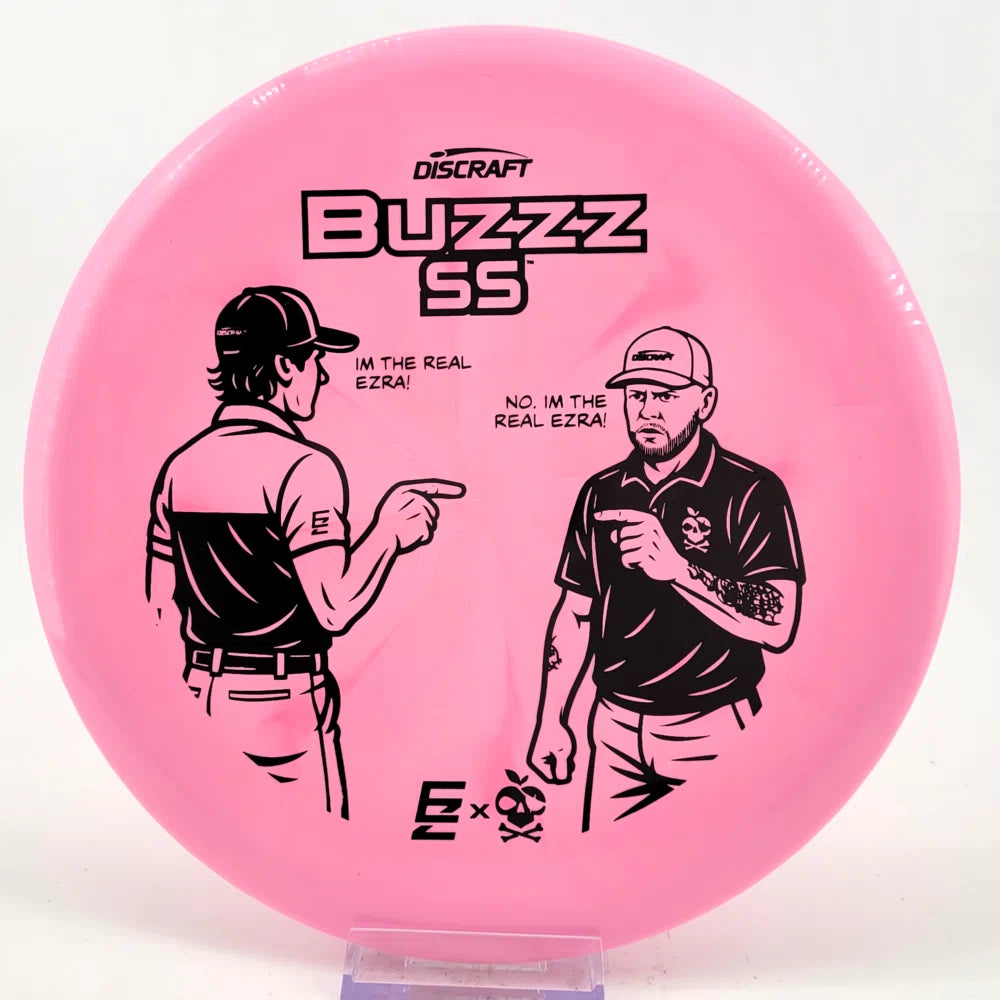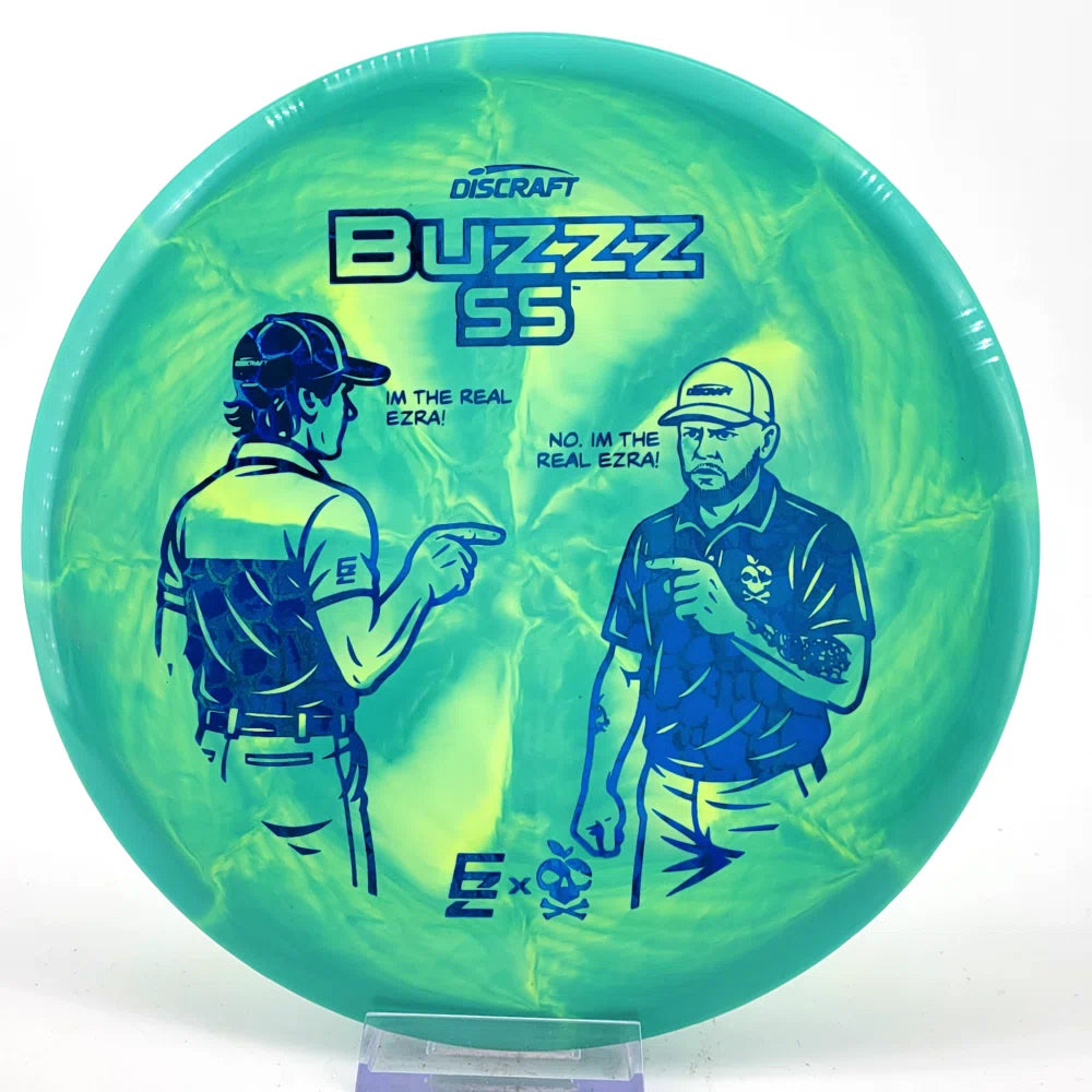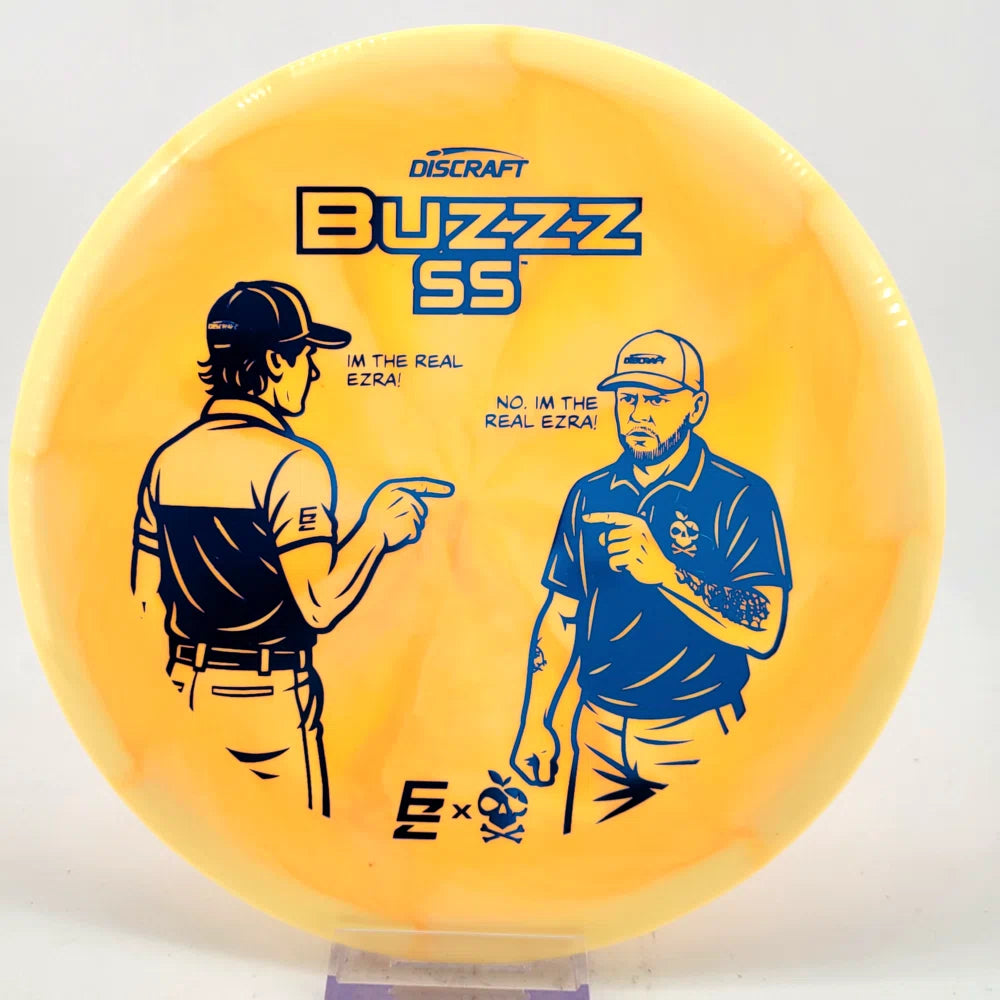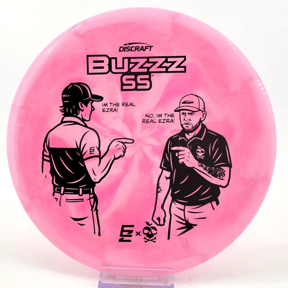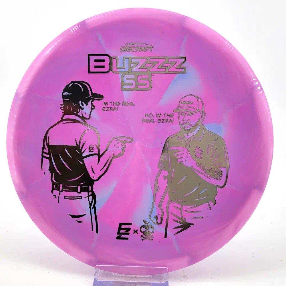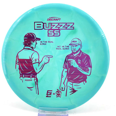 The Buzzz SS takes the classic Buzzz feel and adds buttery high-speed turn for dead-straight flights and gentle turnovers. In this Ezra Aderhold x Ezra Robinson collab, the playful “which Ezra is the real Ezra?” stamp leans into a lighthearted art to determine one question, who is the real Ezra? If you like a a midrange glides forever and holds the line you put it on, this will become a workhorse in your bag.