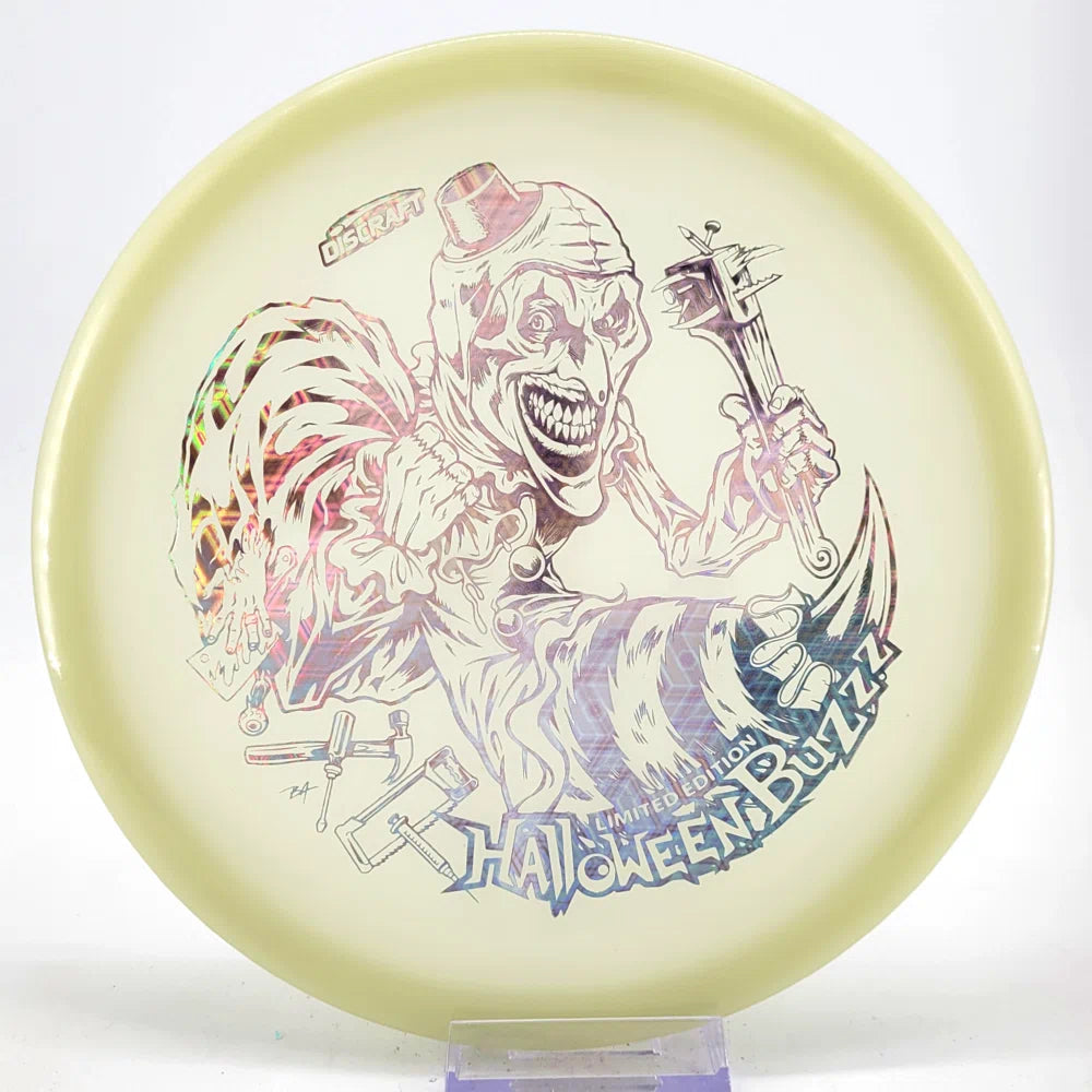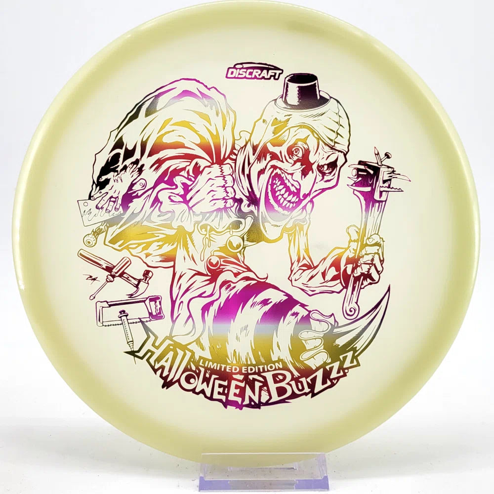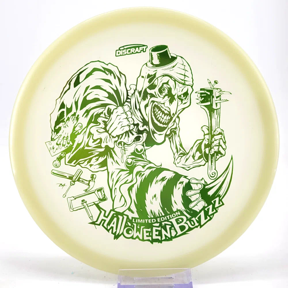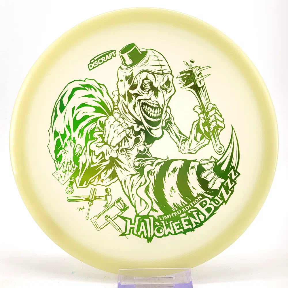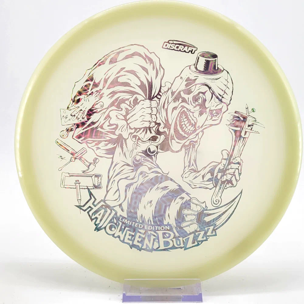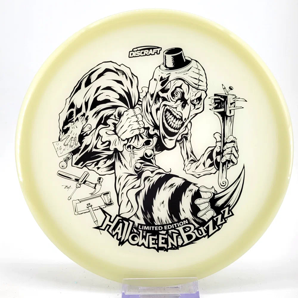 The Single-Foil Mega-Glo Halloween Buzzz turns darkness into its stage. Made from Discraft's popular Mega-Glo blend, this disc shines brighter and longer than any glow disc we’ve ever made. A minimalist single-foil stamp lets the unsettling clown artwork glow through the night—perfect for glow leagues or collectors seeking the most luminous Halloween Buzzz to date!