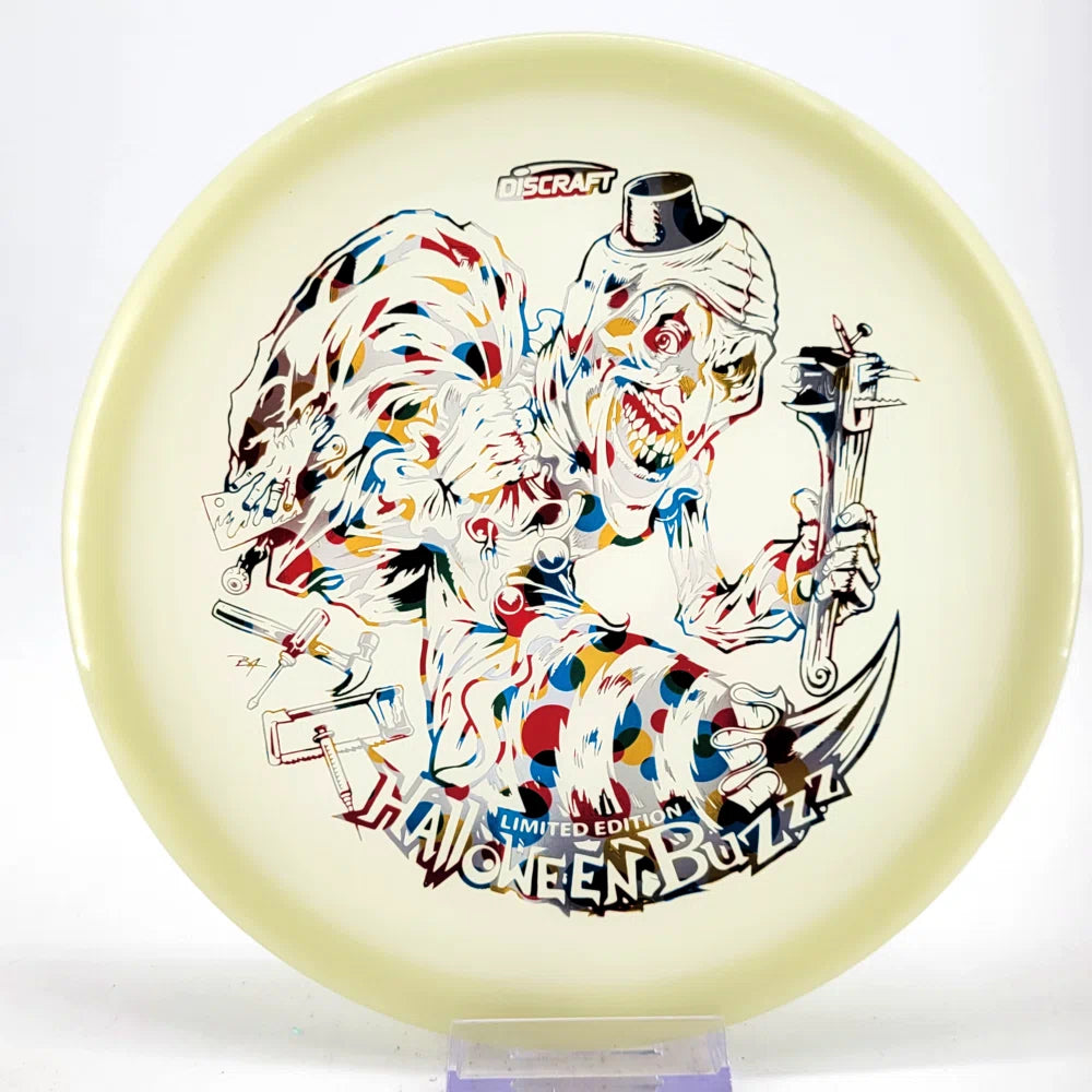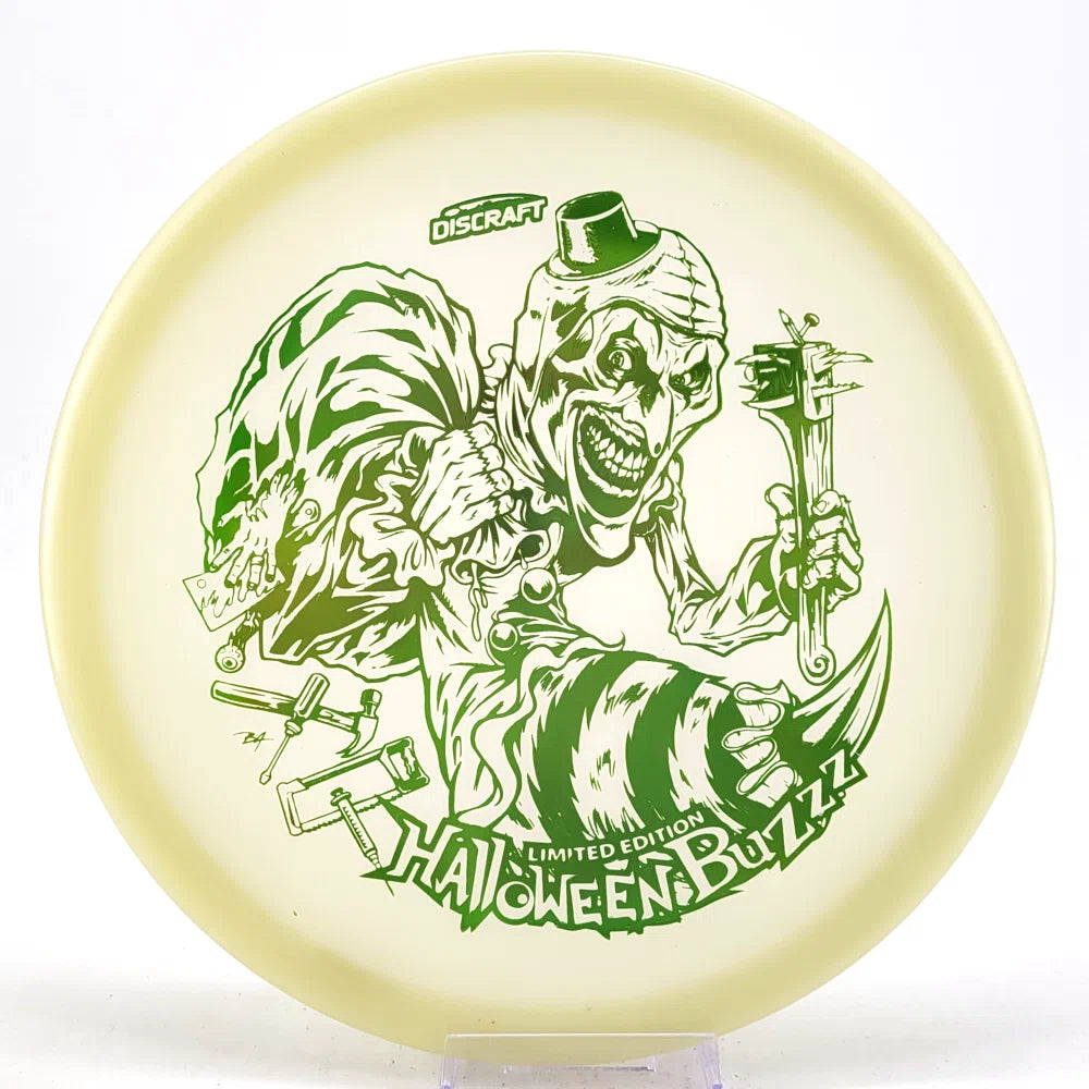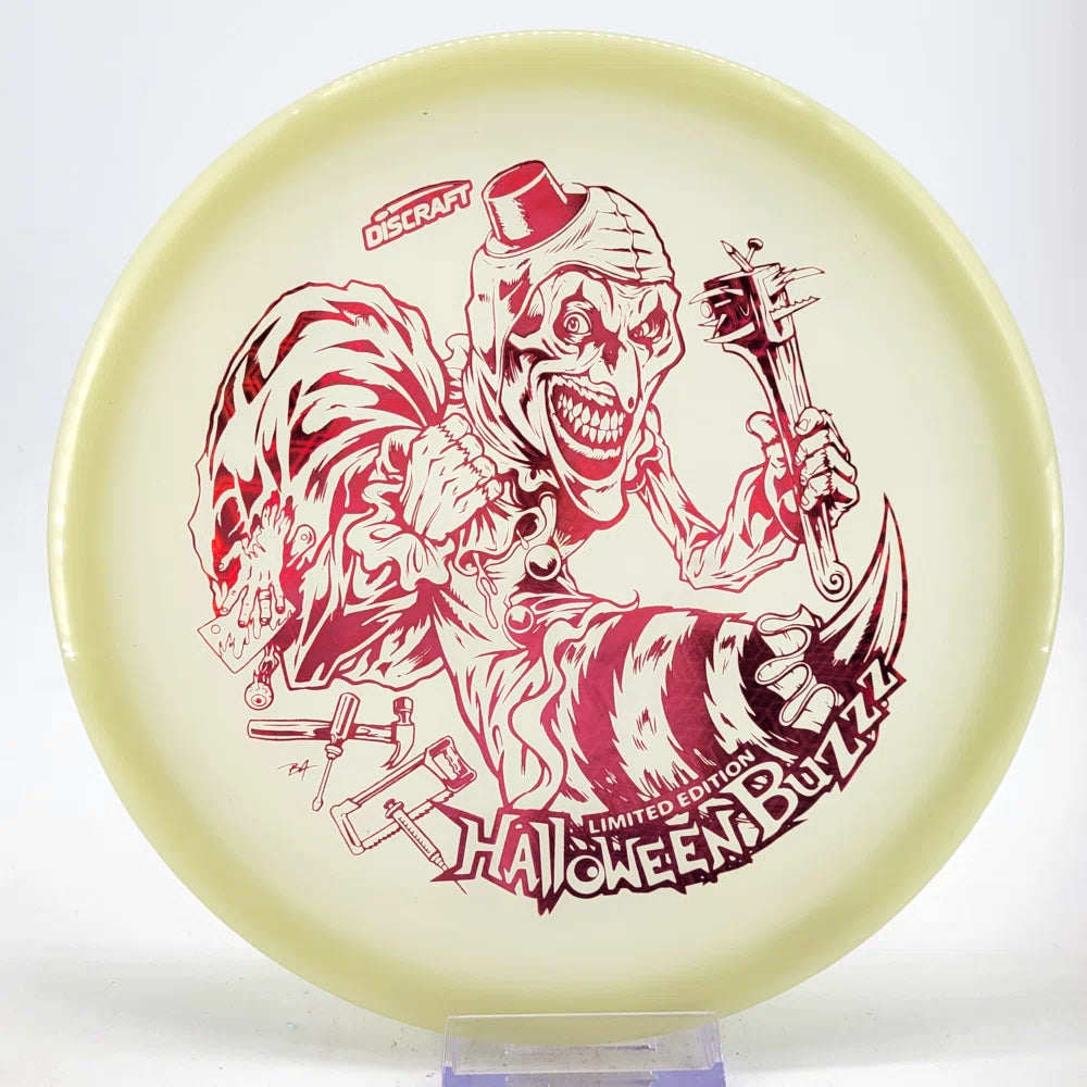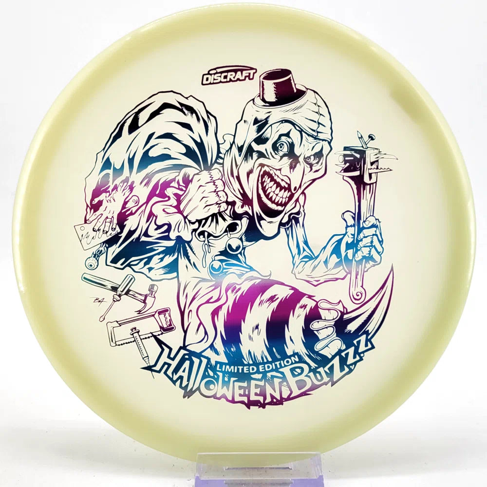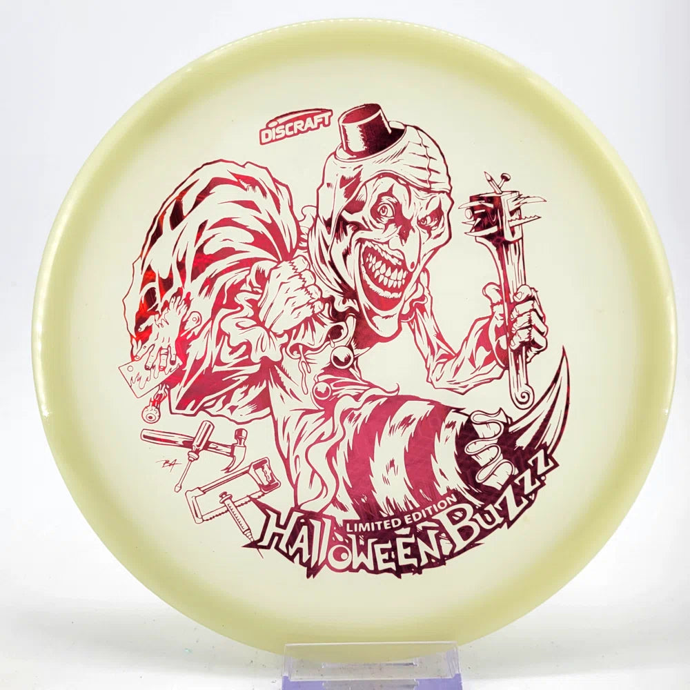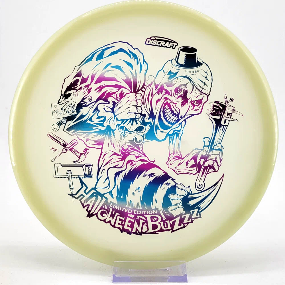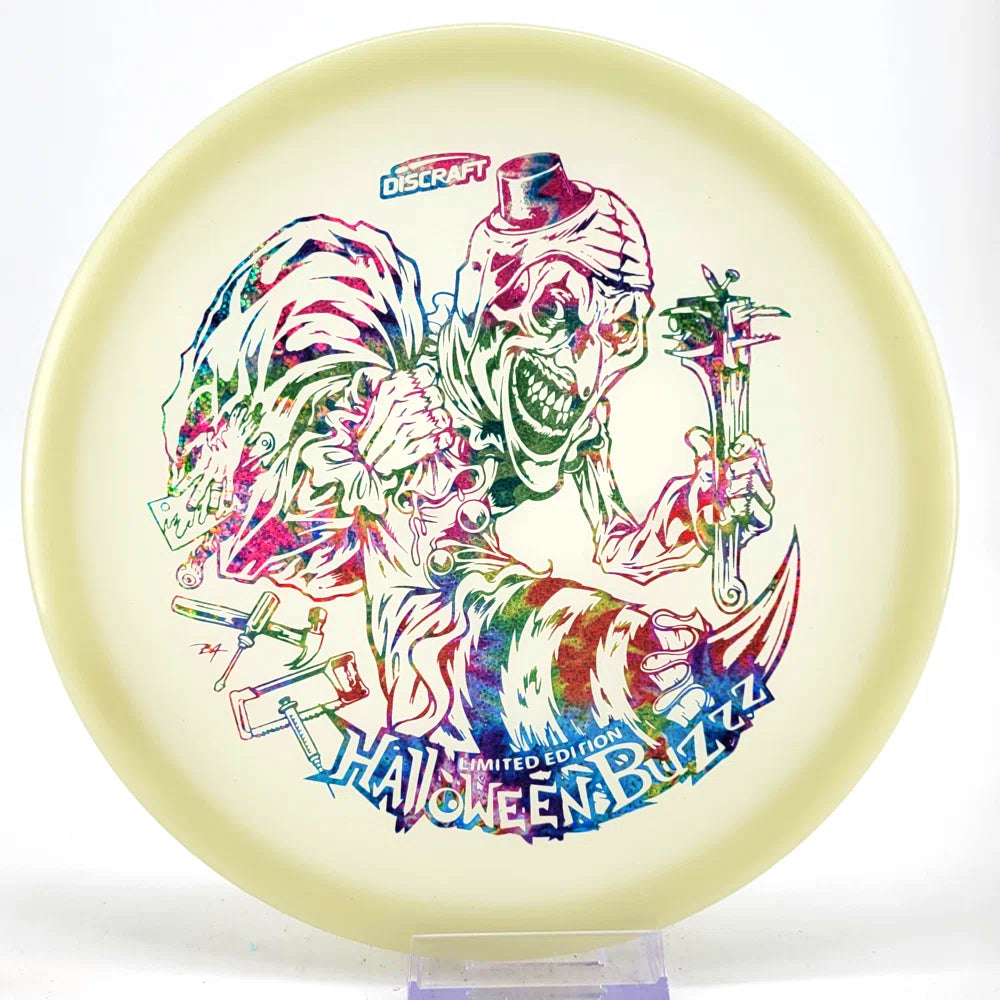 The Single-Foil Mega-Glo Halloween Buzzz turns darkness into its stage. Made from Discraft's popular Mega-Glo blend, this disc shines brighter and longer than any glow disc we’ve ever made. A minimalist single-foil stamp lets the unsettling clown artwork glow through the night—perfect for glow leagues or collectors seeking the most luminous Halloween Buzzz to date!