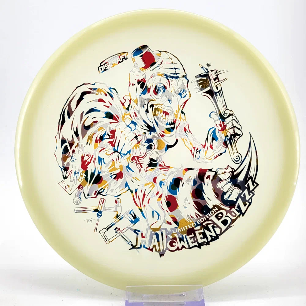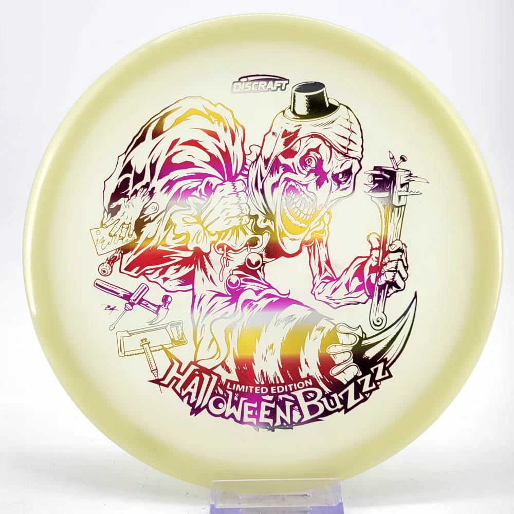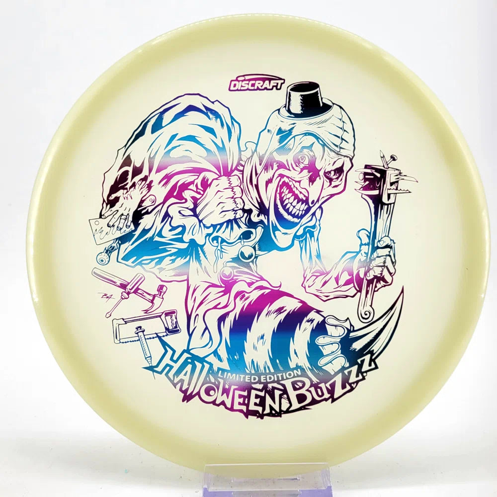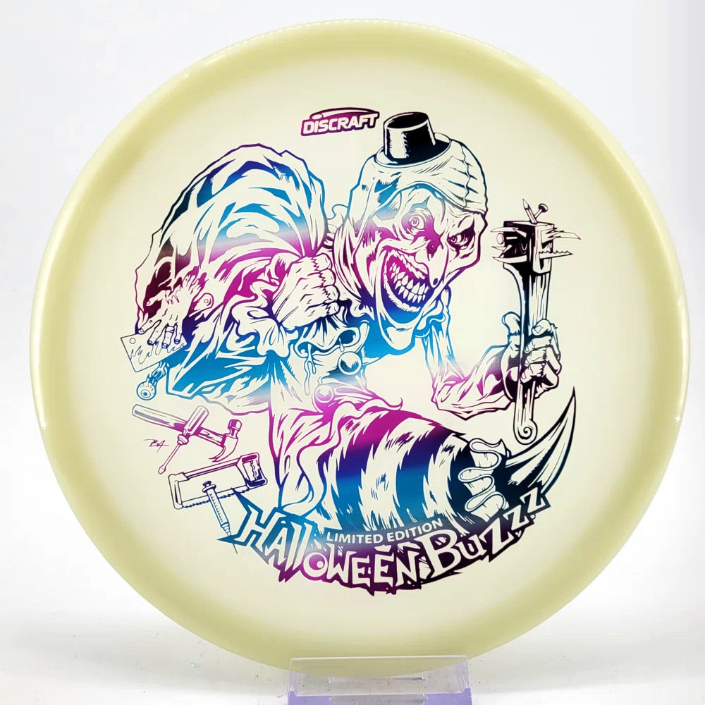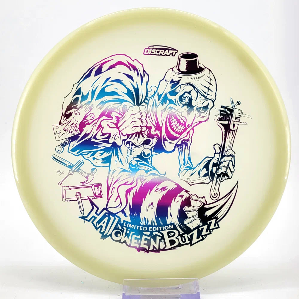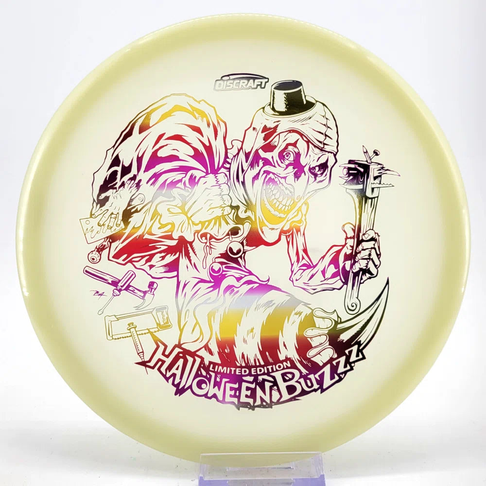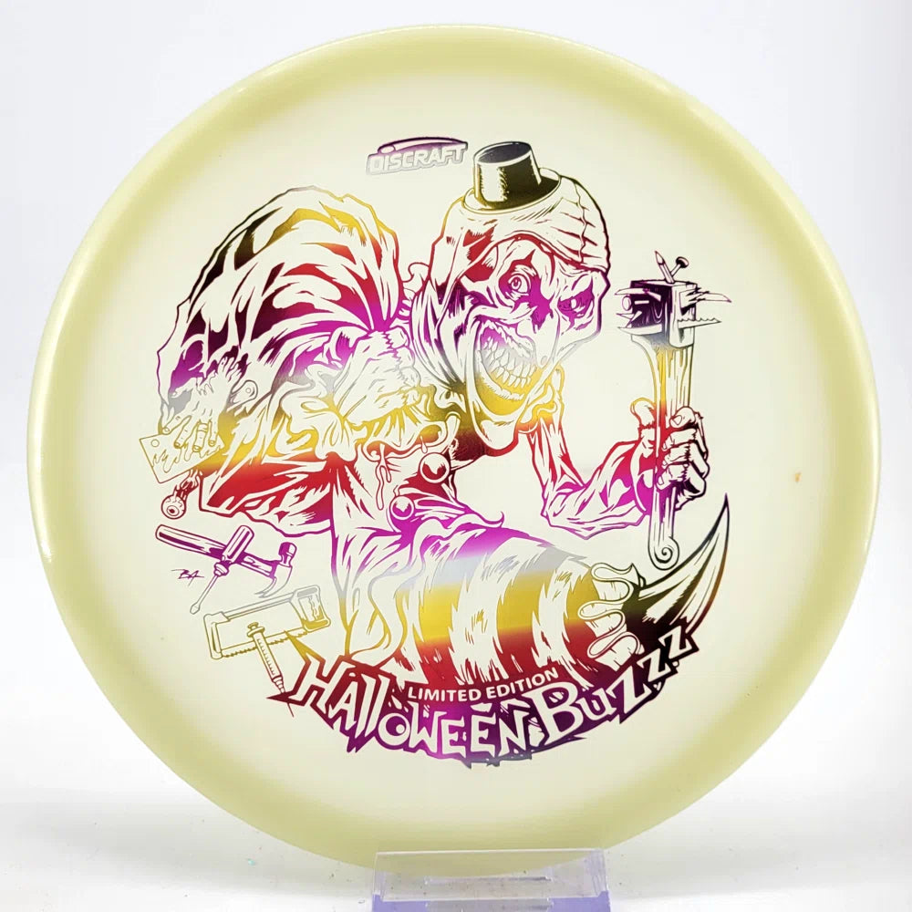 The Single-Foil Mega-Glo Halloween Buzzz turns darkness into its stage. Made from Discraft's popular Mega-Glo blend, this disc shines brighter and longer than any glow disc we’ve ever made. A minimalist single-foil stamp lets the unsettling clown artwork glow through the night—perfect for glow leagues or collectors seeking the most luminous Halloween Buzzz to date!