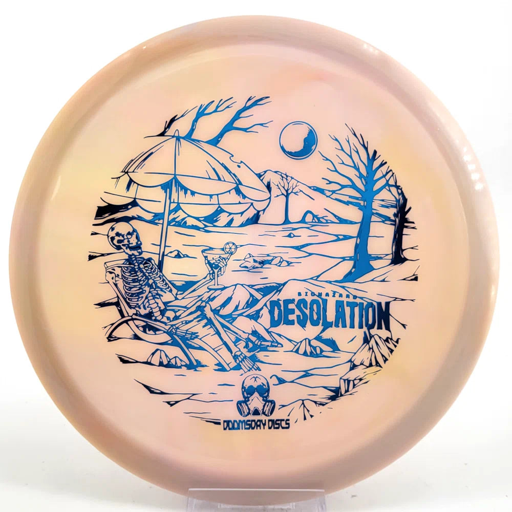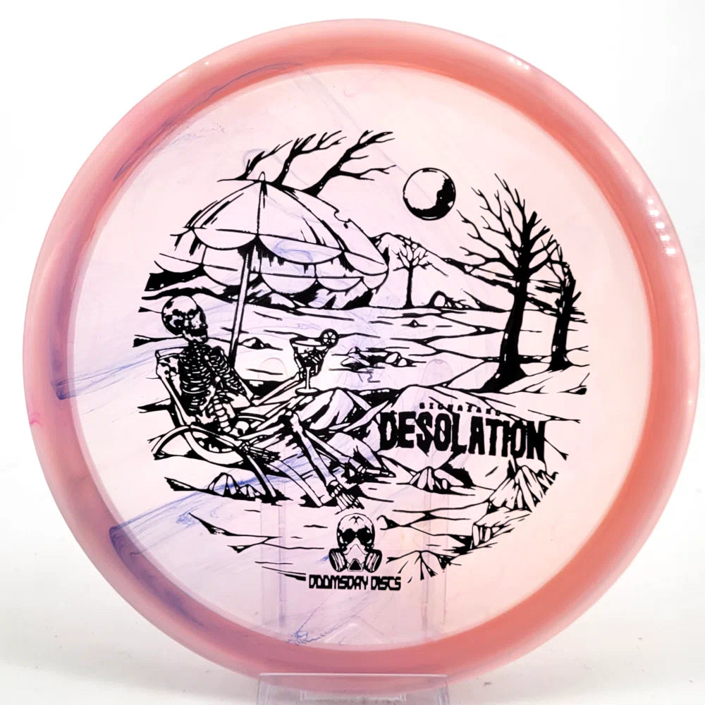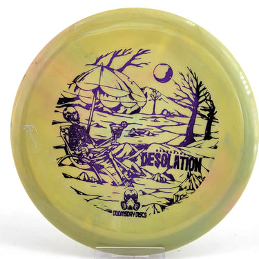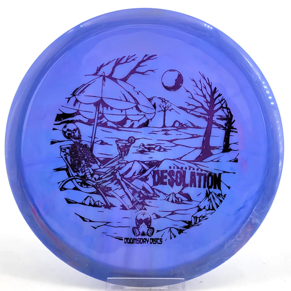 The Desolation, from Doomsday Discs, is an all-purpose, overstable midrange. It has a straight flight that finishes with a moderate, consistent fade. It has smoothed-rim edges and a semi-deep rim to make it very comfortable for throwing and a go-to for seasoned players. It is part of the Catastrophic Line, and made in the USA for high performance that will last to the end of the world (which may come sooner rather than later).