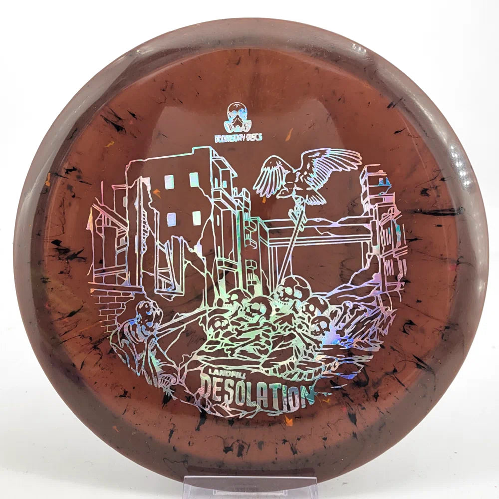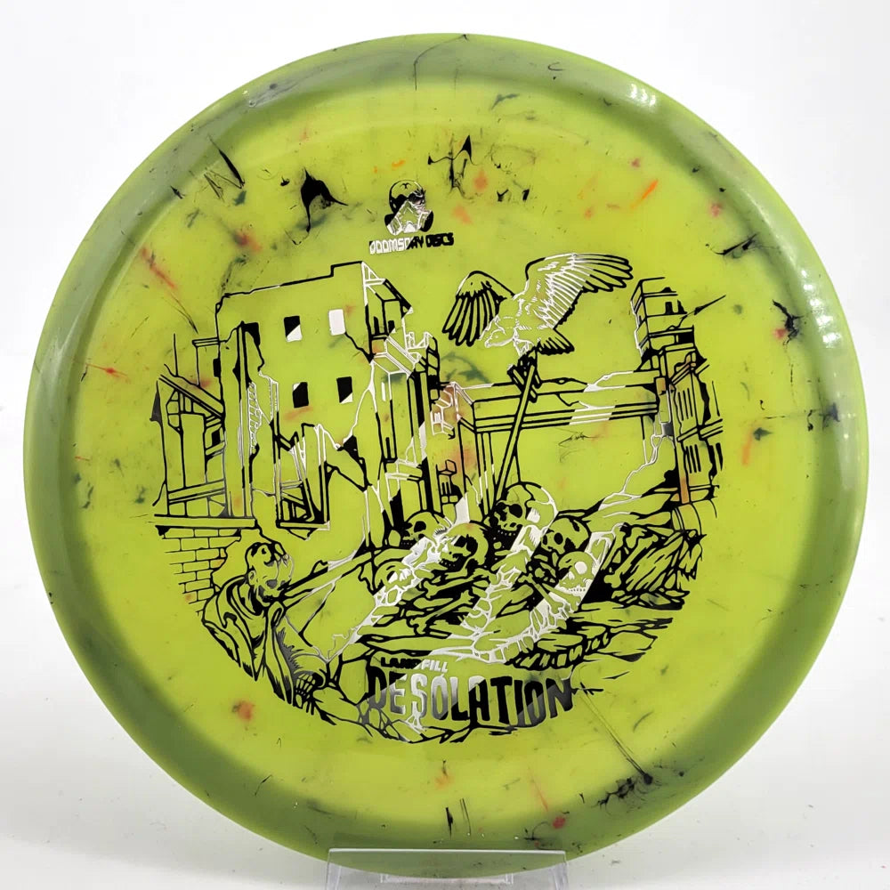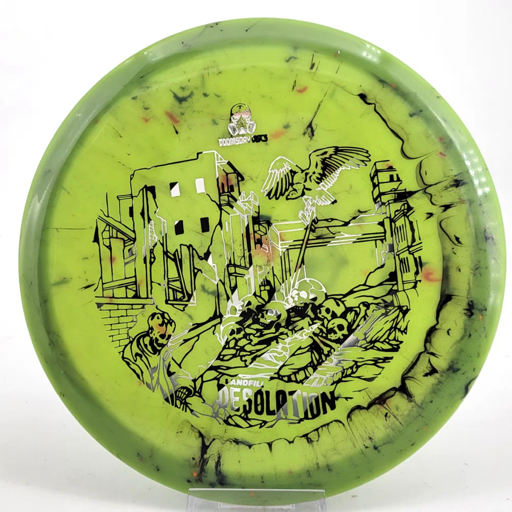 About the Plastic: Landfill plastic from Doomsday Discs is a recycled blend using the shredded remains of other premium discs to create a semi-firm, semi-flexible disc riddled with imperfect colorations and slight flaws. These could be called X-Outs or Factory 2nds, but they're actually recycled and thus made from X-Outs. They're priced cheaper as a good, affordable option for throwing. It's not like recycling will save the world from ultimate destruction, but it can sure make our stay on the planet more pleasant while we're still here.