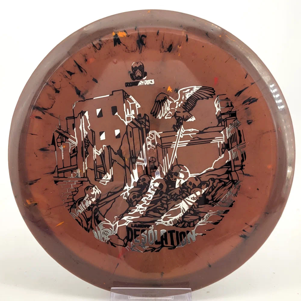 The Desolation, from Doomsday Discs, is an all-purpose, overstable midrange. It has a straight flight that finishes with a moderate, consistent fade. It has smoothed-rim edges and a semi-deep rim to make it very comfortable for throwing and a go-to for seasoned players. It is part of the Catastrophic Line, and made in the USA for high performance that will last to the end of the world (which may come sooner rather than later).
