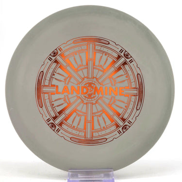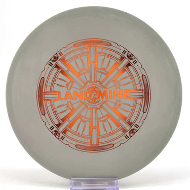 This is the new Land Mine putt-and-approach disc in the Munitions Line of discs. It’s primarily designed for approaches and holds both forehand and backhand lines very well before it drops suddenly to the ground. It has a unique, somewhat experimental rim shape that recalls other putters with a “boxy” rim shape. The Land Mine will stand out when you pull it out of your bag. It will definitely extract unpredictable comments from your card mates.