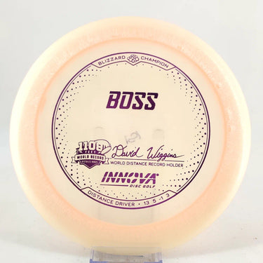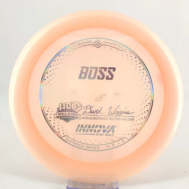 The Boss is our first Speed 13 Distance Driver. This is a fast stable driver that can handle full power throws and moderate headwinds. Advanced players and sidearm throwers will appreciate the dependable stability. The Boss has a slight high speed turn to help maximize distance with a predictable fade. Not recommended for players who throw less than 300 feet. This is the disc that was used to set the current World Distance Record at 1108 ft!