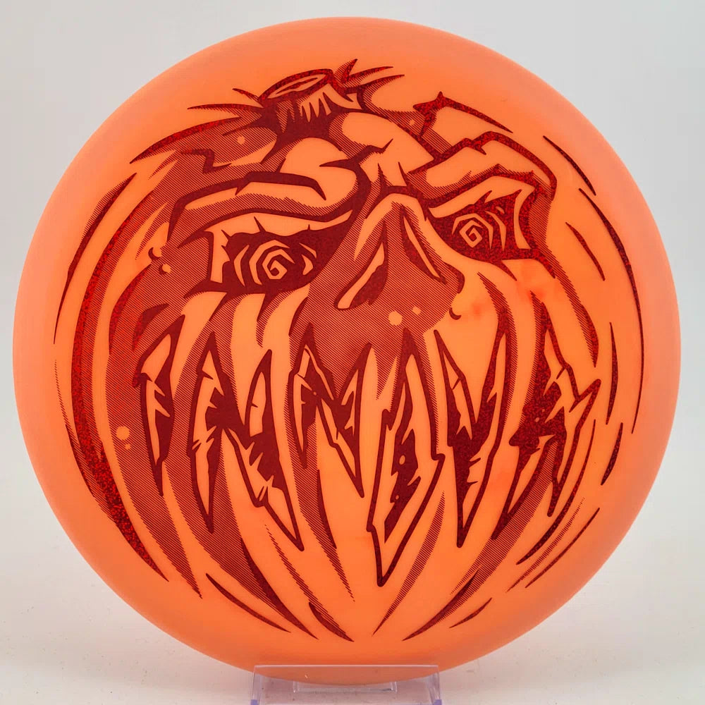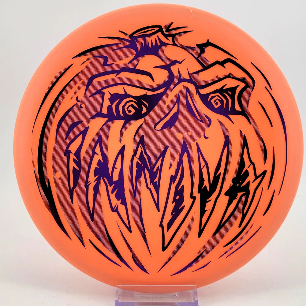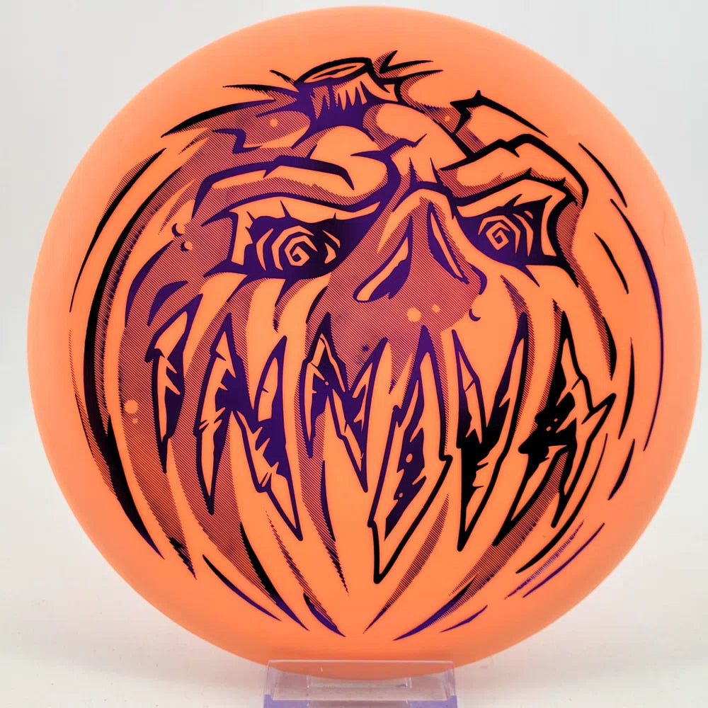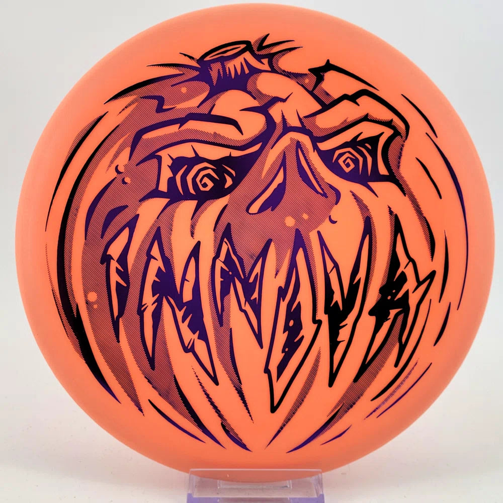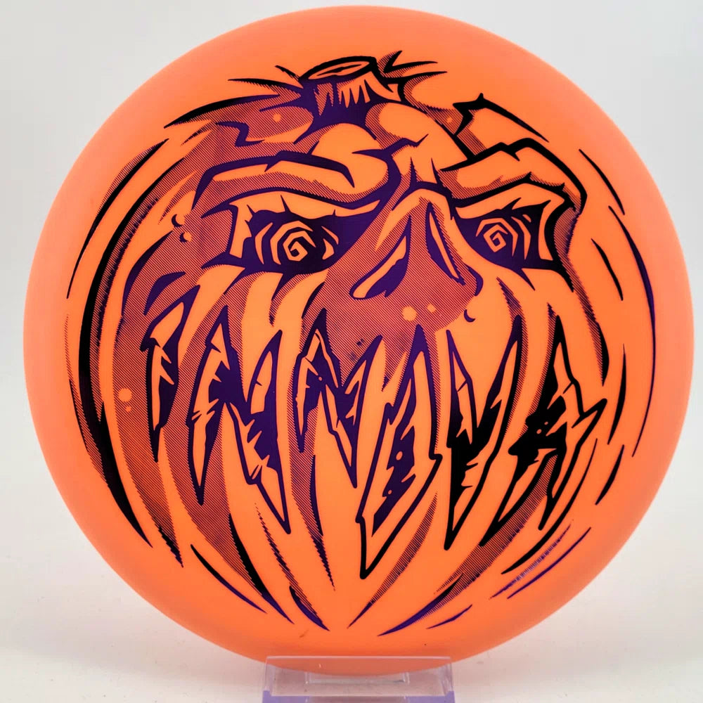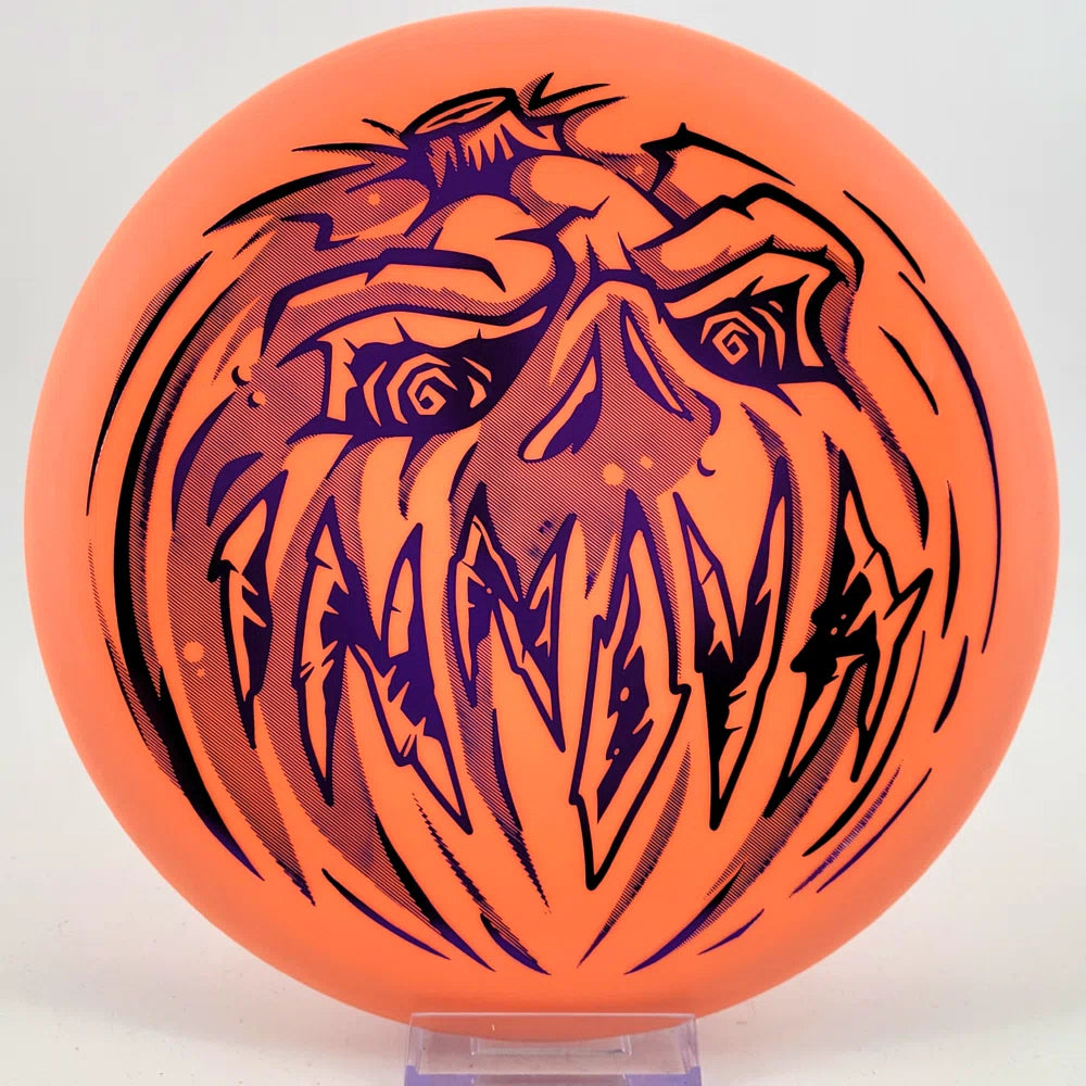 A fiendish grin is the centerpiece of the XXL hotstamp for this year's Innova Pumpkin disc—a tradition now in its 29th season. Built for the dark, the Proto Glow Nexus Aviar is easy to see and keeps its grip when the temps drop and other plastics start to slip.