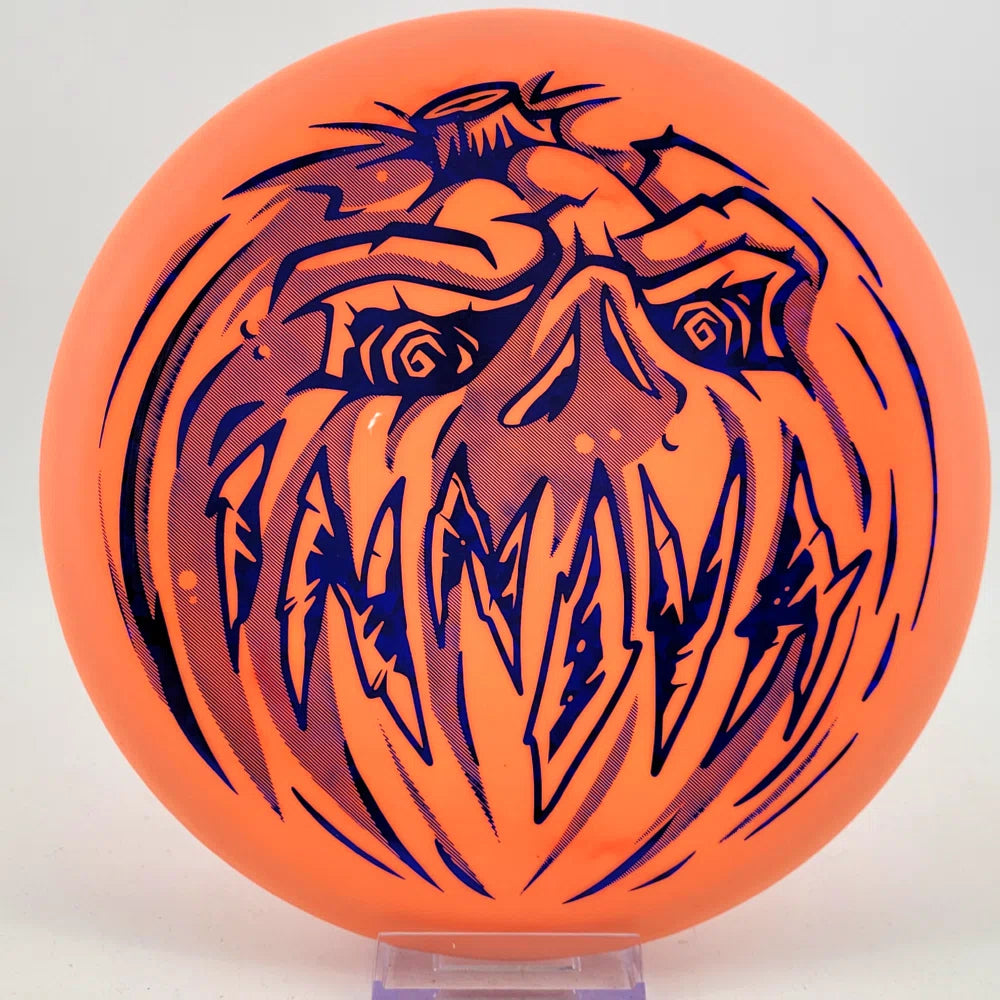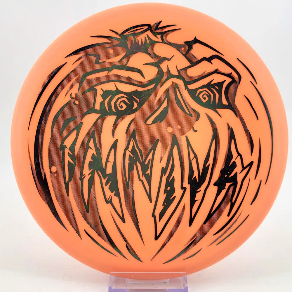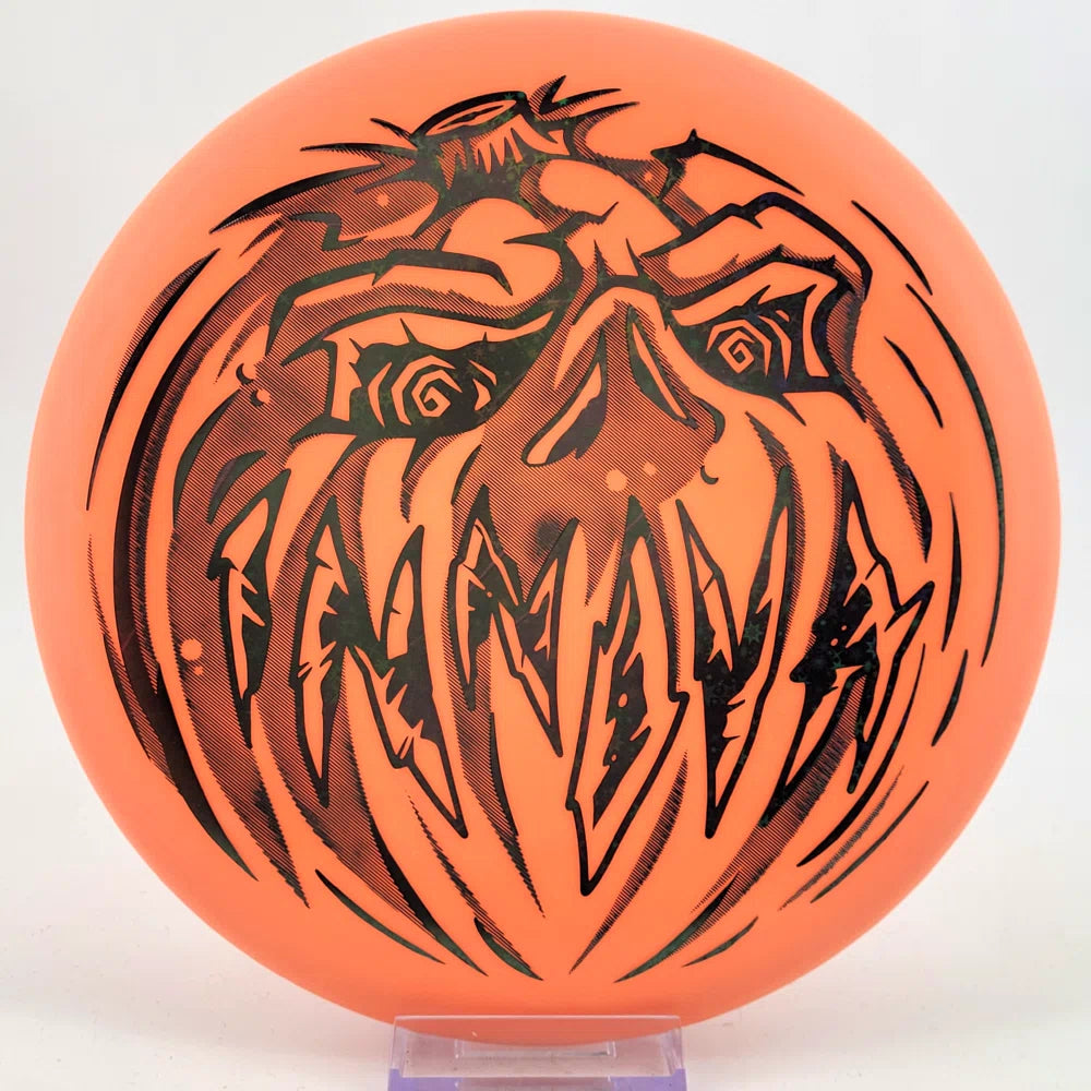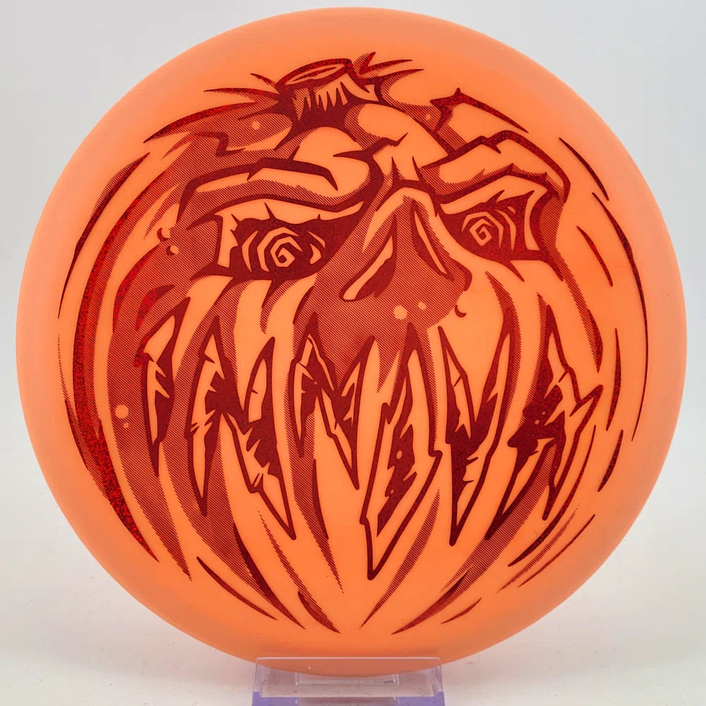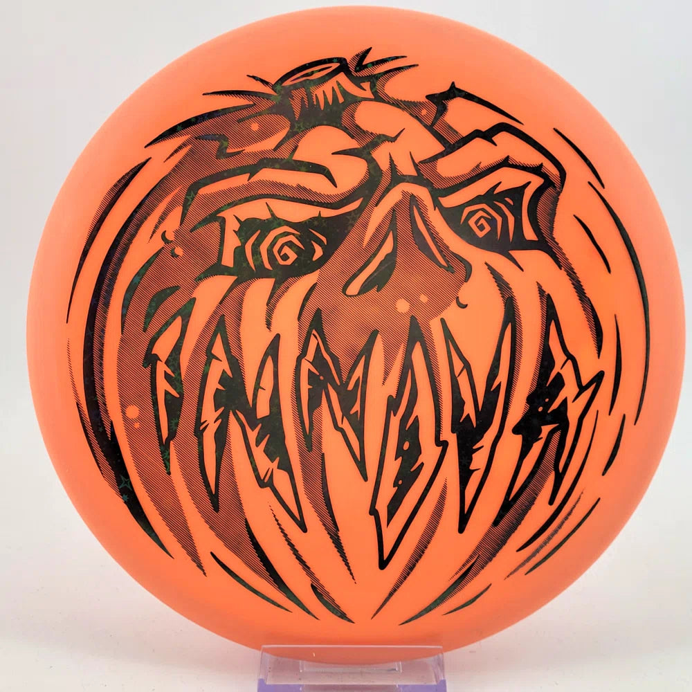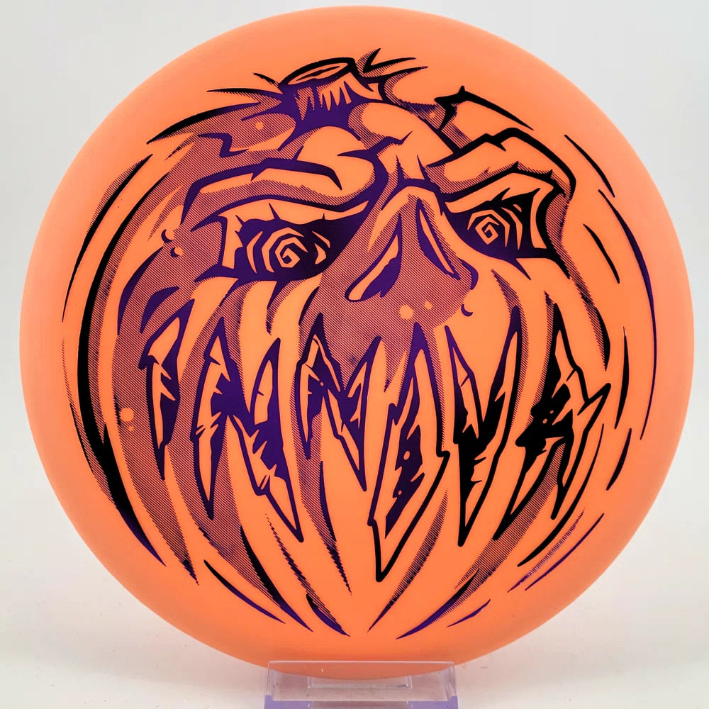A fiendish grin is the centerpiece of the XXL hotstamp for this year's Innova Pumpkin disc—a tradition now in its 29th season. Built for the dark, the Proto Glow Nexus Aviar is easy to see and keeps its grip when the temps drop and other plastics start to slip.
