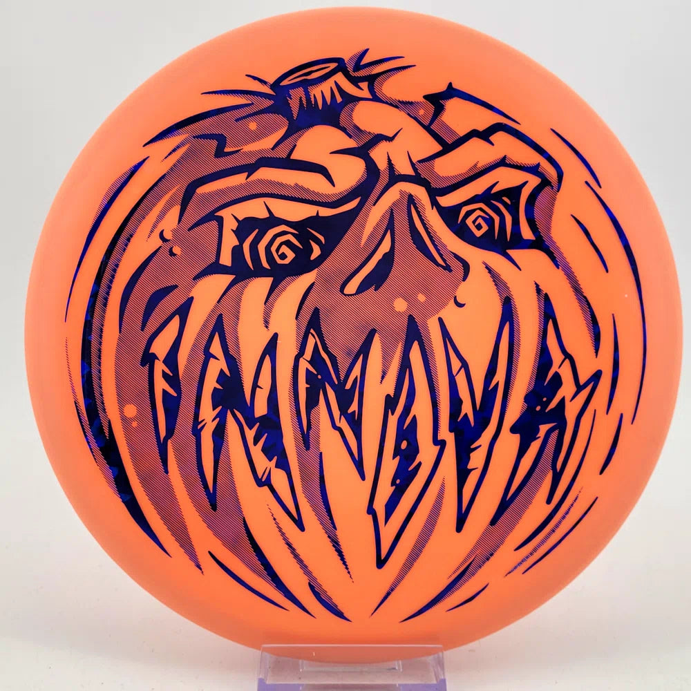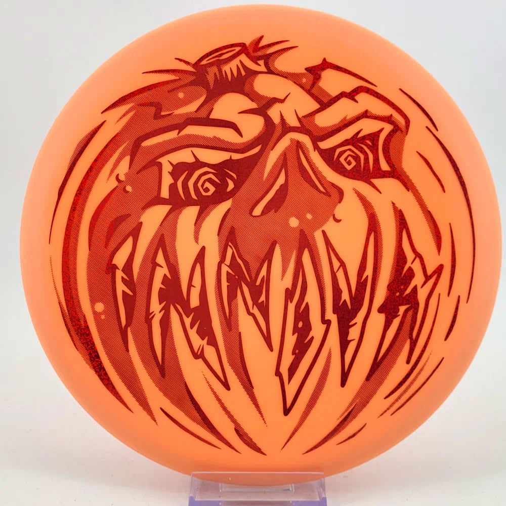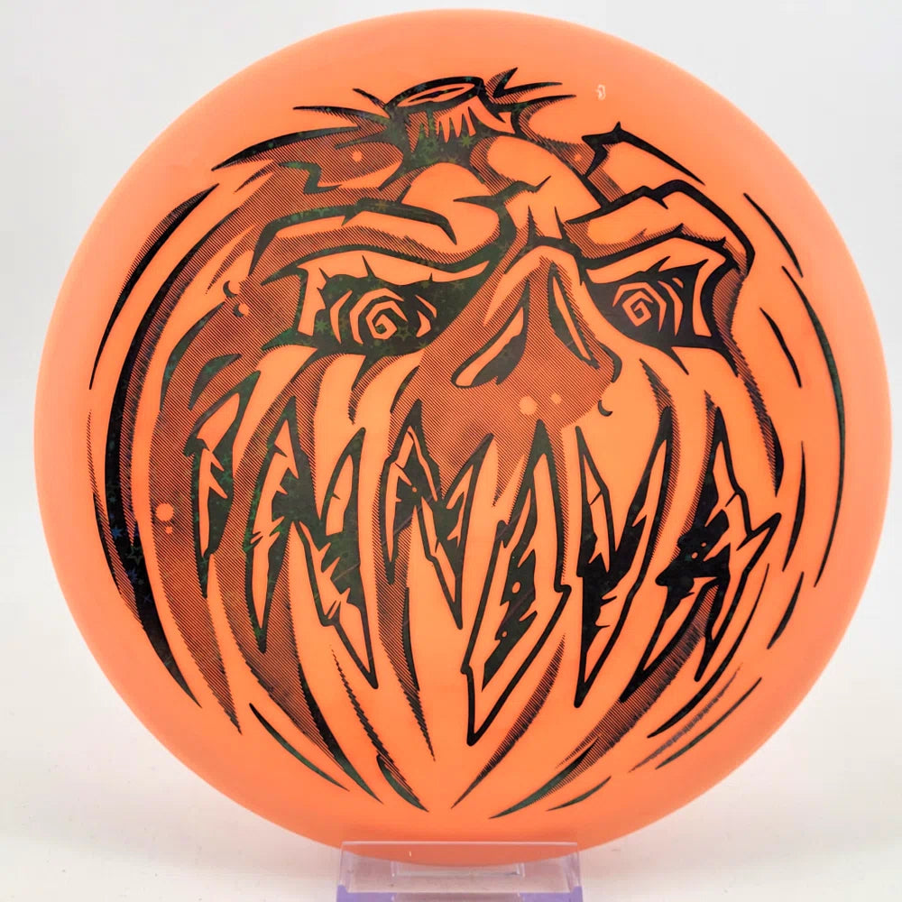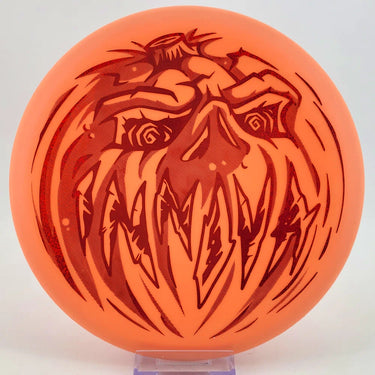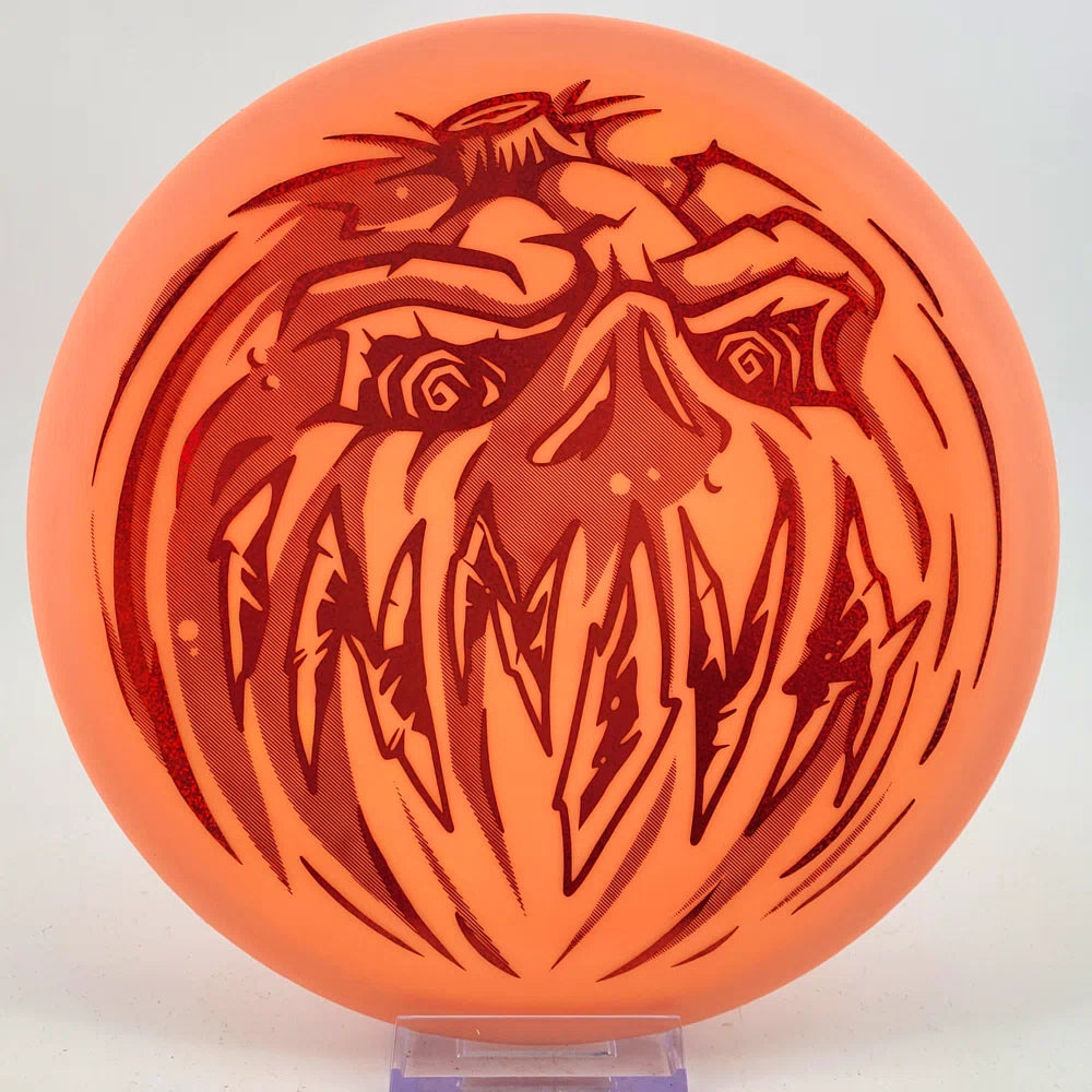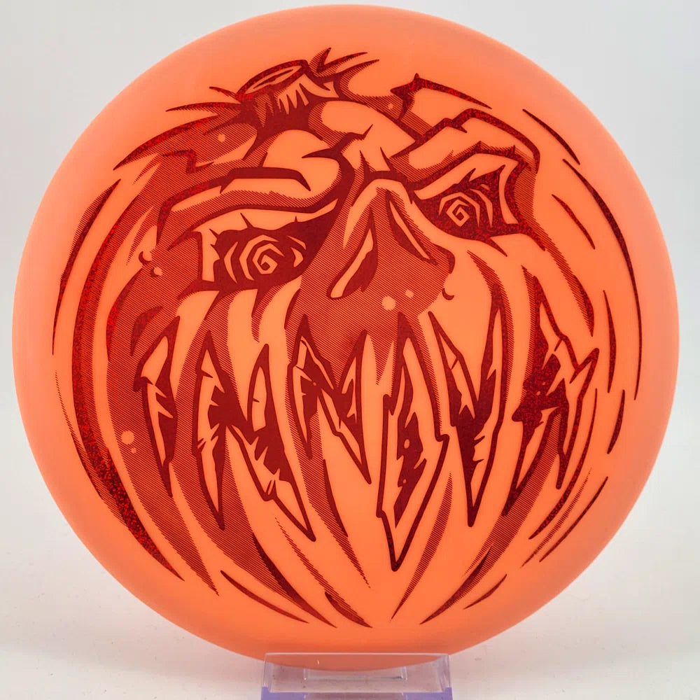 A fiendish grin is the centerpiece of the XXL hotstamp for this year's Innova Pumpkin disc—a tradition now in its 29th season. Built for the dark, the Proto Glow Nexus Aviar is easy to see and keeps its grip when the temps drop and other plastics start to slip.