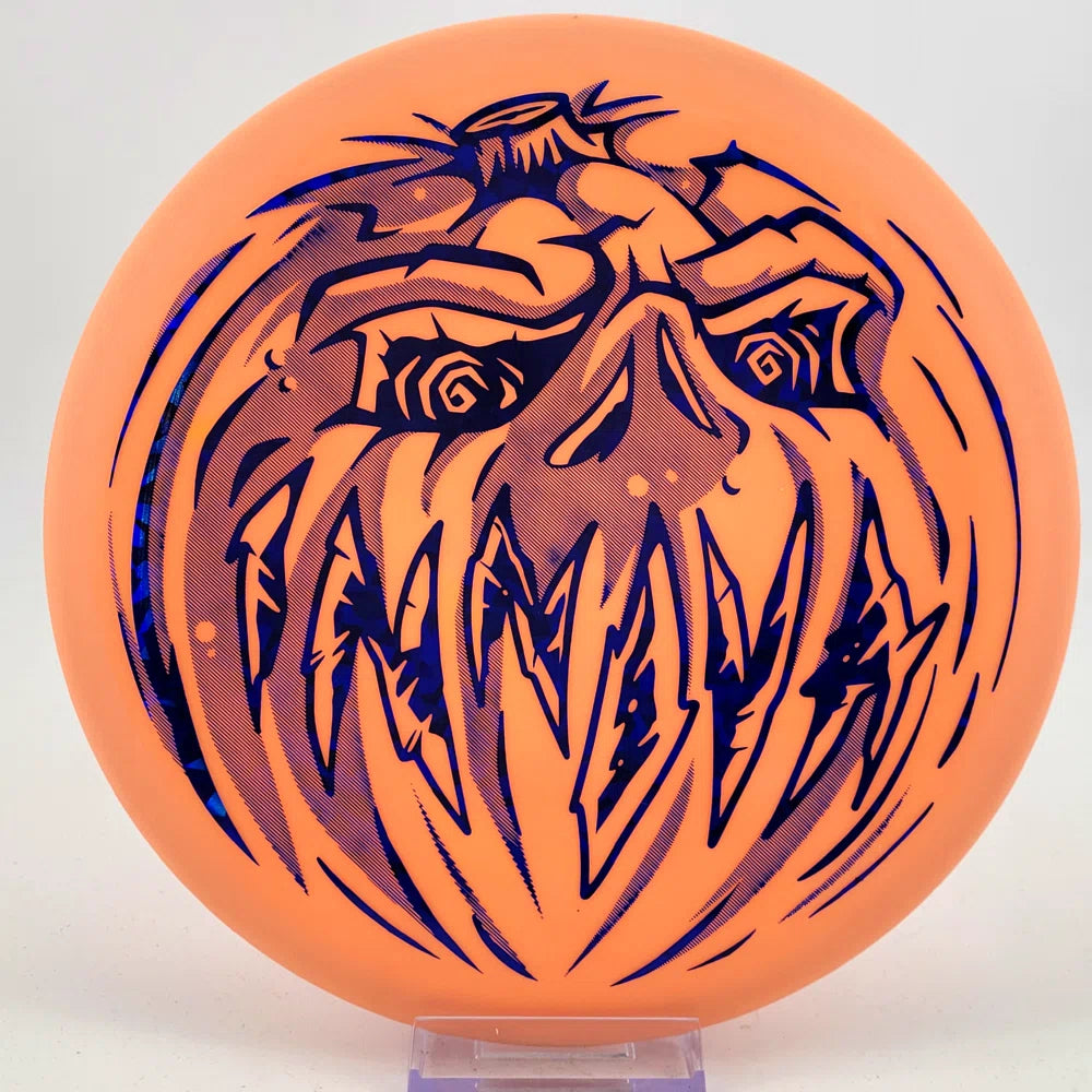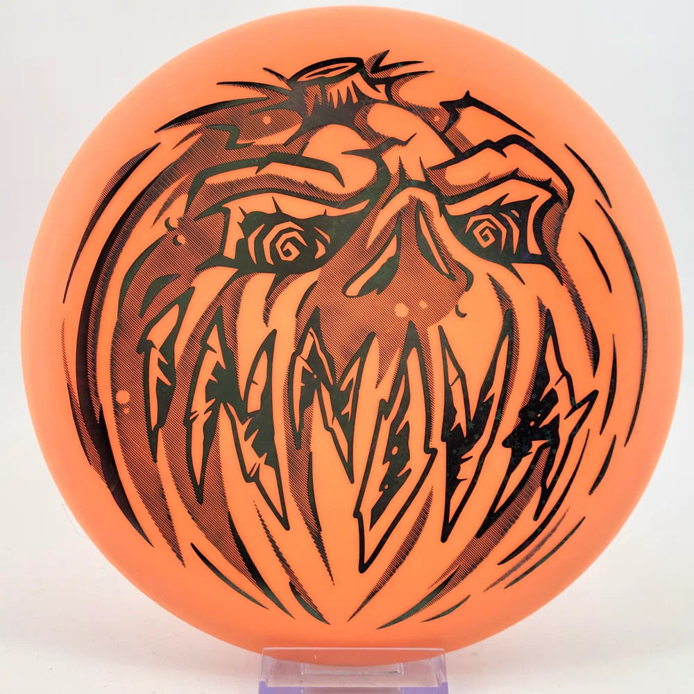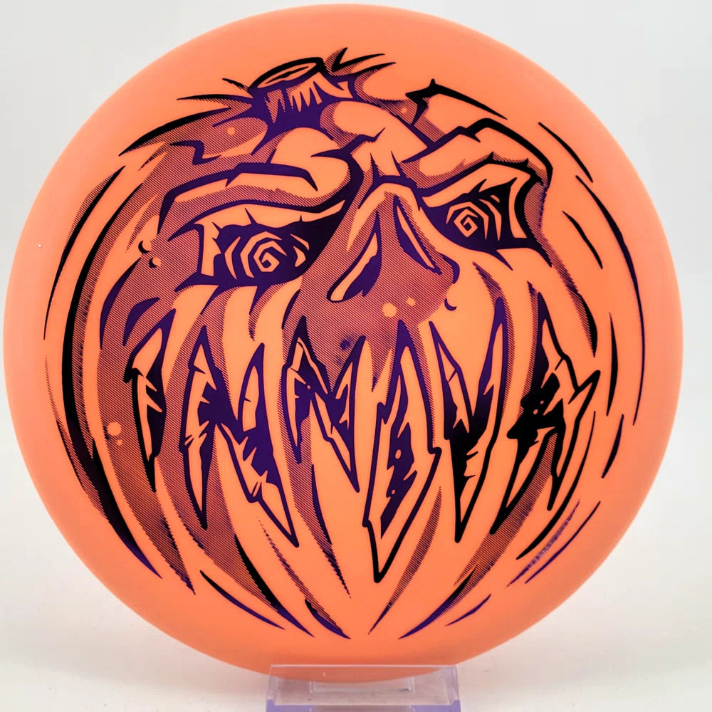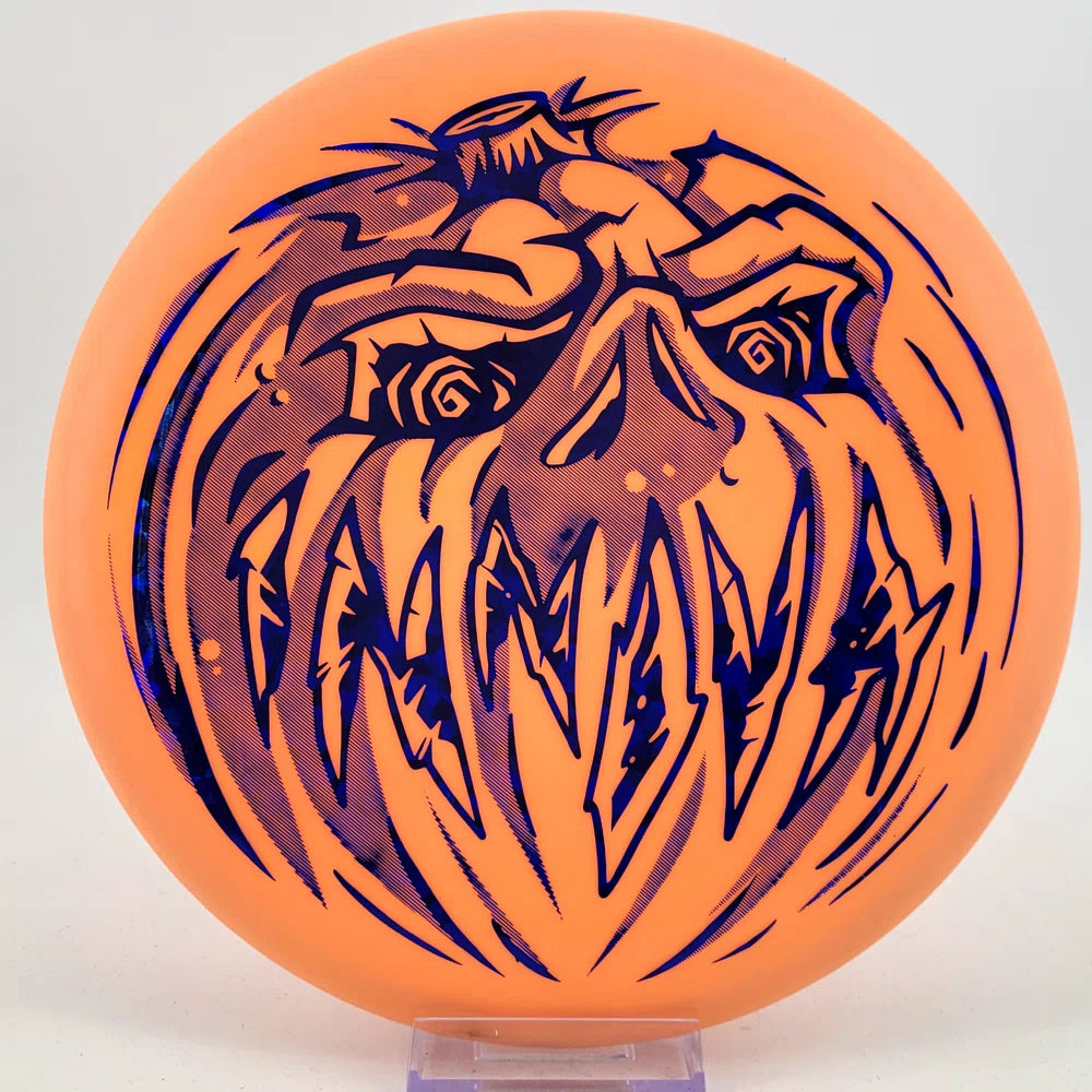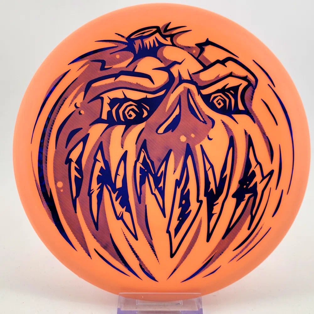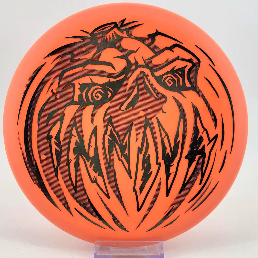 A fiendish grin is the centerpiece of the XXL hotstamp for this year's Innova Pumpkin disc—a tradition now in its 29th season. Built for the dark, the Proto Glow Nexus Aviar is easy to see and keeps its grip when the temps drop and other plastics start to slip.