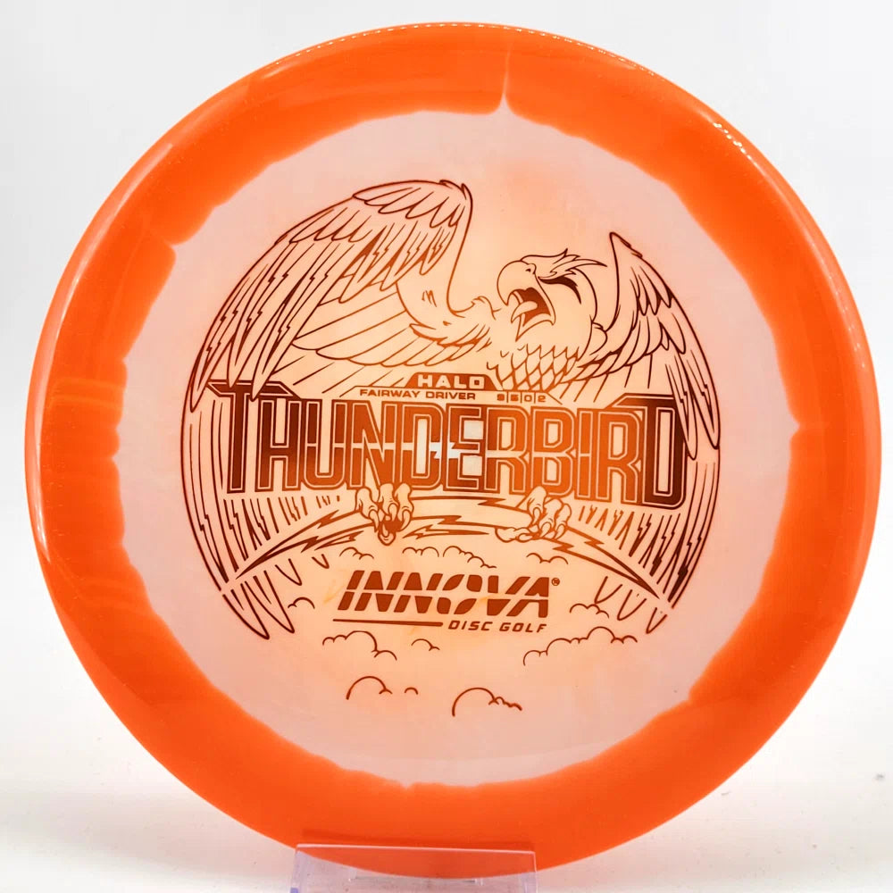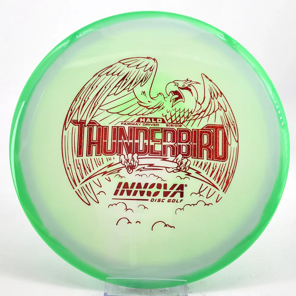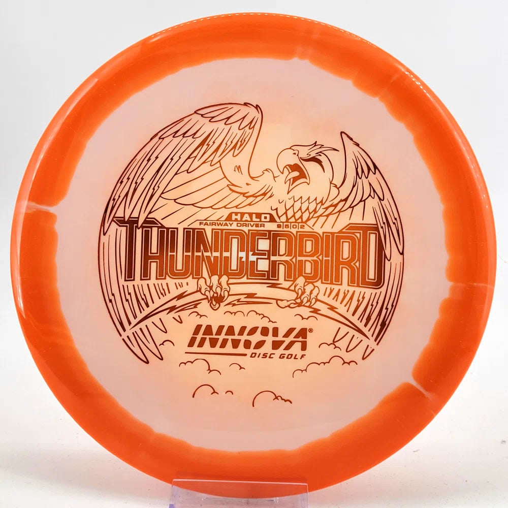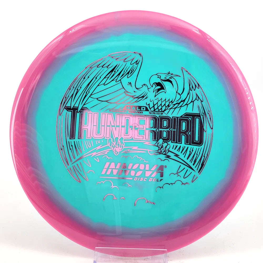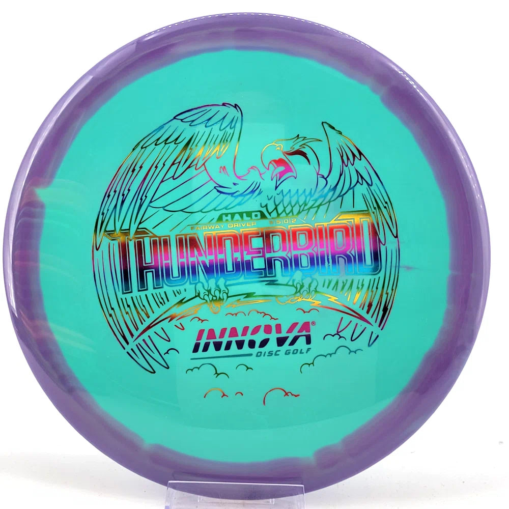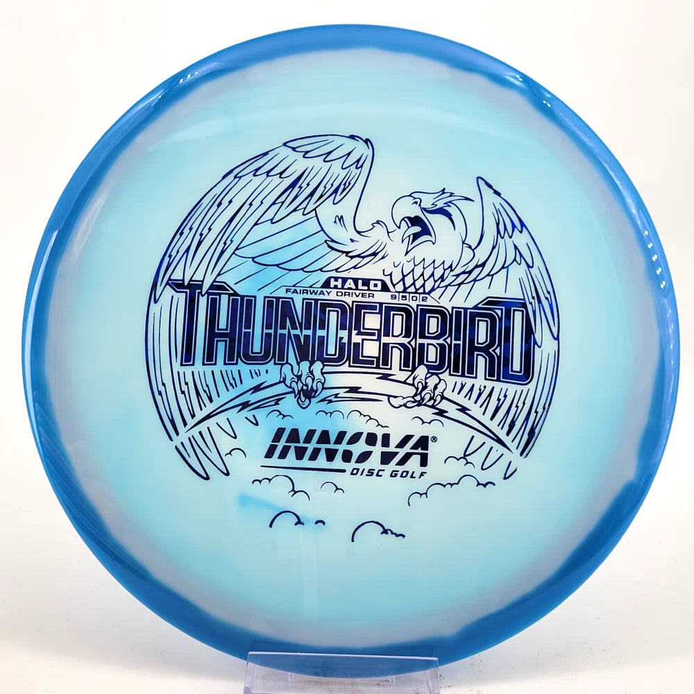 The Halo Thunderbird w/flight numbers is now available as a Limited Production offering. One of our most versatile discs for backhand and forehand shots, the Innova Thunderbird is a must have. The stability of a TeeBird with the speed of a Valkryie. Grab the extra glide and superior looks with the Halo Star material!
