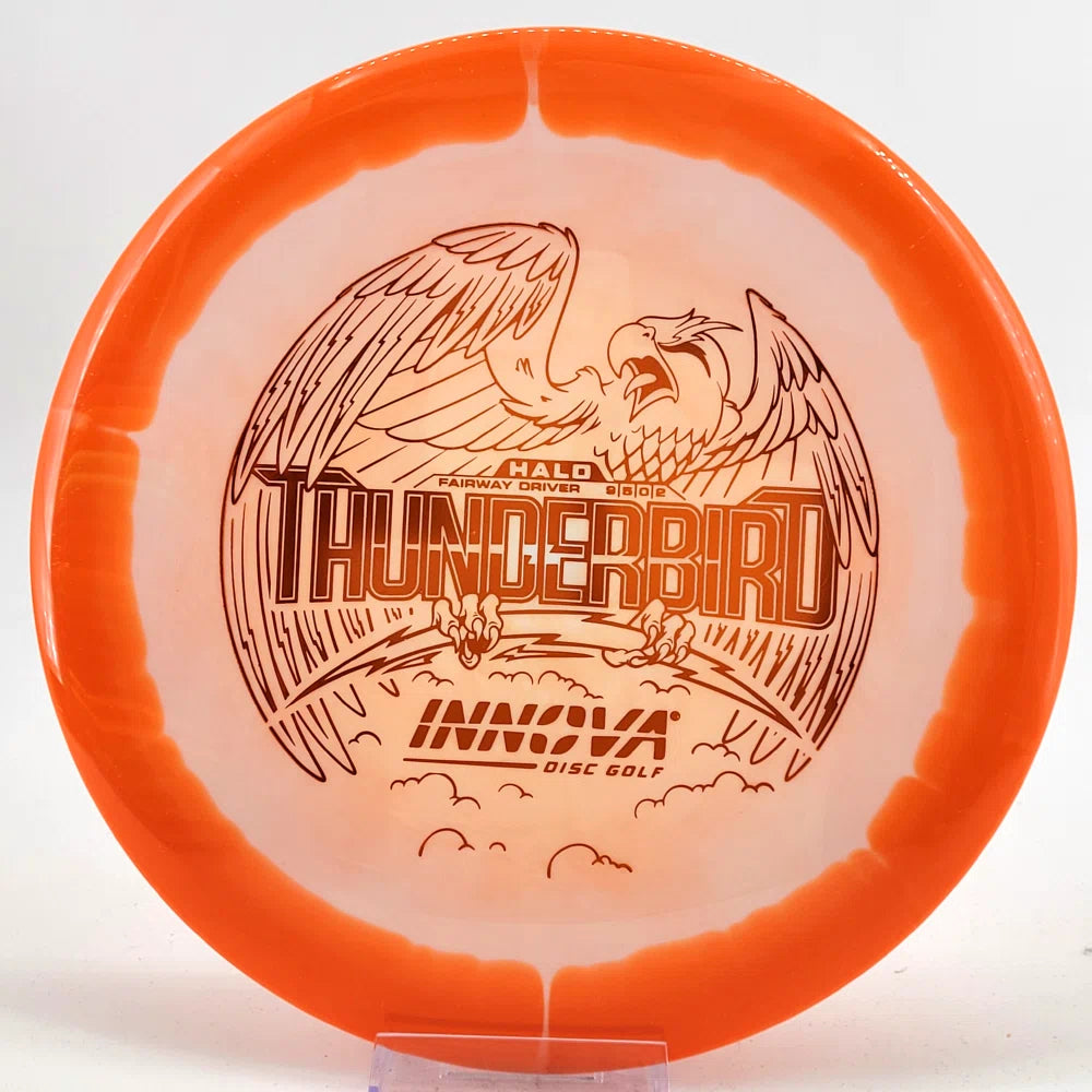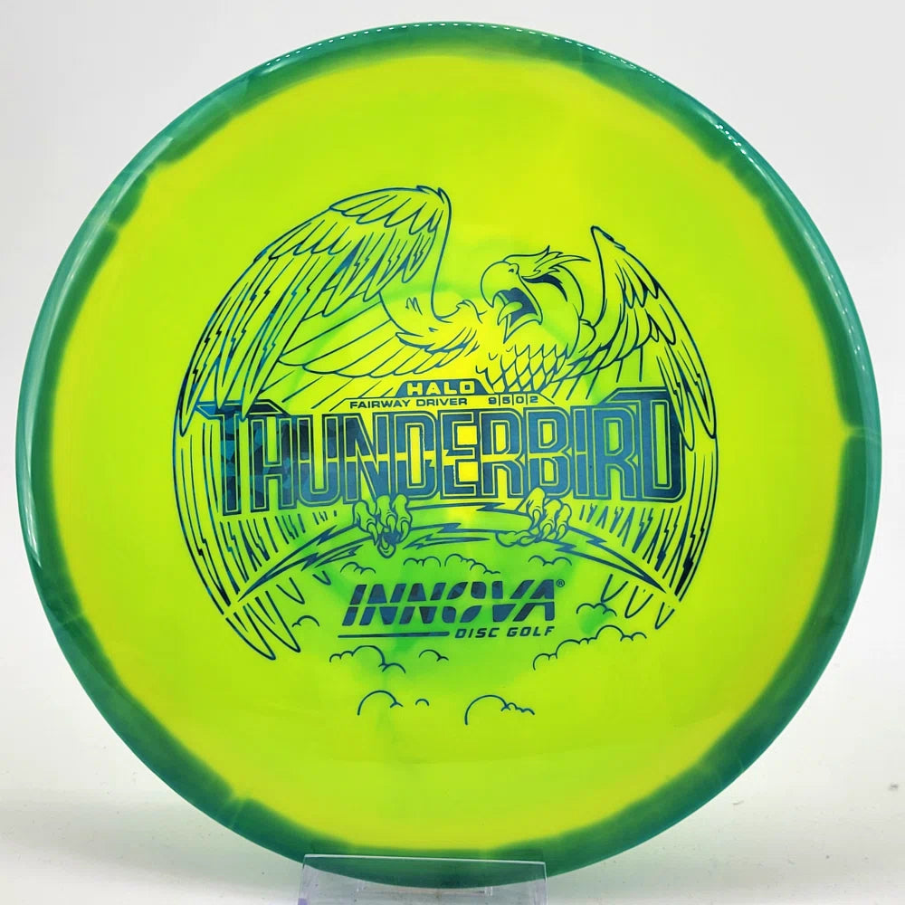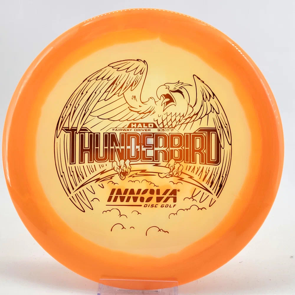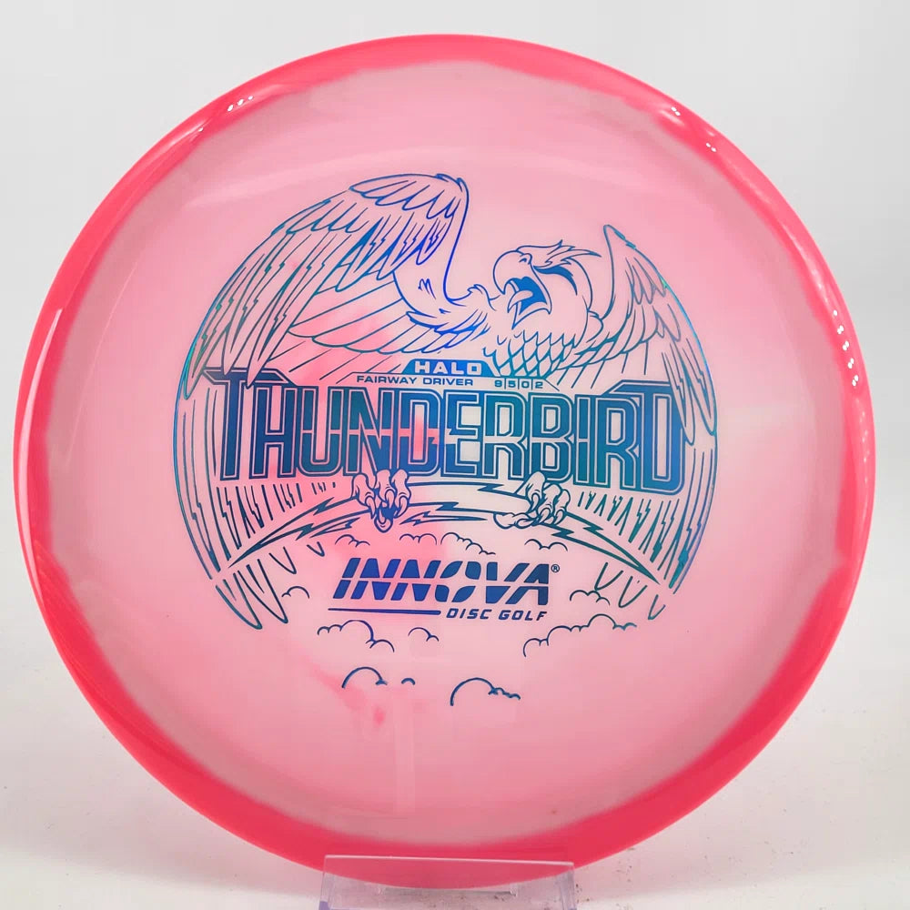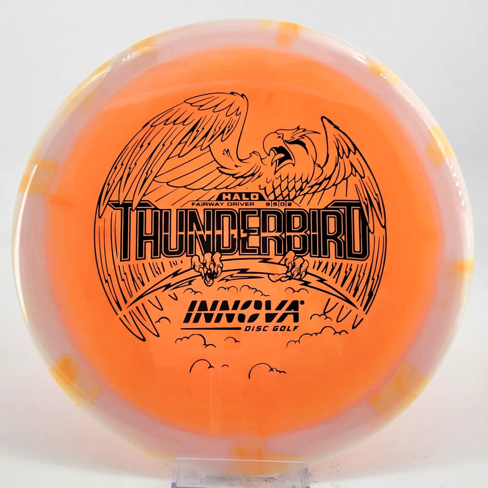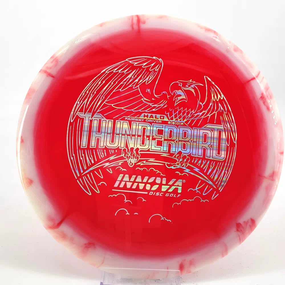The Halo Thunderbird w/flight numbers is now available as a Limited Production offering. One of our most versatile discs for backhand and forehand shots, the Innova Thunderbird is a must have. The stability of a TeeBird with the speed of a Valkryie. Grab the extra glide and superior looks with the Halo Star material!