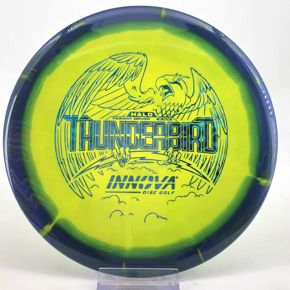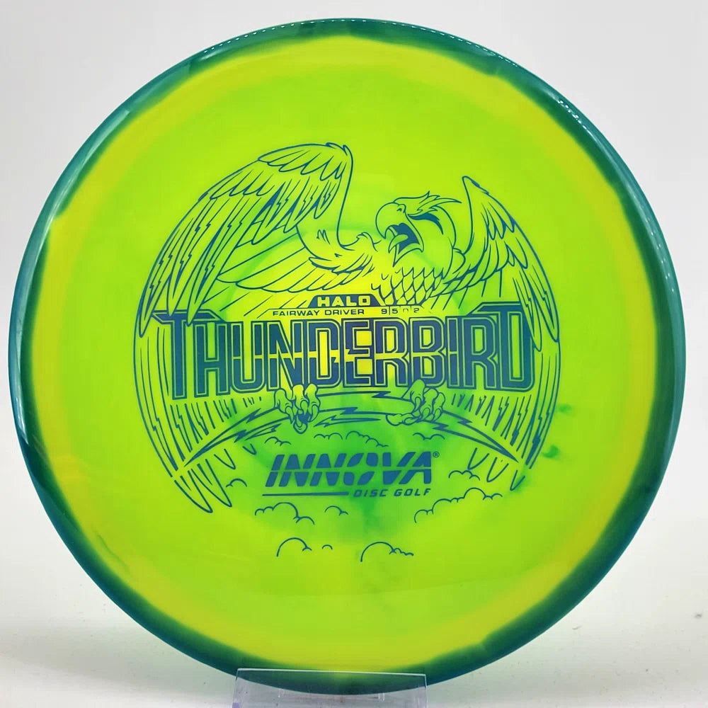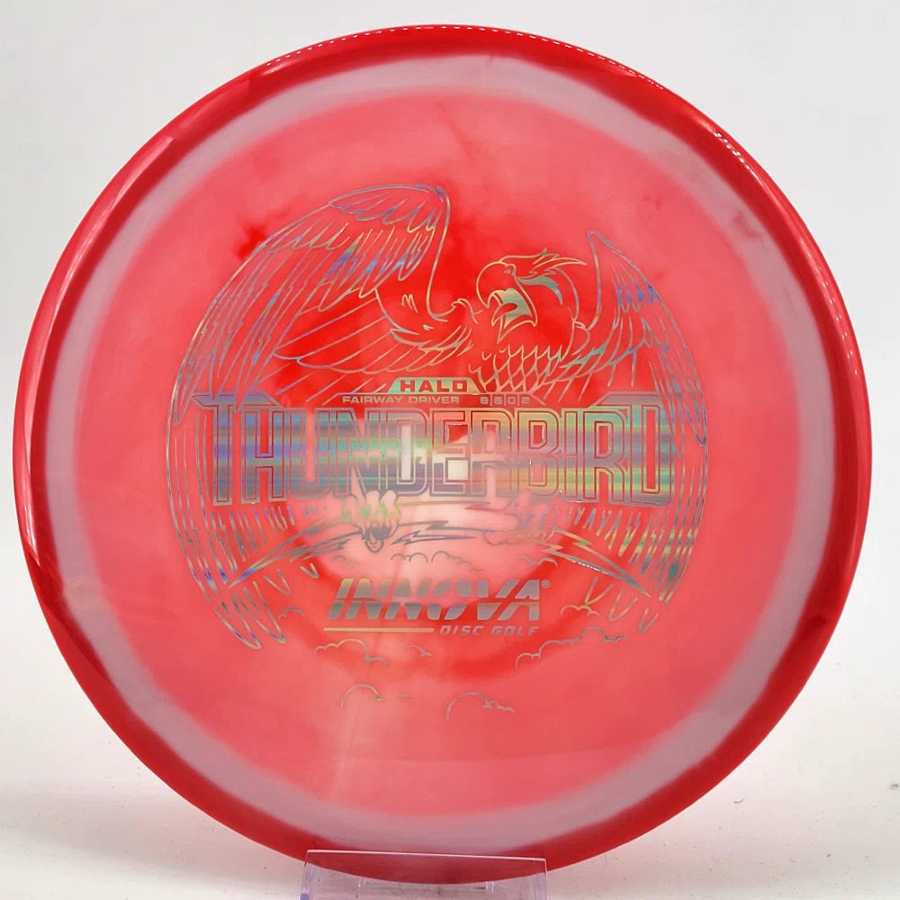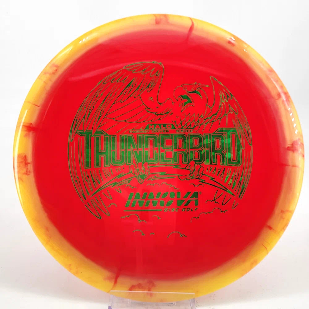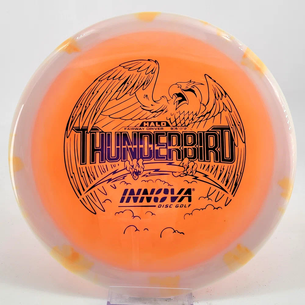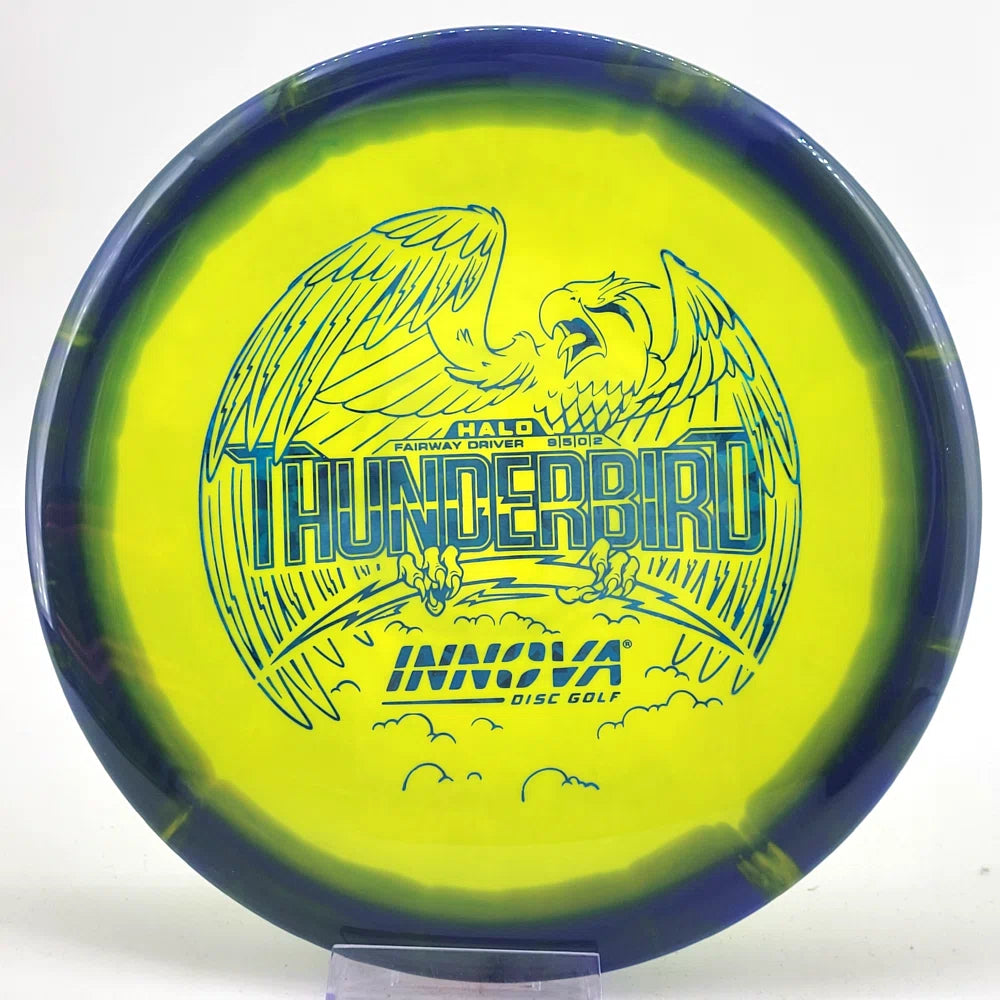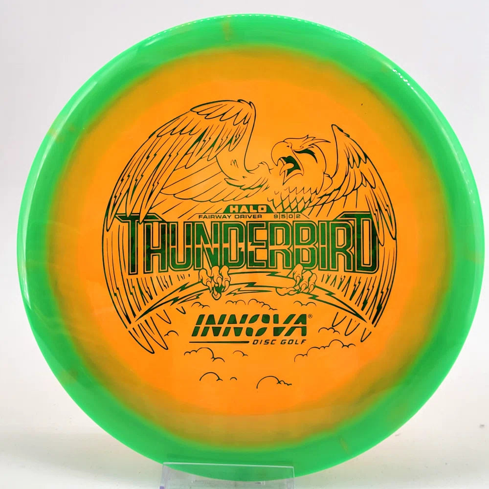 The Halo Thunderbird w/flight numbers is now available as a Limited Production offering. One of our most versatile discs for backhand and forehand shots, the Innova Thunderbird is a must have. The stability of a TeeBird with the speed of a Valkryie. Grab the extra glide and superior looks with the Halo Star material!
