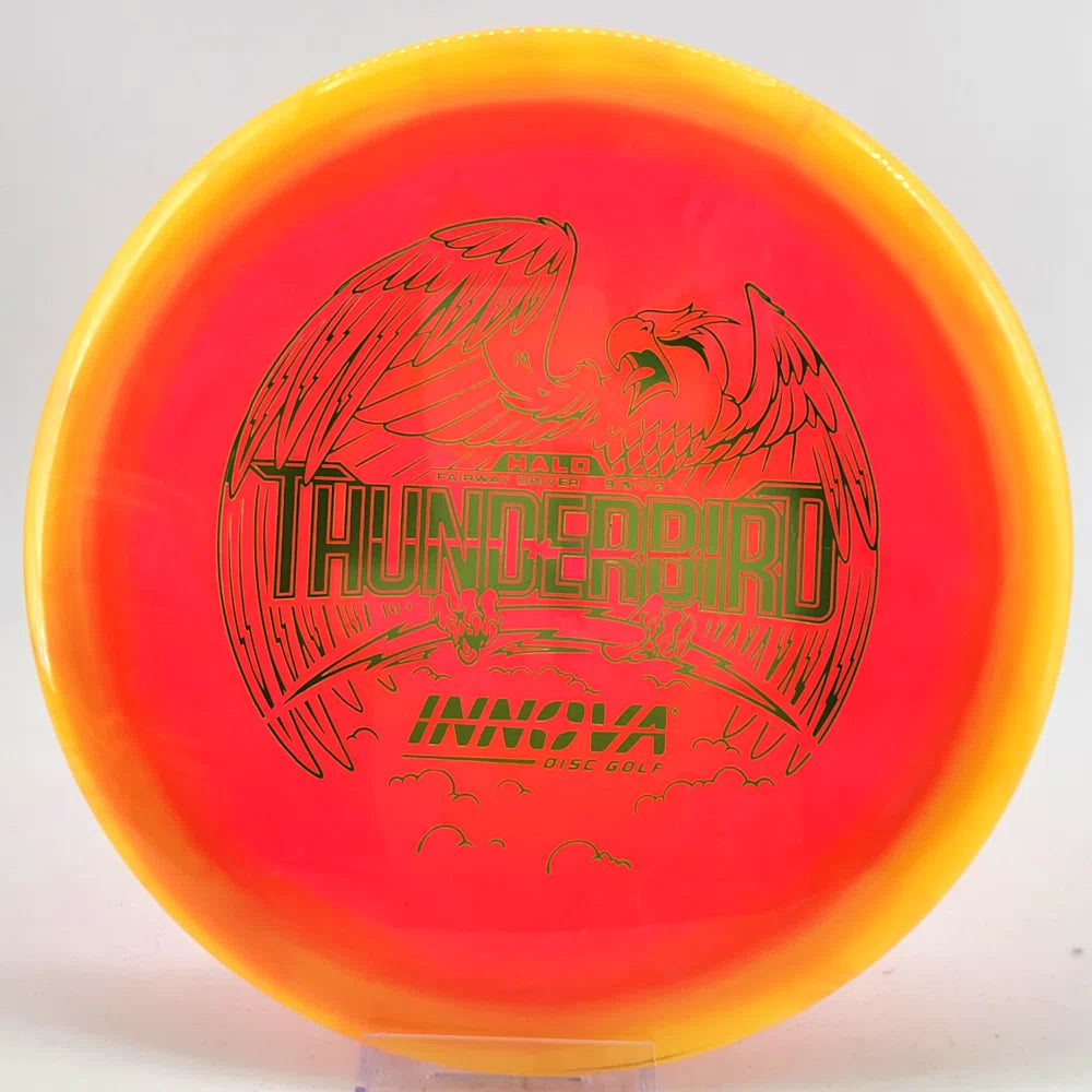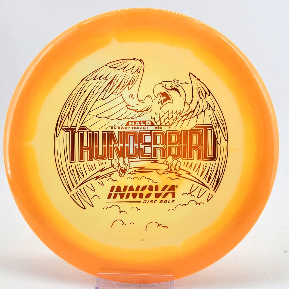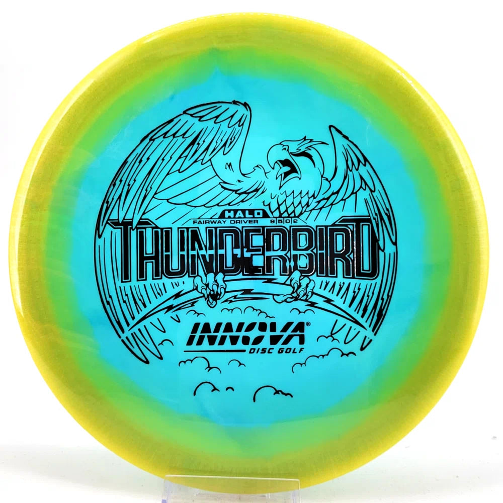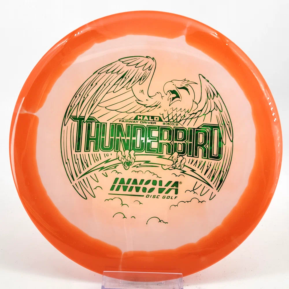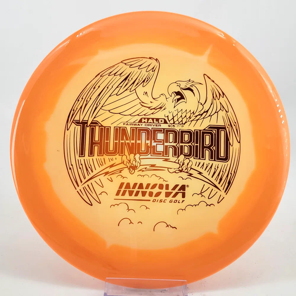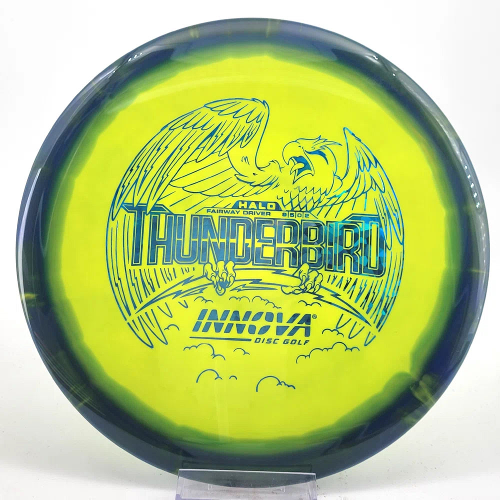 The Halo Thunderbird w/flight numbers is now available as a Limited Production offering. One of our most versatile discs for backhand and forehand shots, the Innova Thunderbird is a must have. The stability of a TeeBird with the speed of a Valkryie. Grab the extra glide and superior looks with the Halo Star material!