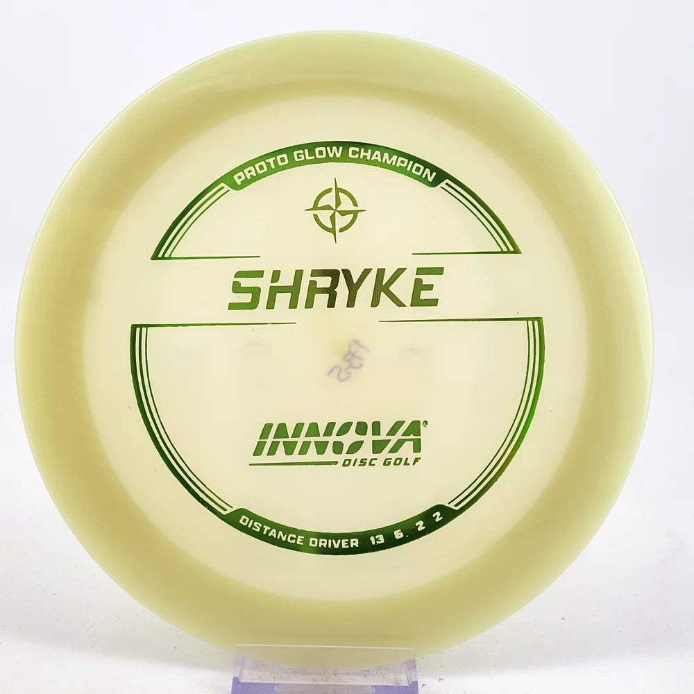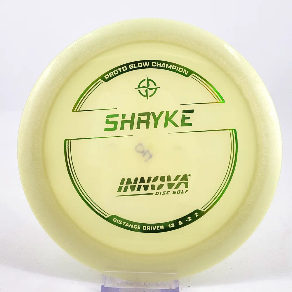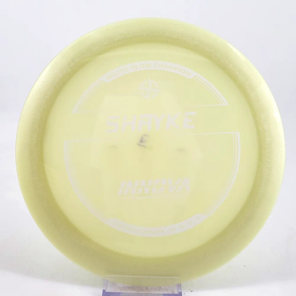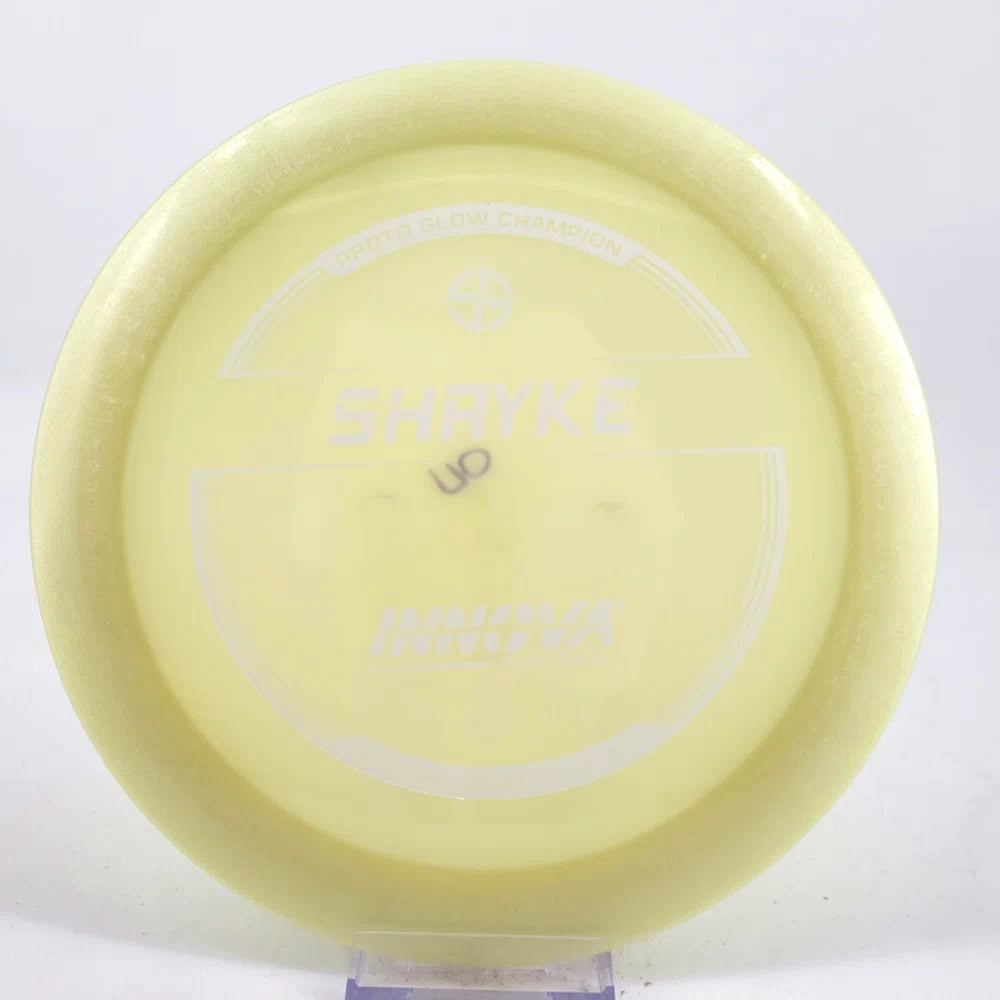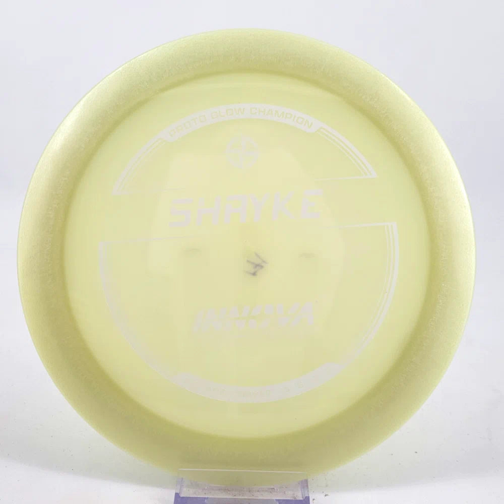 About the plastic: Proto Glow material comes in a variety of colors and each has a different maximum brightness value. Traditional green is the brightest, hence why it was chosen as the default. Glow Champion is made with the same high-tech durable plastic as the Champion Line with the added benefit of glowing in the dark. Glow Champion discs are easily distinguished by their translucent greeish-yellow hue. Highly durable and easy to spot, the Champion Glow Line is perfect for Glow Disc Golf.