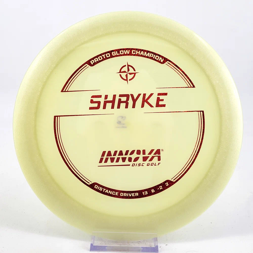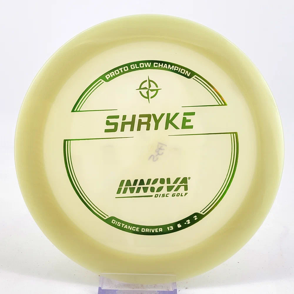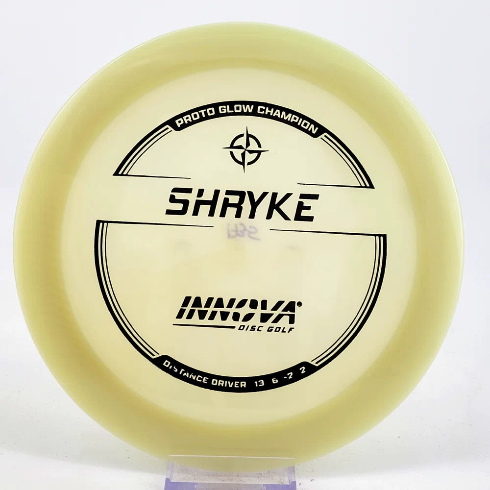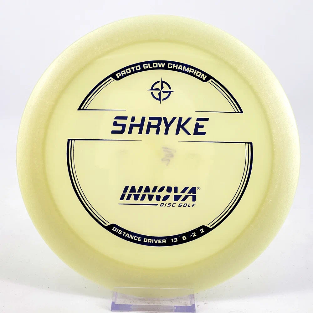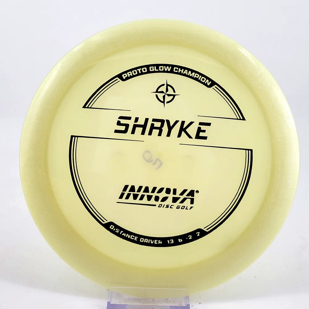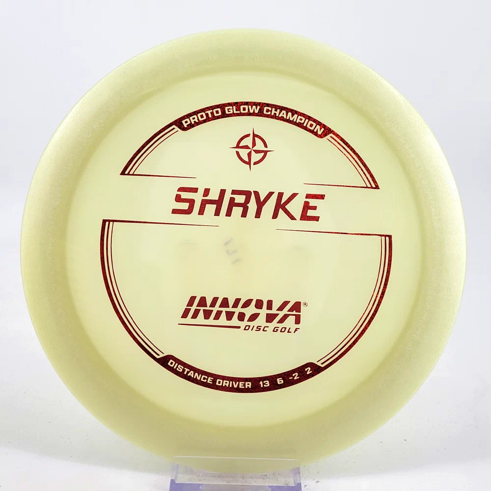 About the plastic: Proto Glow material comes in a variety of colors and each has a different maximum brightness value. Traditional green is the brightest, hence why it was chosen as the default. Glow Champion is made with the same high-tech durable plastic as the Champion Line with the added benefit of glowing in the dark. Glow Champion discs are easily distinguished by their translucent greeish-yellow hue. Highly durable and easy to spot, the Champion Glow Line is perfect for Glow Disc Golf.