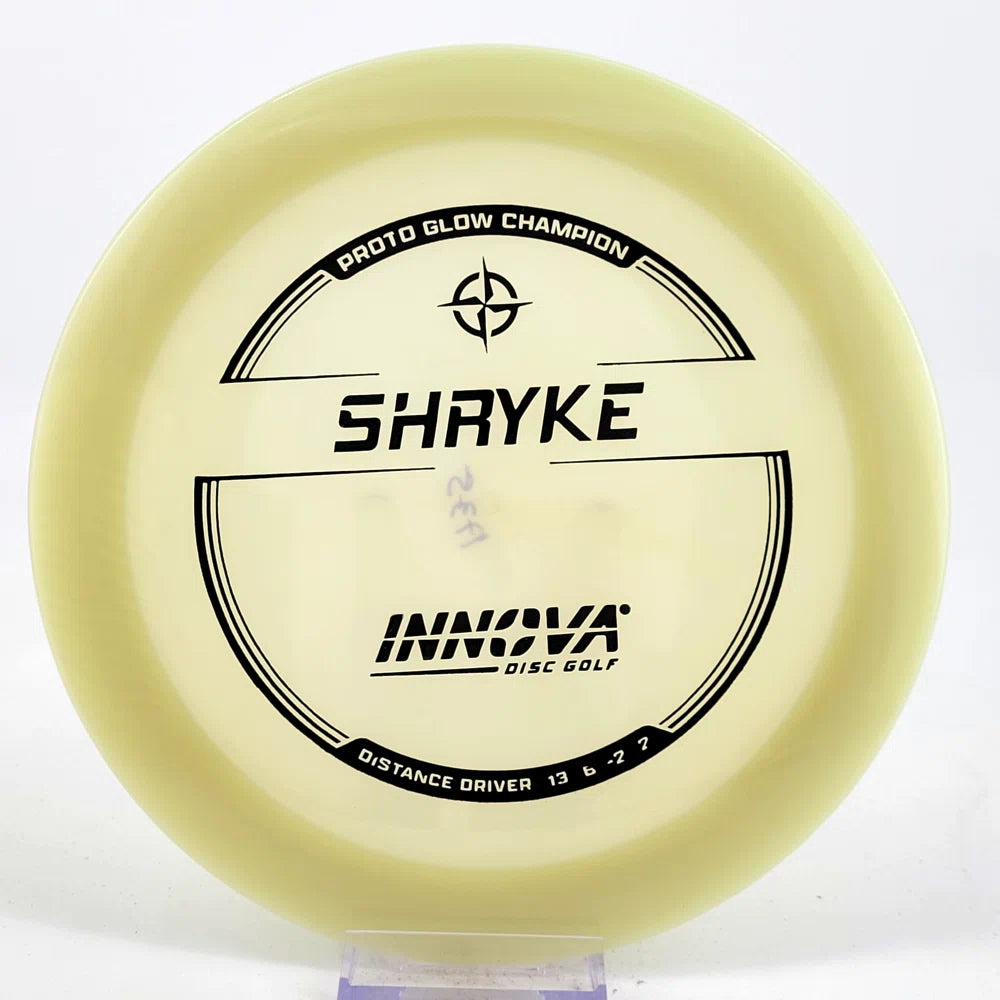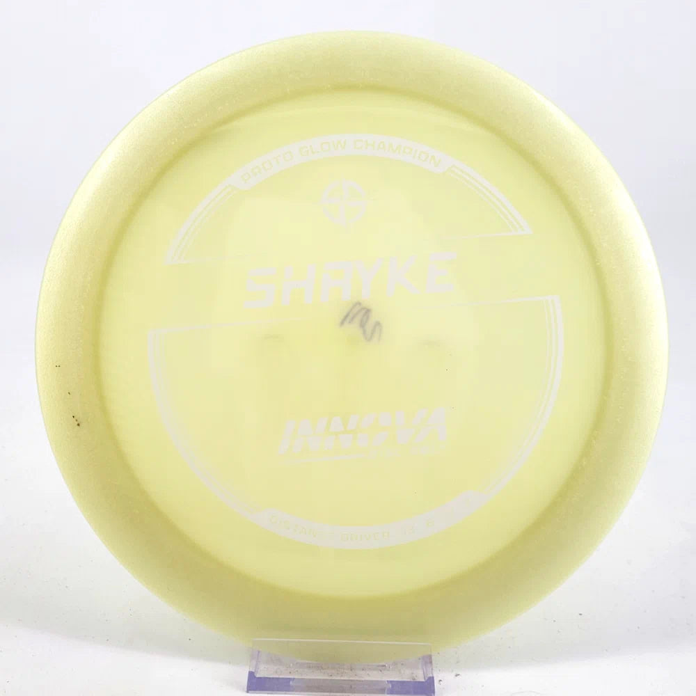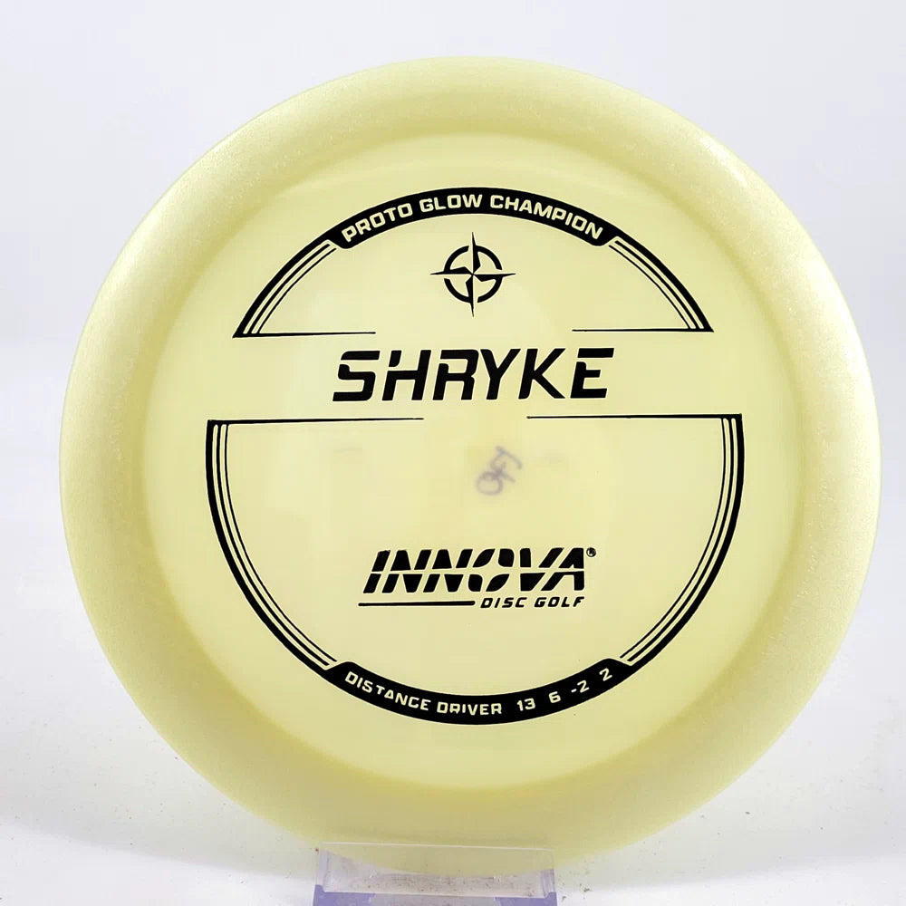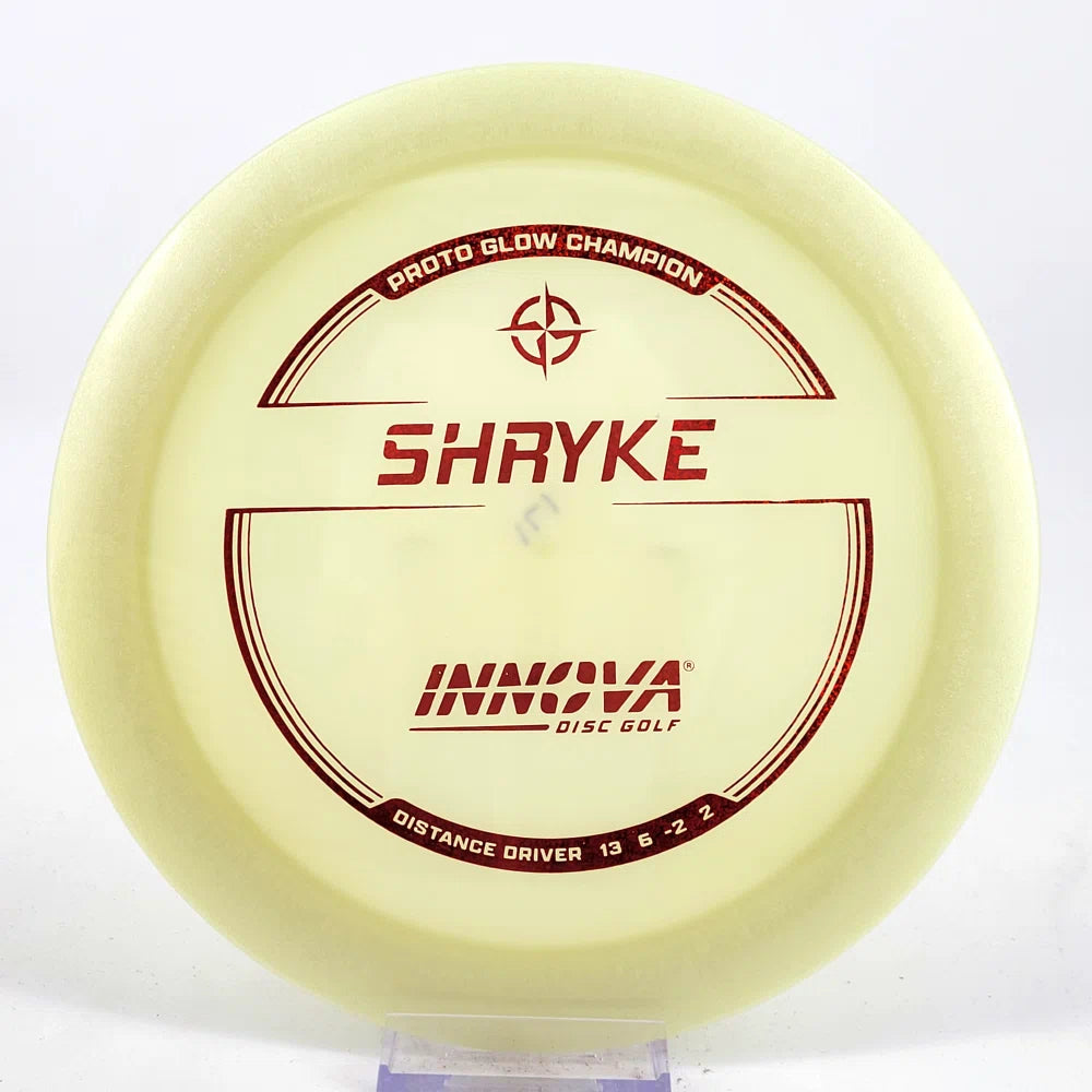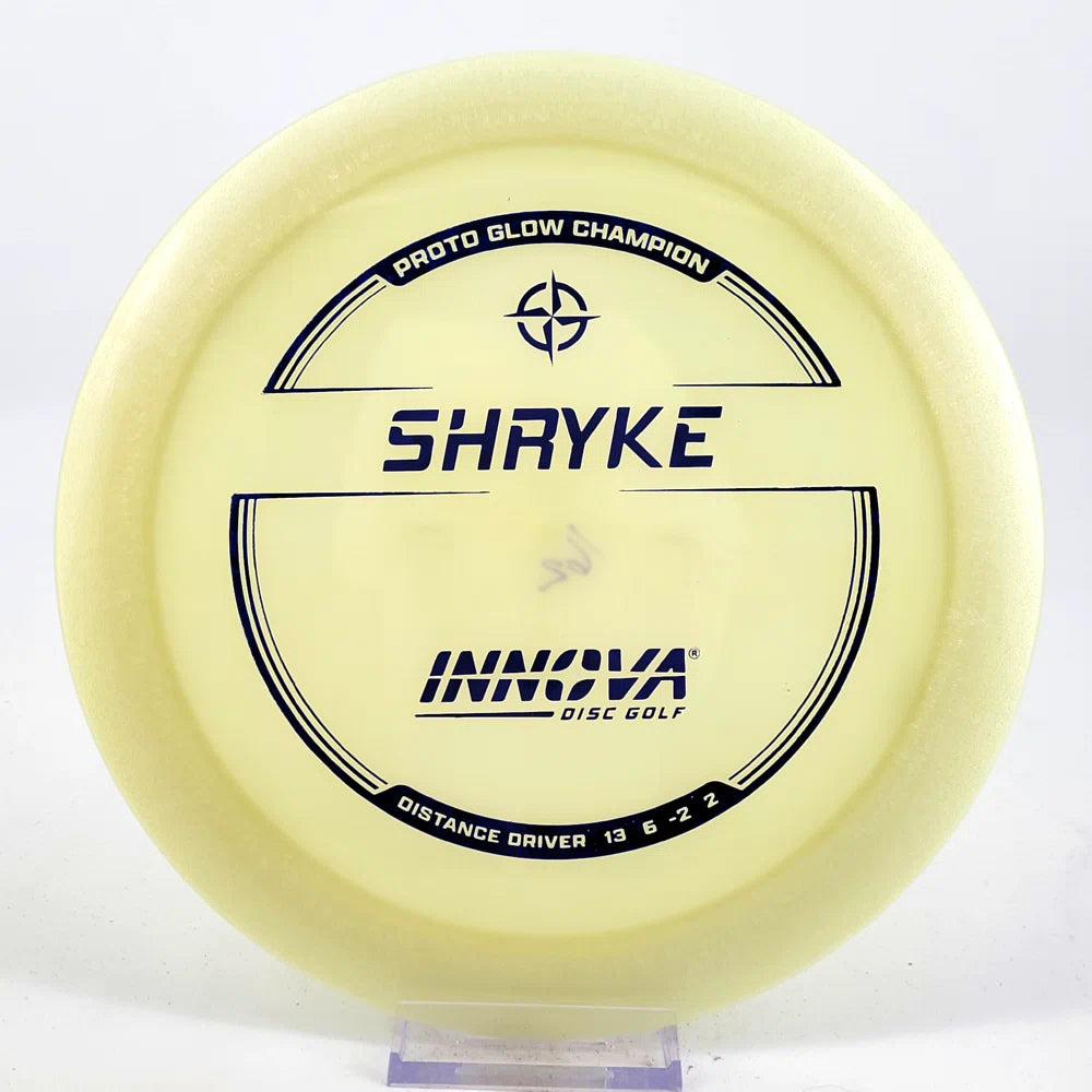 About the plastic: Proto Glow material comes in a variety of colors and each has a different maximum brightness value. Traditional green is the brightest, hence why it was chosen as the default. Glow Champion is made with the same high-tech durable plastic as the Champion Line with the added benefit of glowing in the dark. Glow Champion discs are easily distinguished by their translucent greeish-yellow hue. Highly durable and easy to spot, the Champion Glow Line is perfect for Glow Disc Golf.