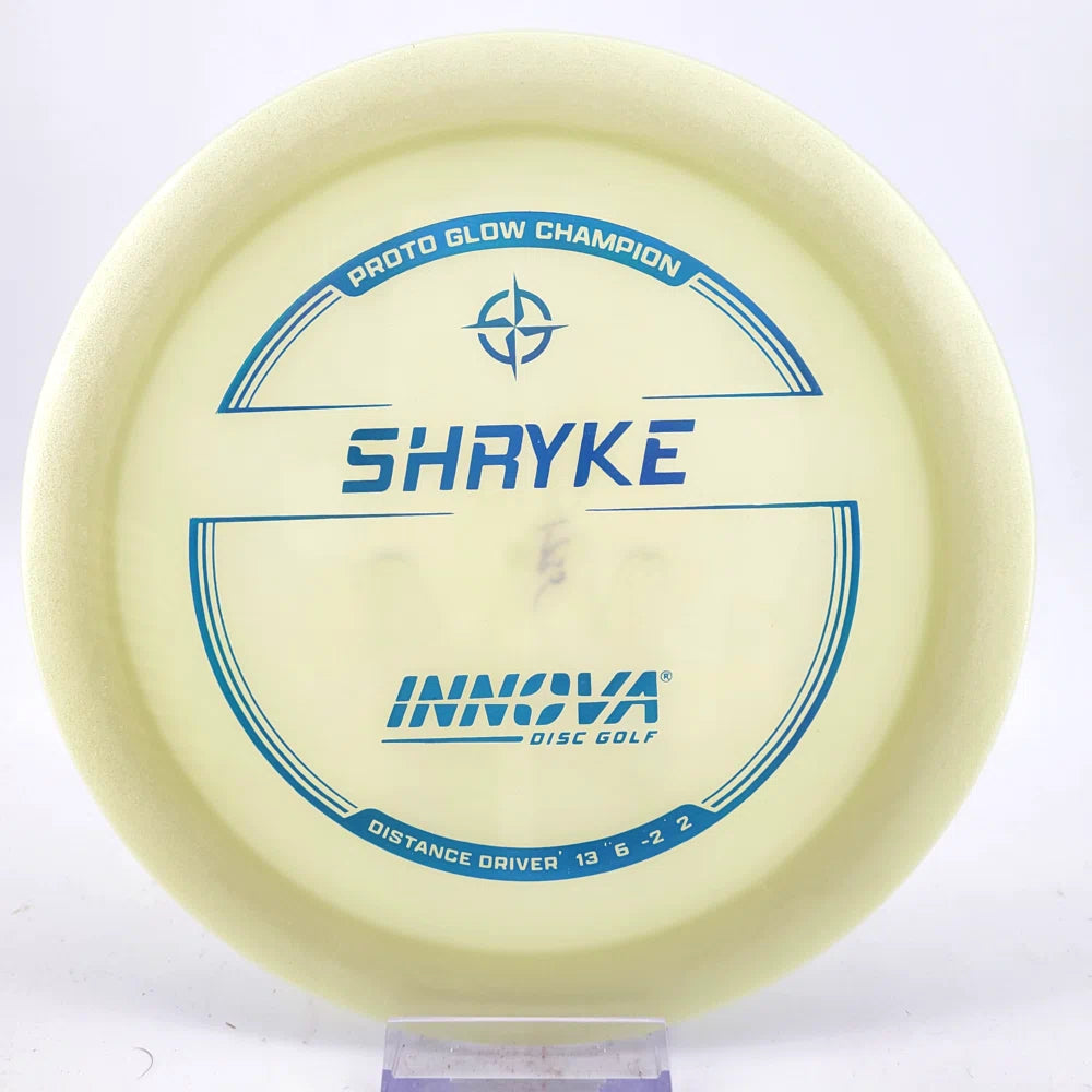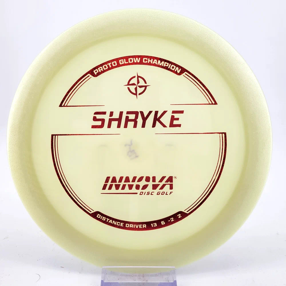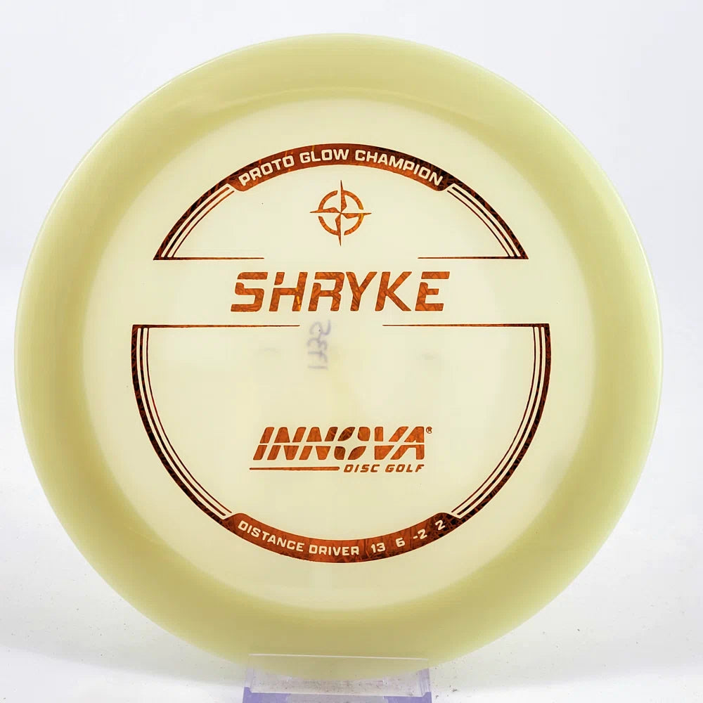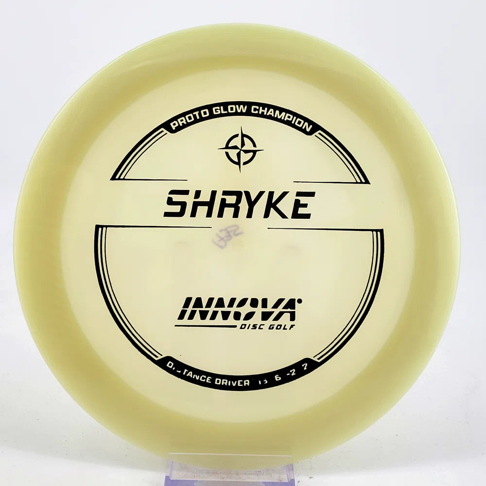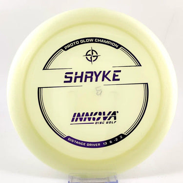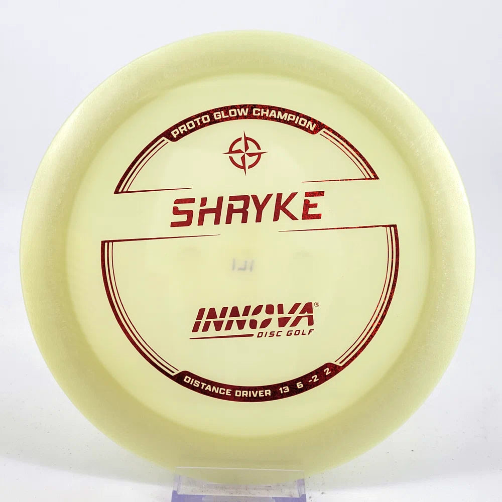 About the plastic: Proto Glow material comes in a variety of colors and each has a different maximum brightness value. Traditional green is the brightest, hence why it was chosen as the default. Glow Champion is made with the same high-tech durable plastic as the Champion Line with the added benefit of glowing in the dark. Glow Champion discs are easily distinguished by their translucent greeish-yellow hue. Highly durable and easy to spot, the Champion Glow Line is perfect for Glow Disc Golf.
