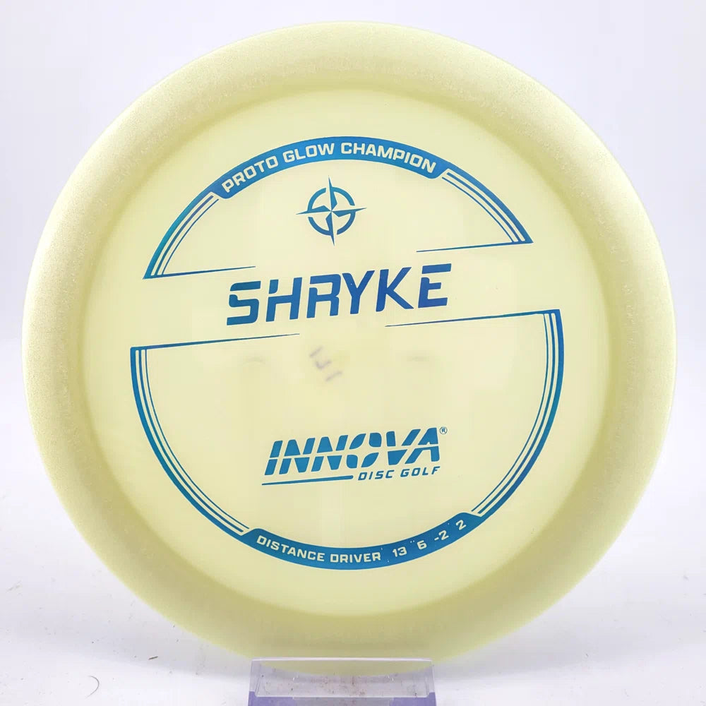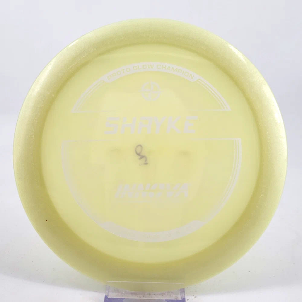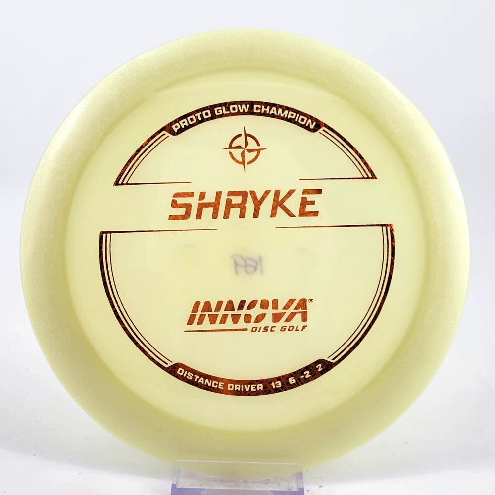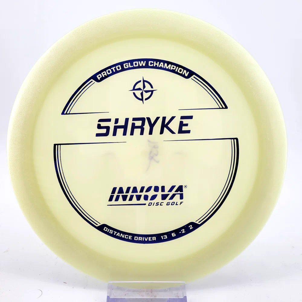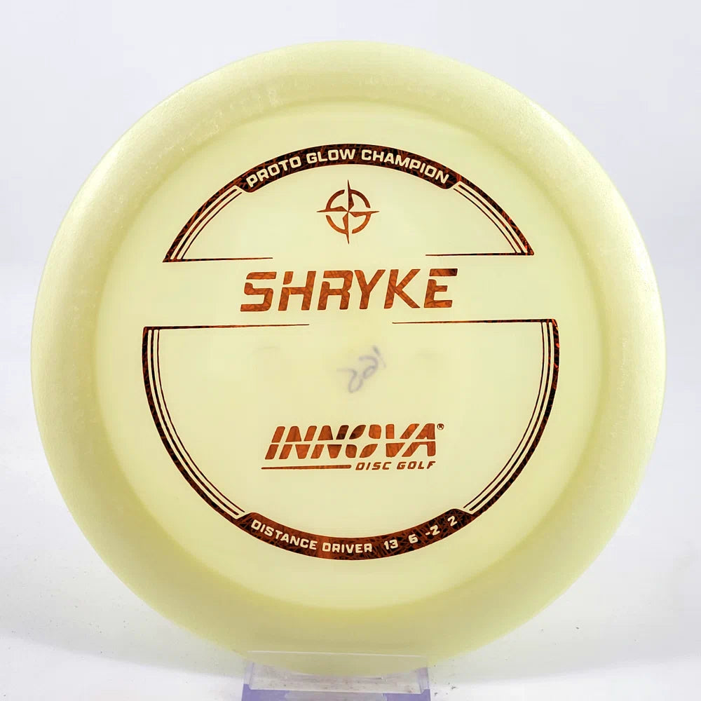 About the plastic: Proto Glow material comes in a variety of colors and each has a different maximum brightness value. Traditional green is the brightest, hence why it was chosen as the default. Glow Champion is made with the same high-tech durable plastic as the Champion Line with the added benefit of glowing in the dark. Glow Champion discs are easily distinguished by their translucent greeish-yellow hue. Highly durable and easy to spot, the Champion Glow Line is perfect for Glow Disc Golf.
