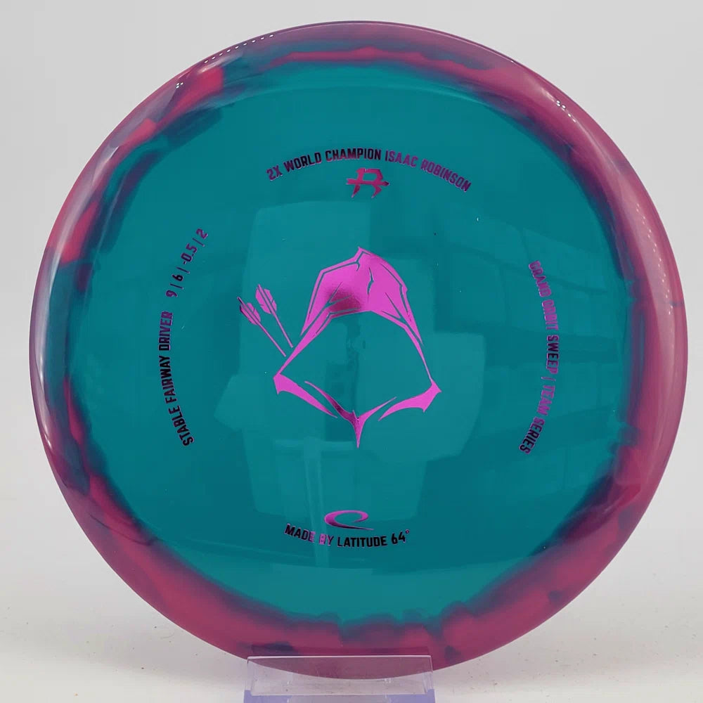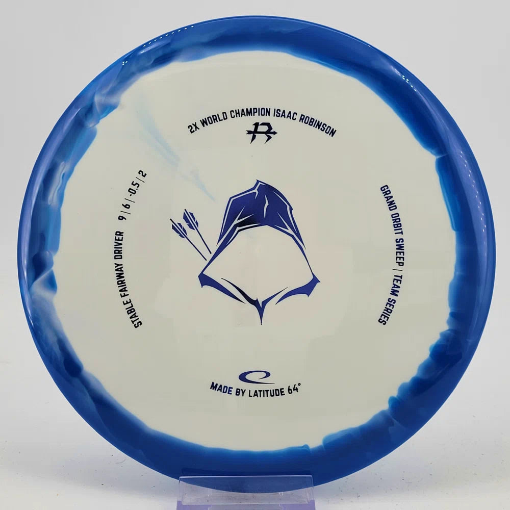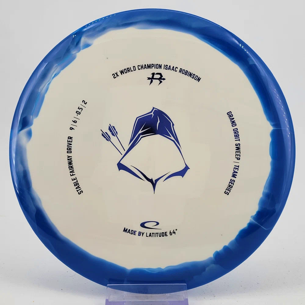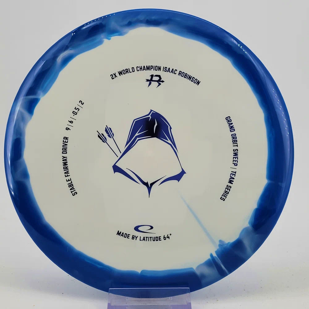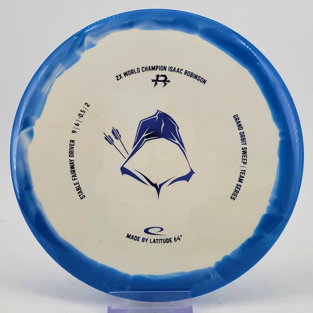 About the plastic: Royal Grand is our durable premium plastic with great grip that will not fail you, no matter the outside circumstances. It features a soft feel with a rigid rim part with perfect flex. Orbit is Latitude 64's spectacular two-color process that opens up a whole new world of color combinations. No orbits are the same and every one has different variations within the disc.