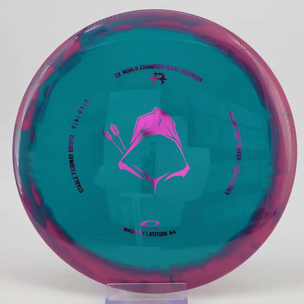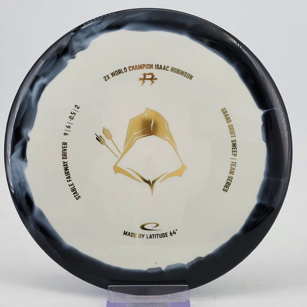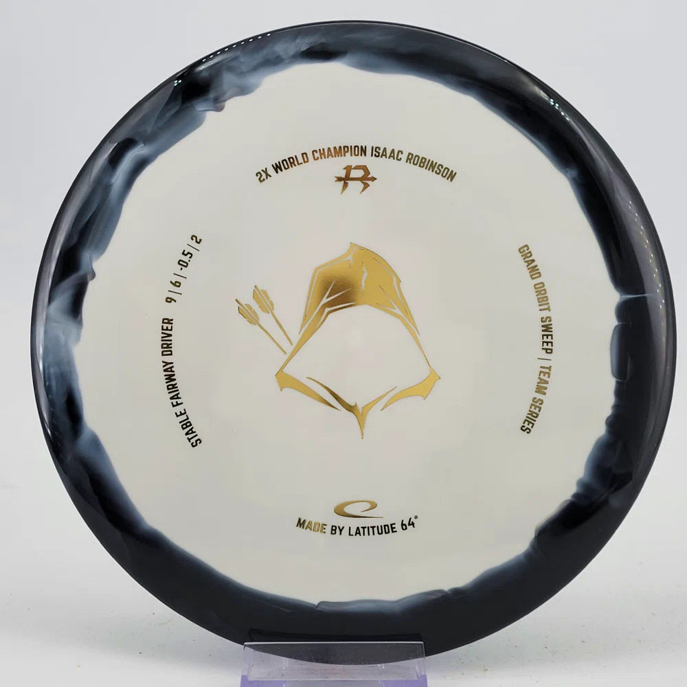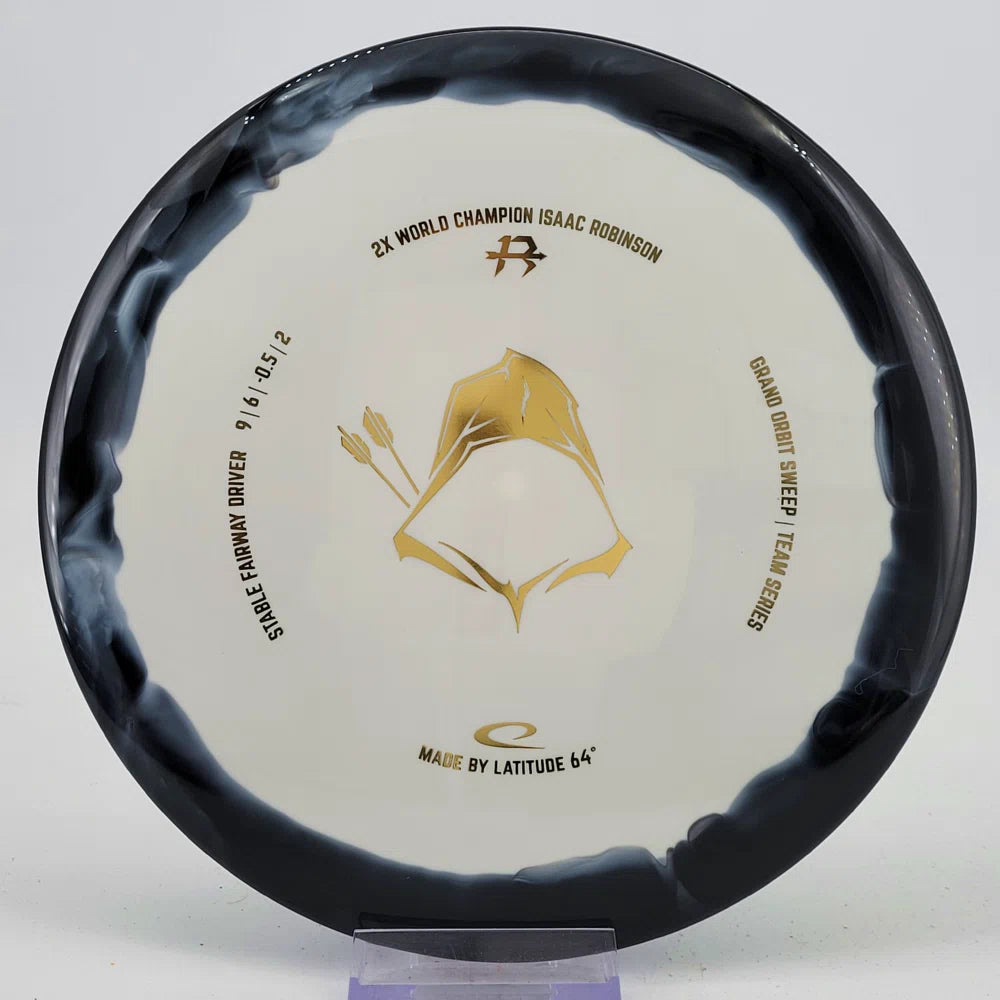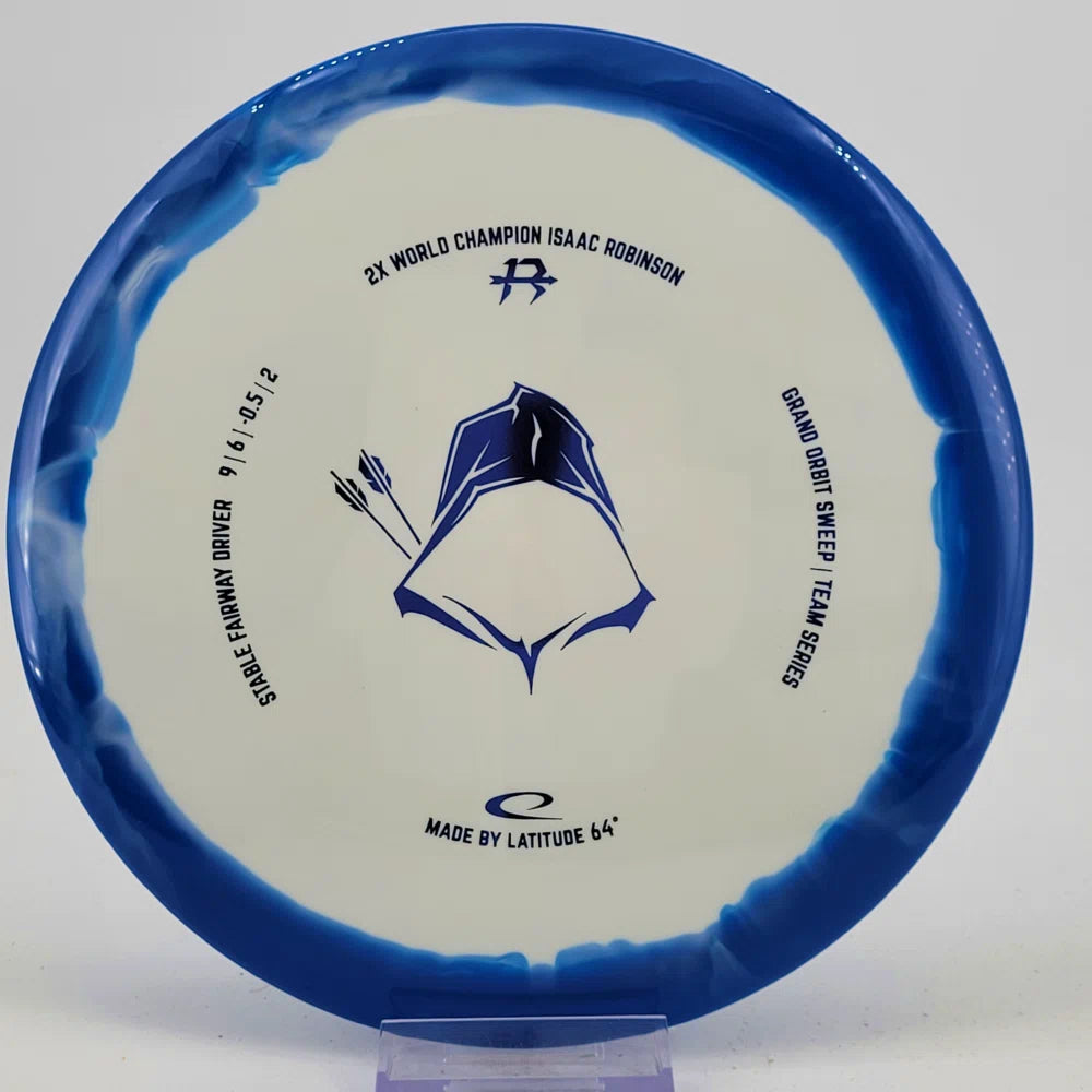 About the plastic: Royal Grand is our durable premium plastic with great grip that will not fail you, no matter the outside circumstances. It features a soft feel with a rigid rim part with perfect flex. Orbit is Latitude 64's spectacular two-color process that opens up a whole new world of color combinations. No orbits are the same and every one has different variations within the disc.