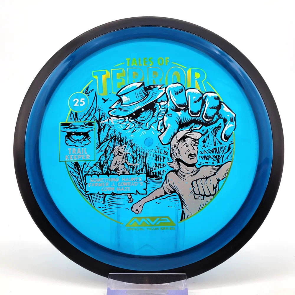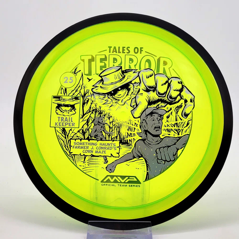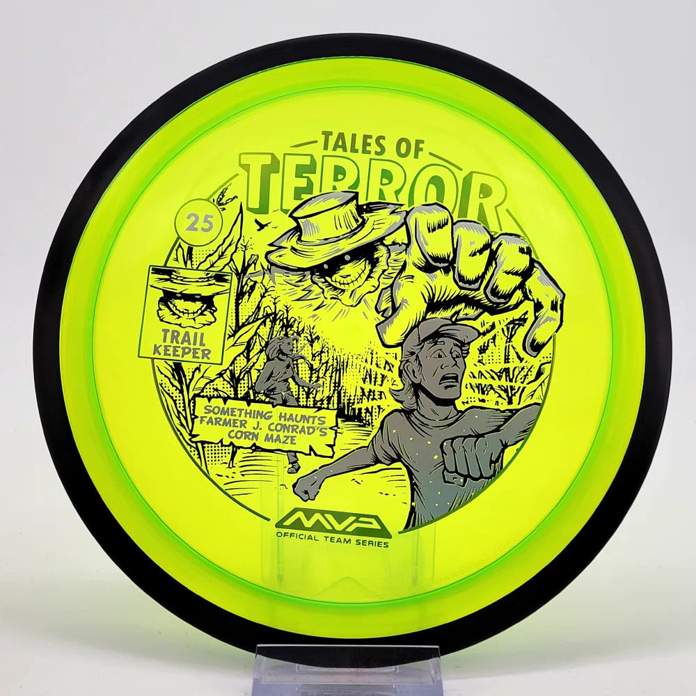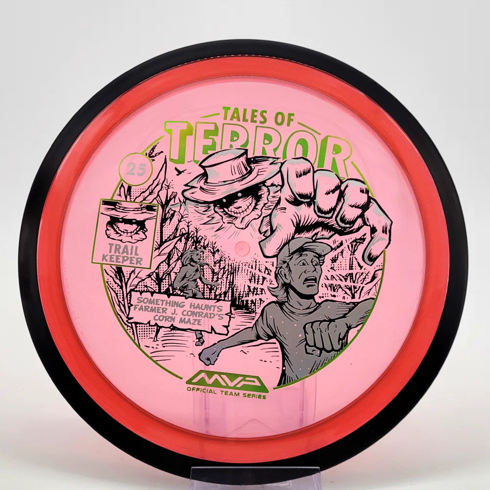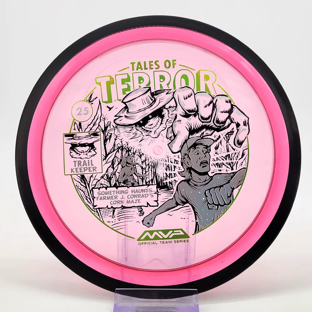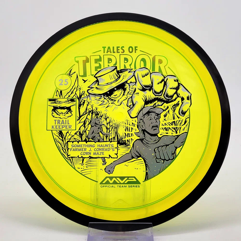 The highly requested fan favorite Proton Trail has returned! Green C Studio adorns this disc with a glimpse of the Trail Keeper haunting Conrad’s Corn Maze, a classic horror story. Excelling in hyzer-flip drives, turnovers, and straight shots, the Trail has become one of the most popular drivers in the MVP lineup that throwers of all power levels will find significant use for.