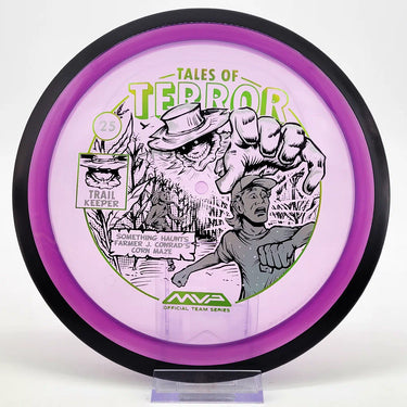The highly requested fan favorite Proton Trail has returned! Green C Studio adorns this disc with a glimpse of the Trail Keeper haunting Conrad’s Corn Maze, a classic horror story. Excelling in hyzer-flip drives, turnovers, and straight shots, the Trail has become one of the most popular drivers in the MVP lineup that throwers of all power levels will find significant use for.