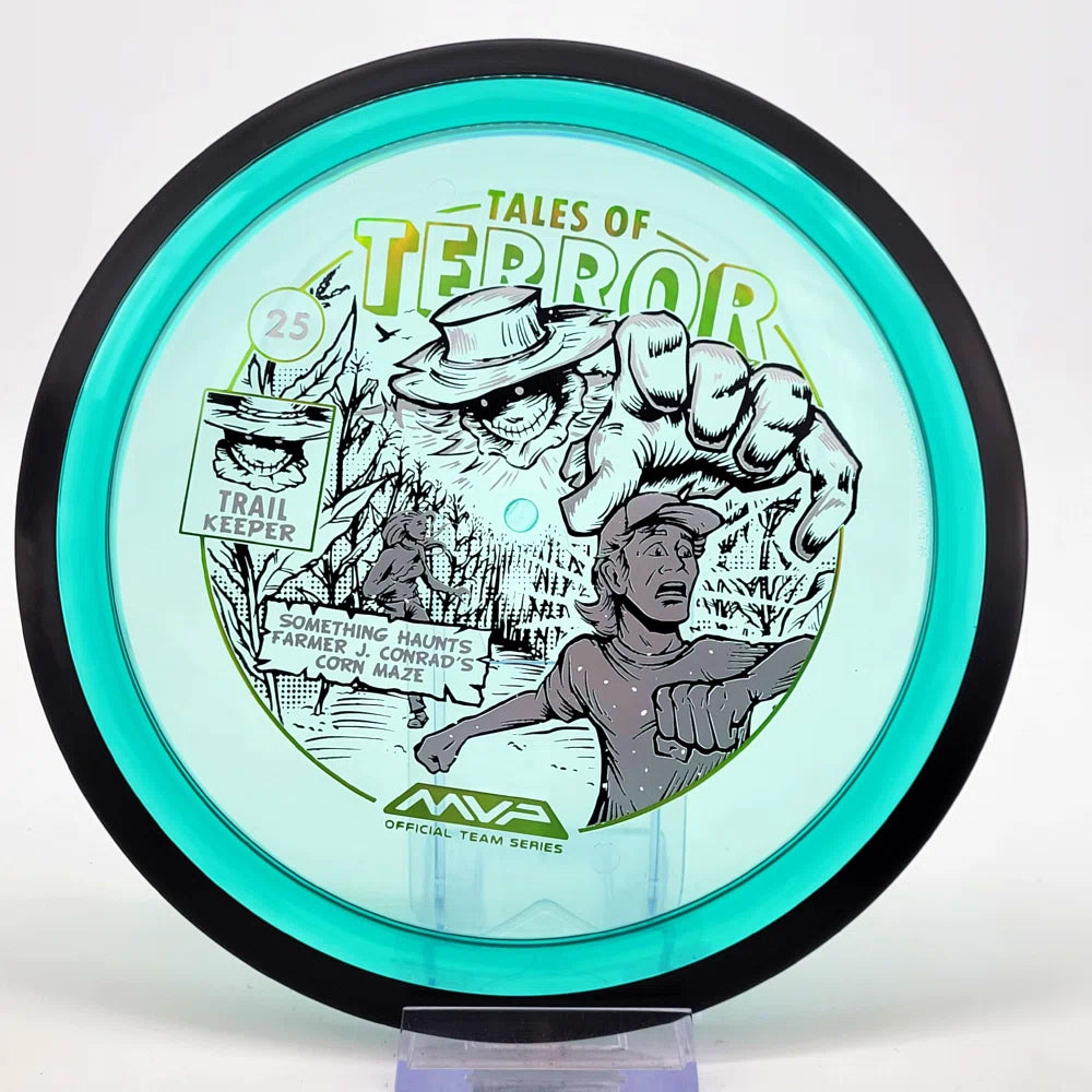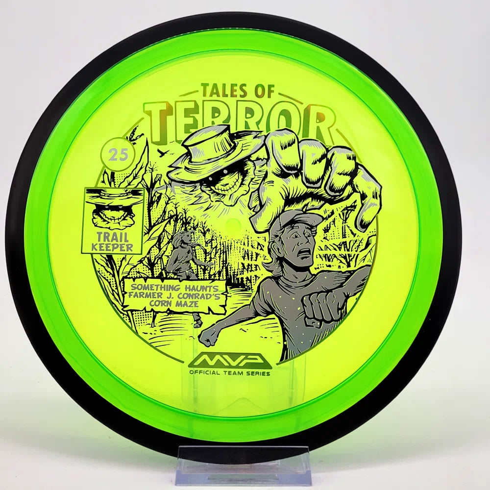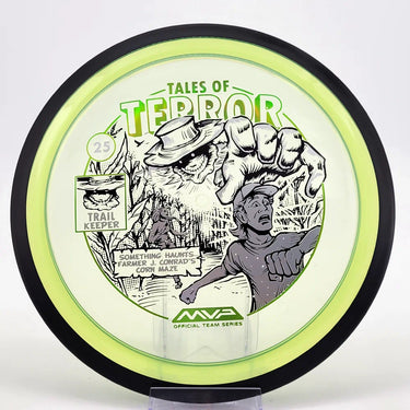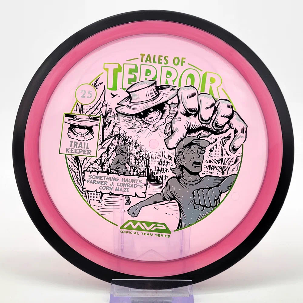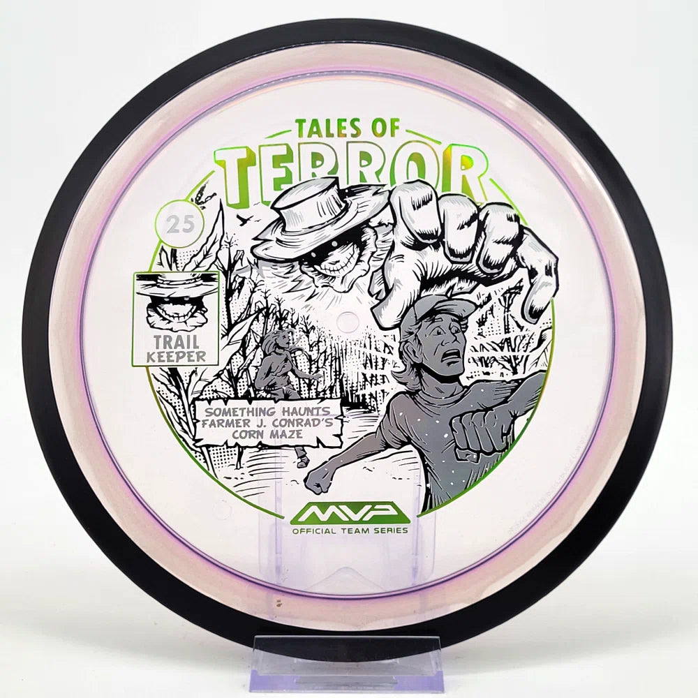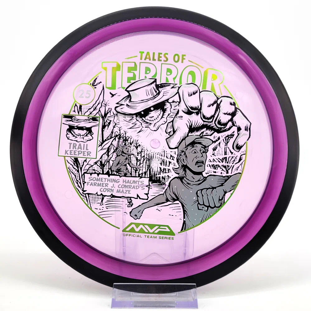 The highly requested fan favorite Proton Trail has returned! Green C Studio adorns this disc with a glimpse of the Trail Keeper haunting Conrad’s Corn Maze, a classic horror story. Excelling in hyzer-flip drives, turnovers, and straight shots, the Trail has become one of the most popular drivers in the MVP lineup that throwers of all power levels will find significant use for.