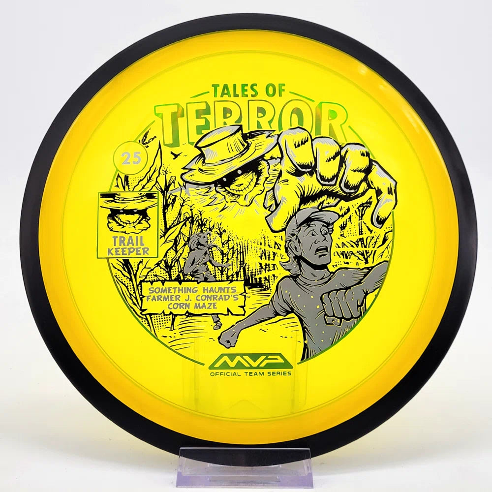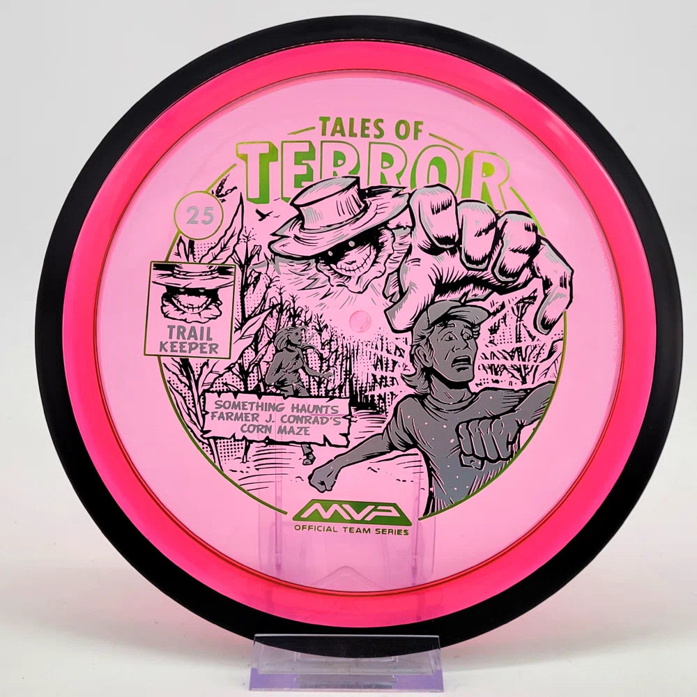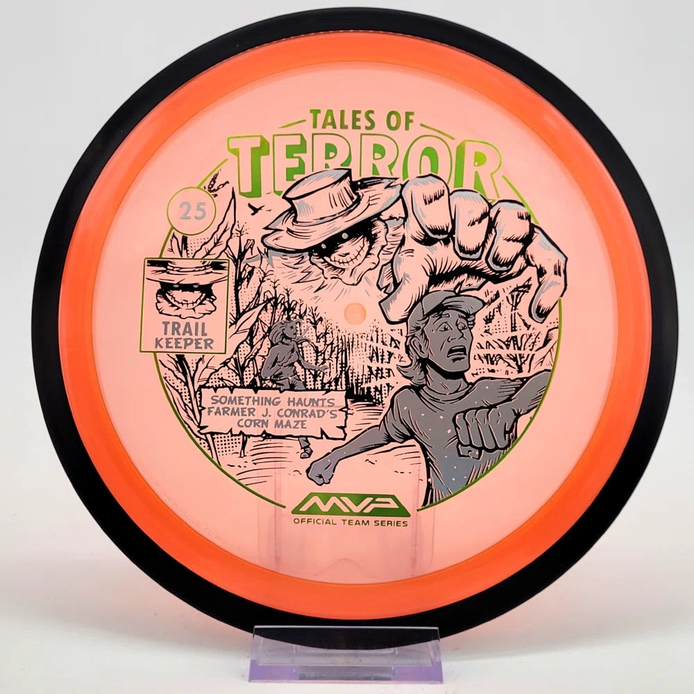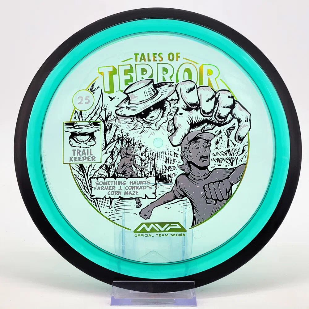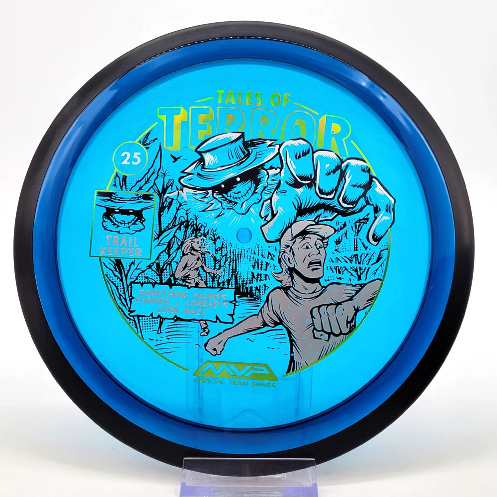 The highly requested fan favorite Proton Trail has returned! Green C Studio adorns this disc with a glimpse of the Trail Keeper haunting Conrad’s Corn Maze, a classic horror story. Excelling in hyzer-flip drives, turnovers, and straight shots, the Trail has become one of the most popular drivers in the MVP lineup that throwers of all power levels will find significant use for.