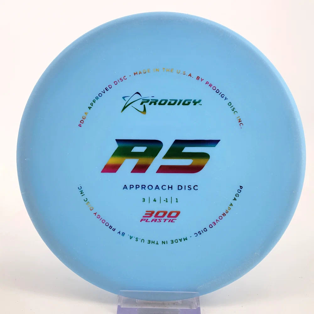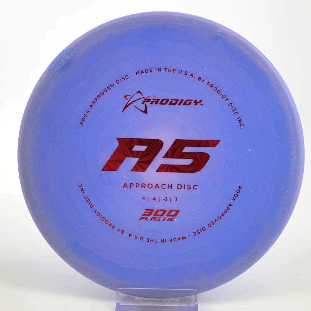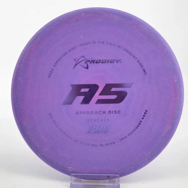 The Prodigy A5 is a slightly overstable approach disc that will work in to be a straight flyer. It has a nice, smooth feel with a shallow profile and flat top, which makes it ideal for sidearm approaches. It can handle torque well and has a mild finish on the end, so it won't skip too far from where it lands.