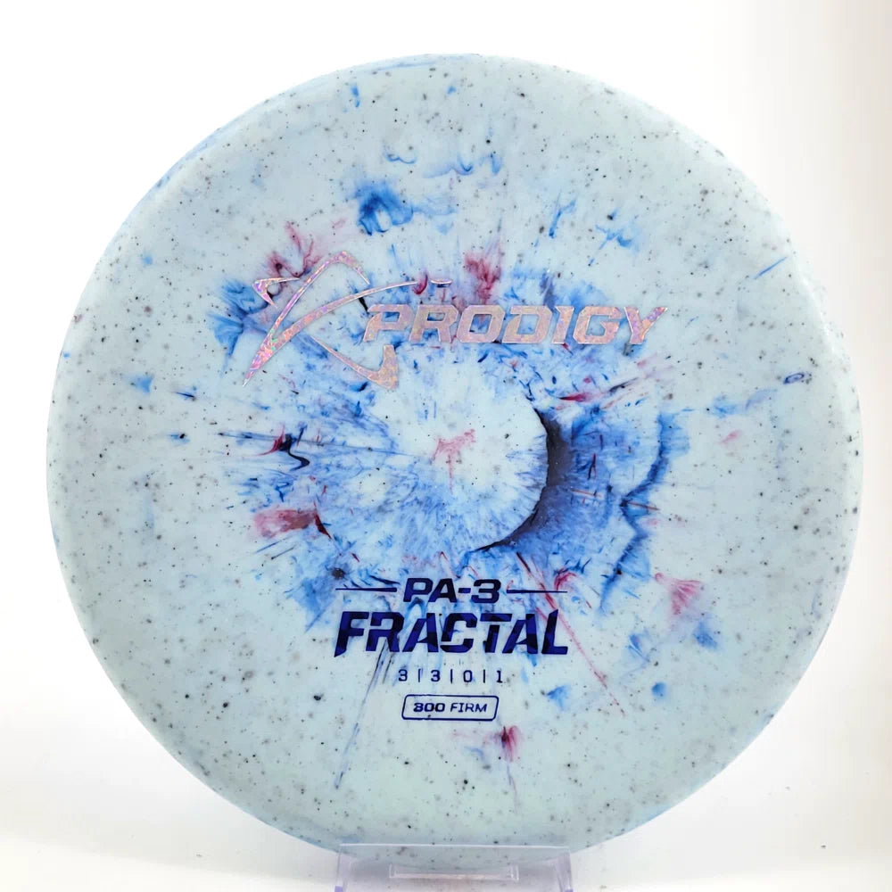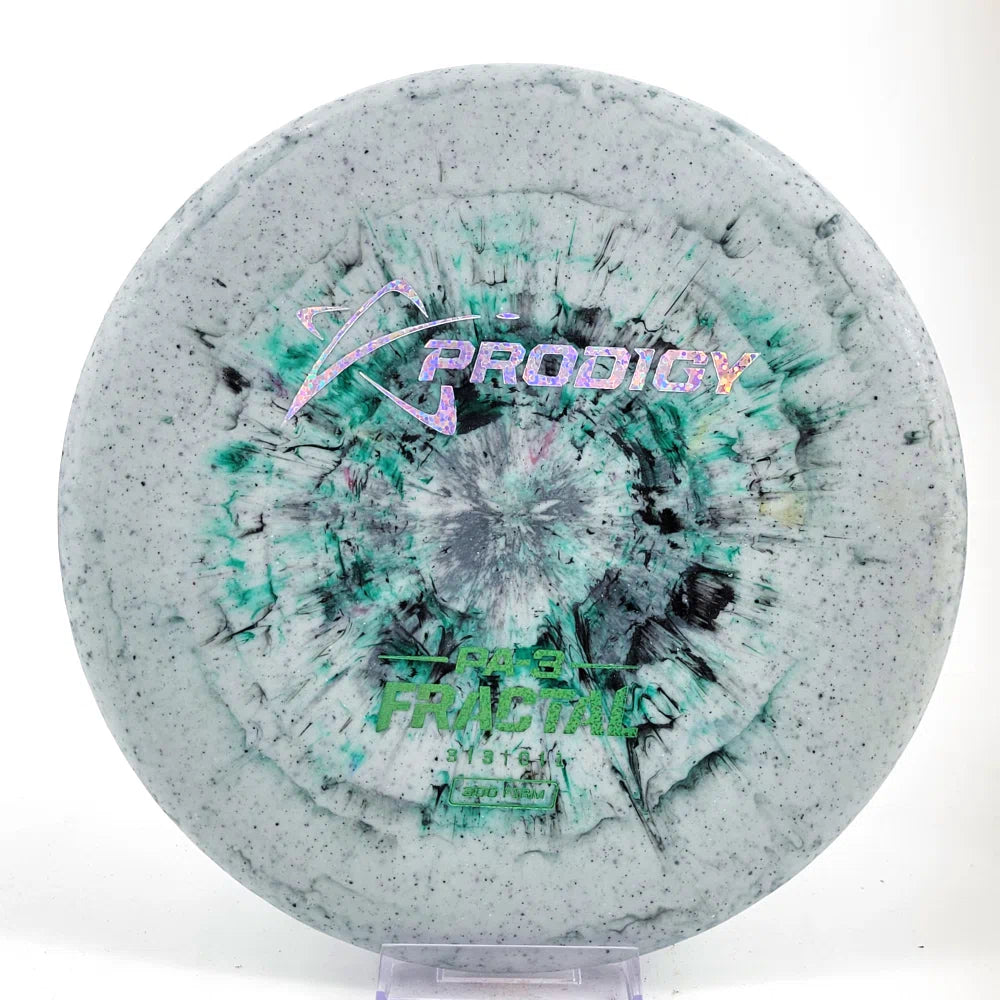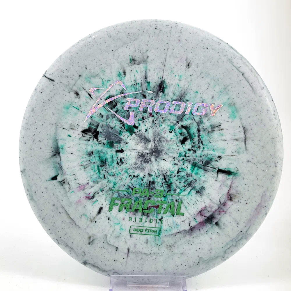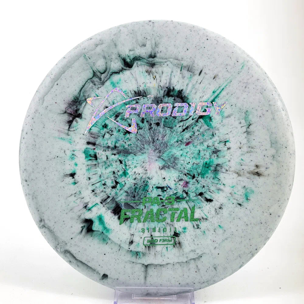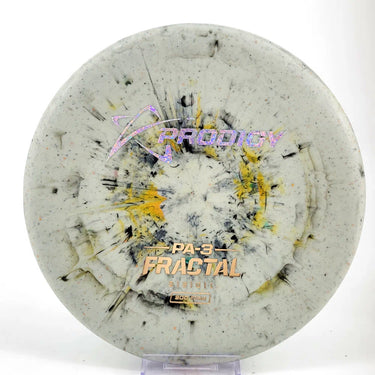 About the plastic: The Prodigy 300 Firm plastic is a firmer blend of the 300 plastic. It maintains the grip while providing a stiffer feel in the hand. 300 Firm Plastic retains grip even when wet. The Prodigy 300 Fractal Plastic is a special blend of materials that is durable enough to take solid impact, but can be beaten in over time. It maintains grip and great feel for Putters and Midranges. Fractal line discs utilize a new proprietary processing technique splashing colors in a complex motif that can trick the eye into seeing patterns while each element remains distinctive and abstract. It's calming, chaotic, and completely one-of-a-kind.