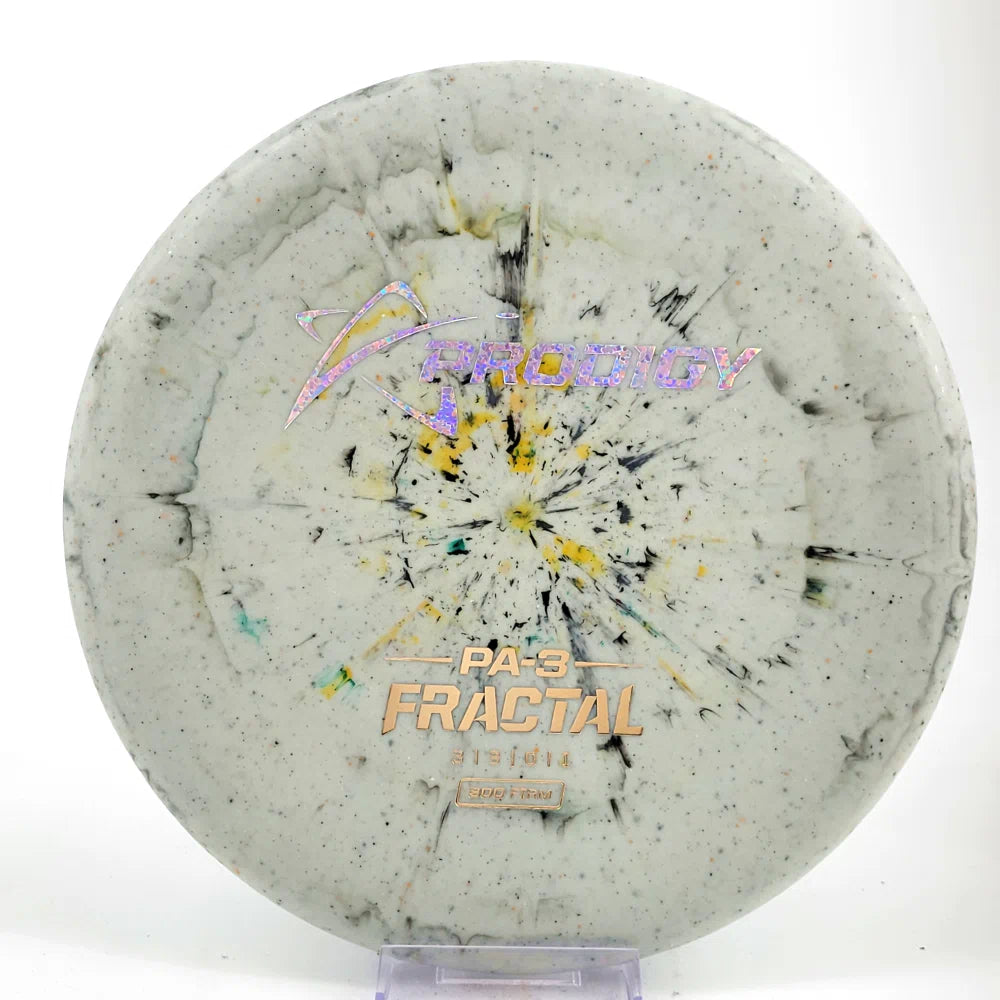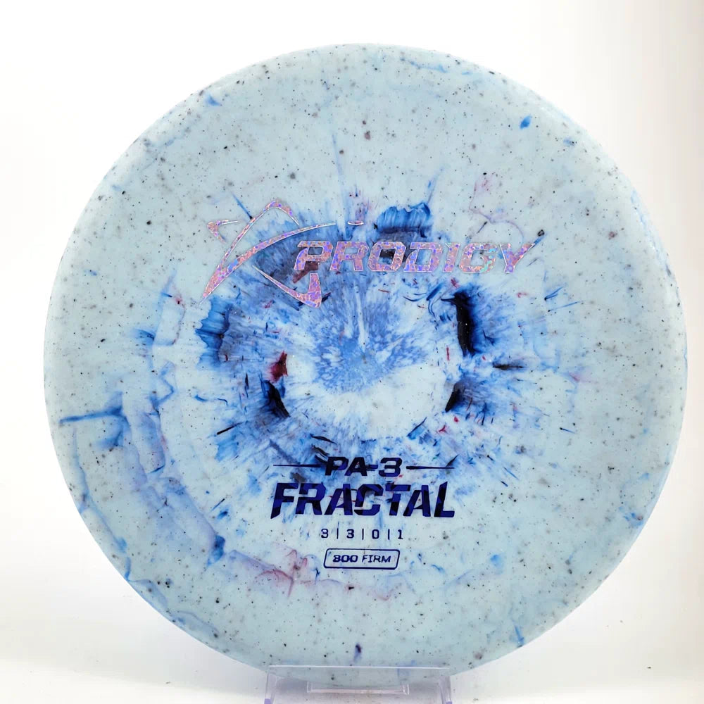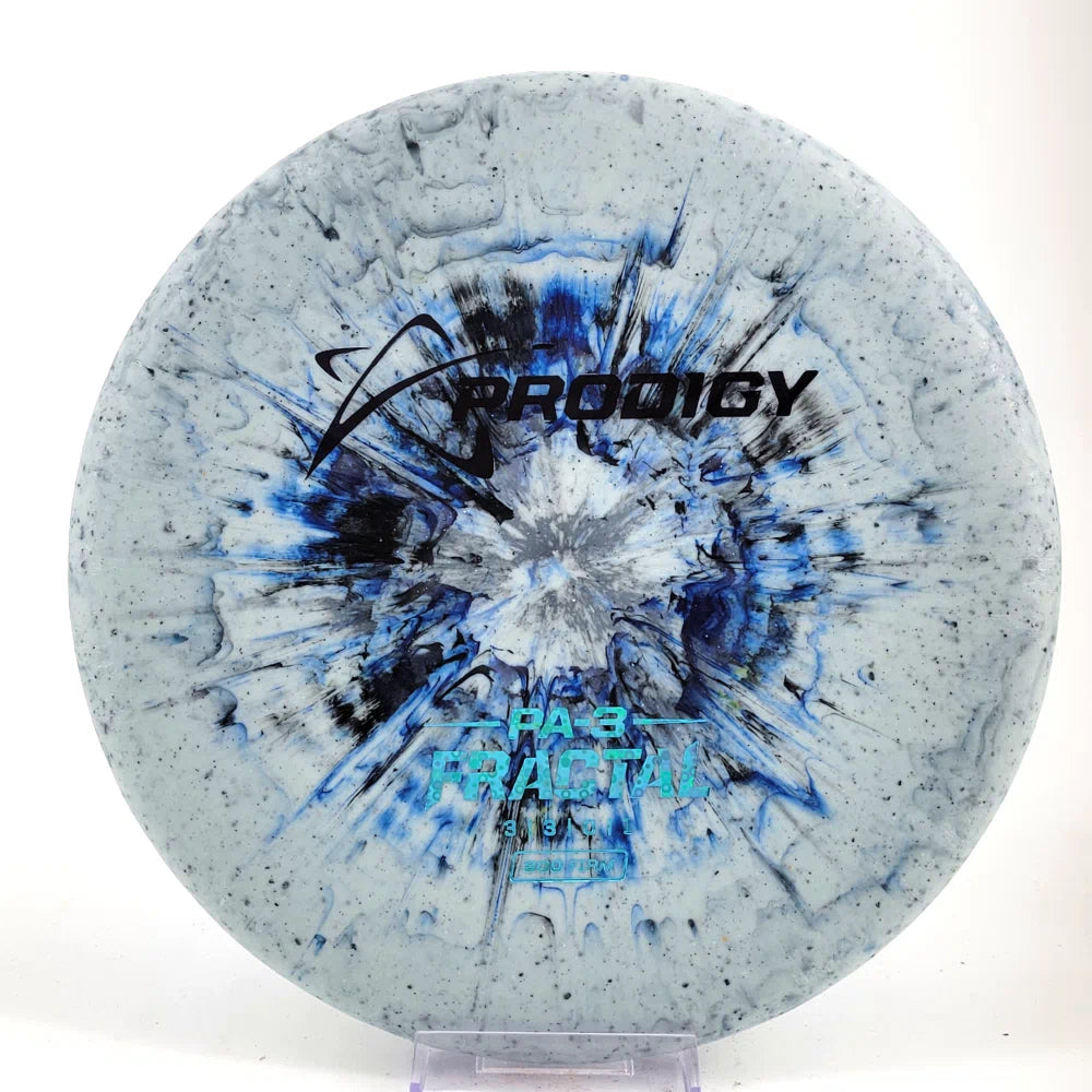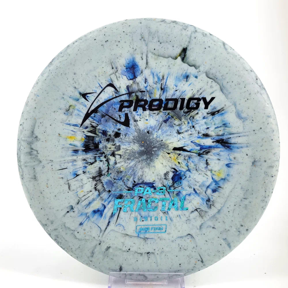 About the plastic: The Prodigy 300 Firm plastic is a firmer blend of the 300 plastic. It maintains the grip while providing a stiffer feel in the hand. 300 Firm Plastic retains grip even when wet. The Prodigy 300 Fractal Plastic is a special blend of materials that is durable enough to take solid impact, but can be beaten in over time. It maintains grip and great feel for Putters and Midranges. Fractal line discs utilize a new proprietary processing technique splashing colors in a complex motif that can trick the eye into seeing patterns while each element remains distinctive and abstract. It's calming, chaotic, and completely one-of-a-kind.