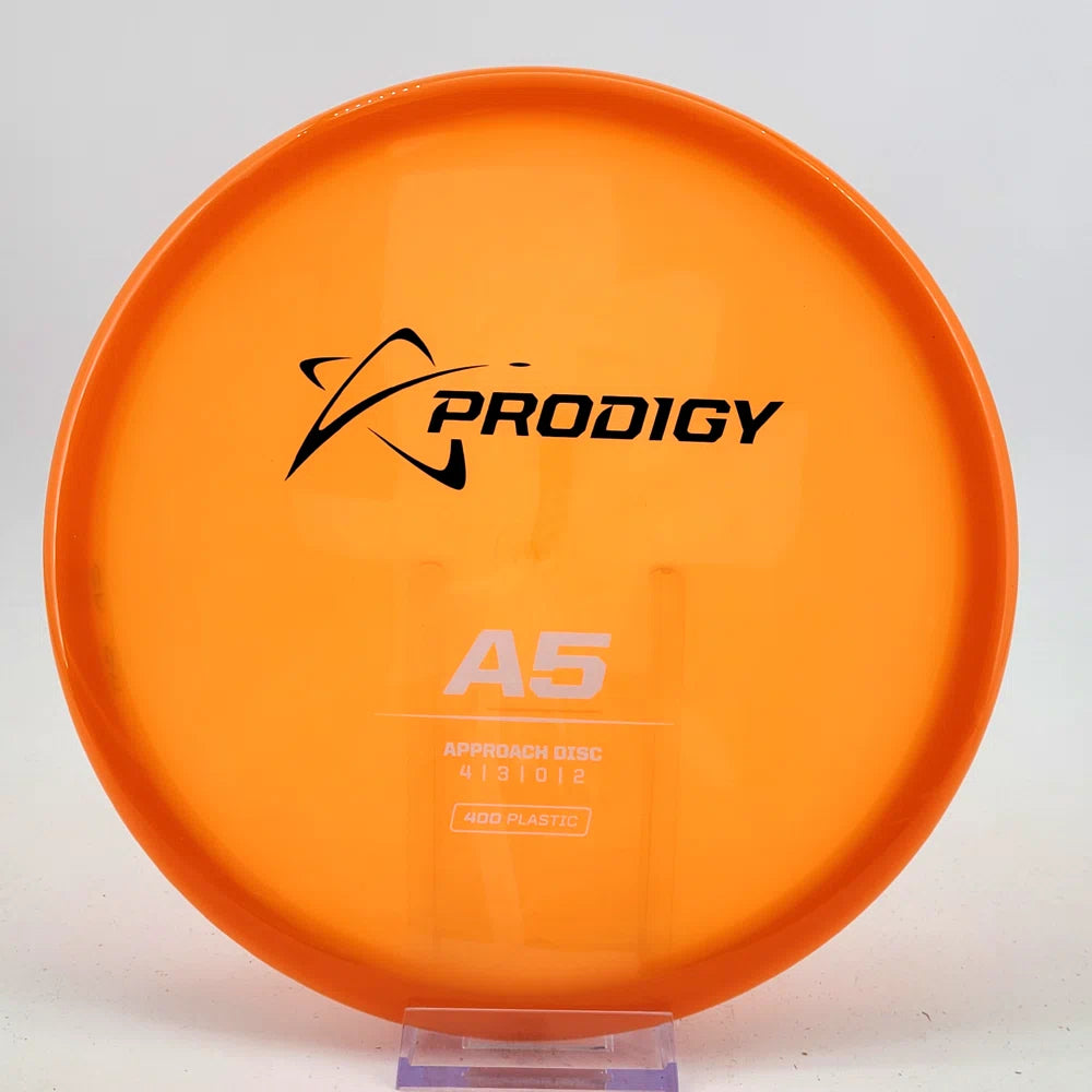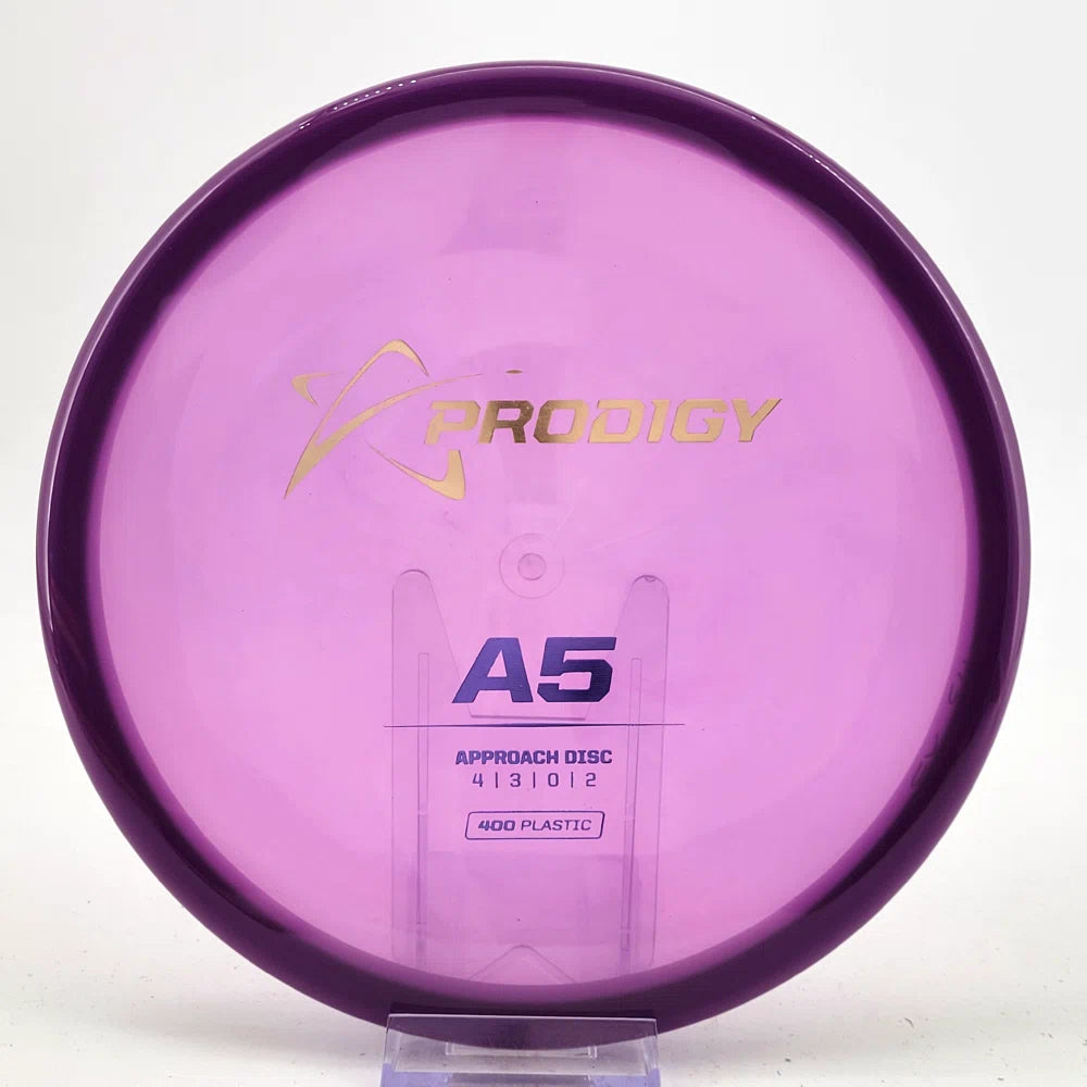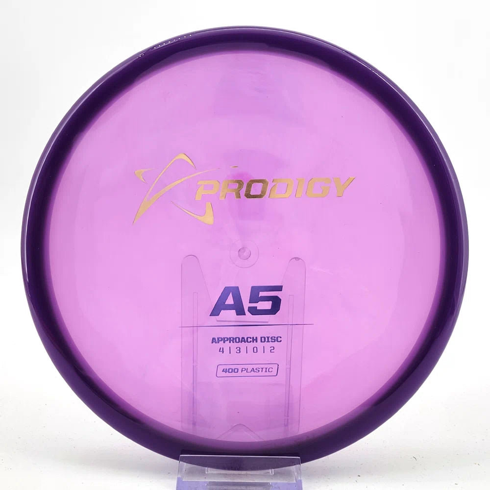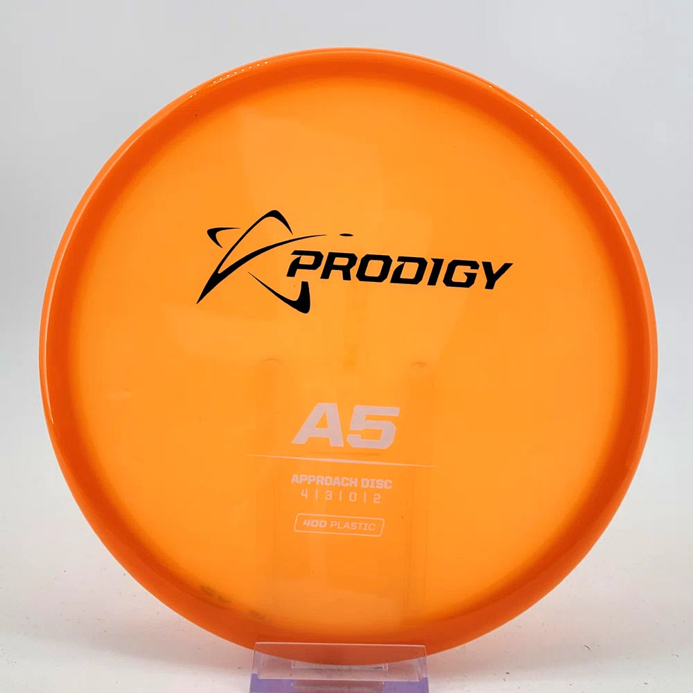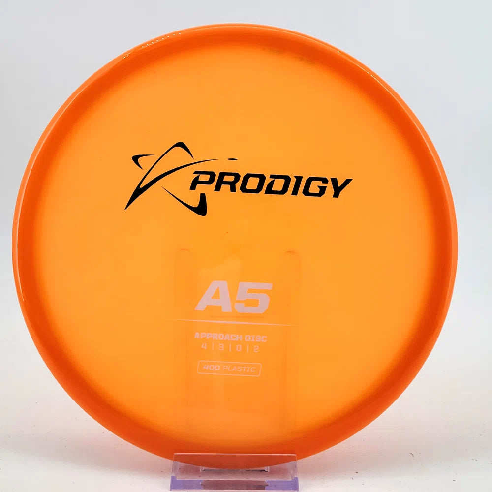 The Prodigy A5 is a slightly overstable approach disc that will work in to be a straight flyer. It has a nice, smooth feel with a shallow profile and flat top, which makes it ideal for sidearm approaches. It can handle torque well and has a mild finish on the end, so it won't skip too far from where it lands.