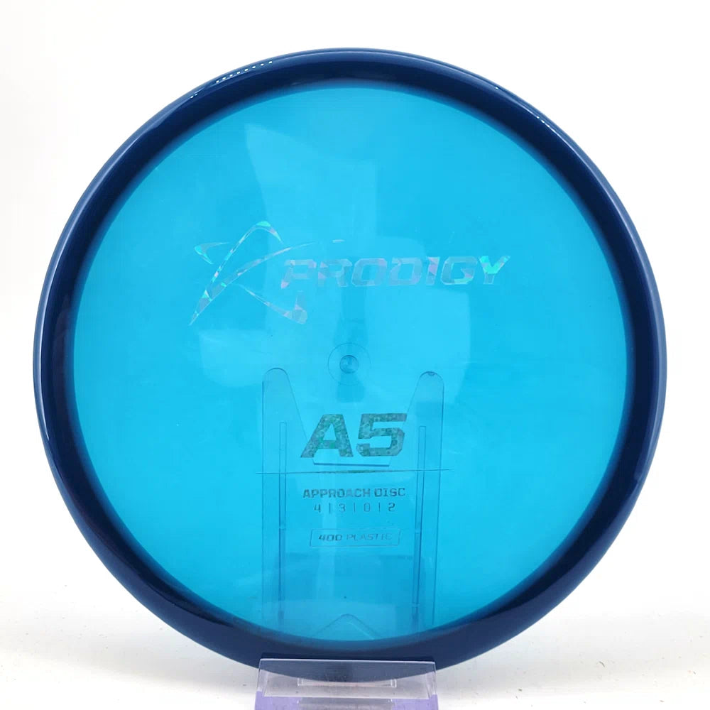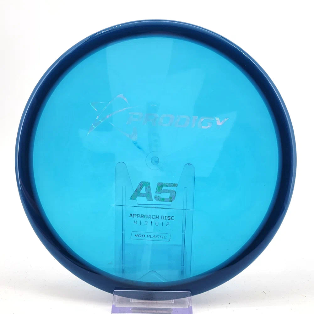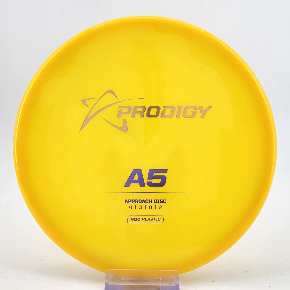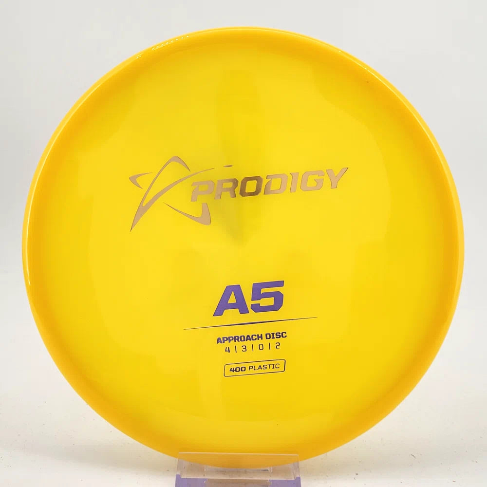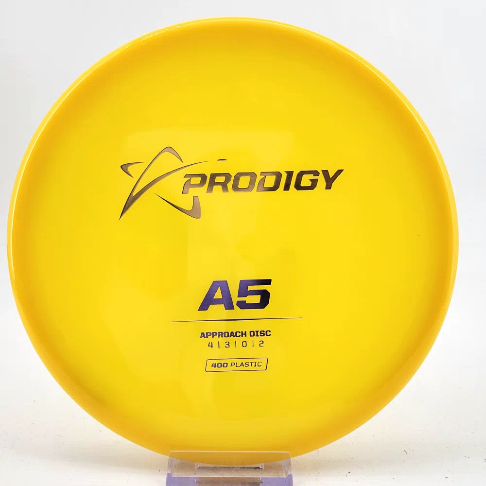 The Prodigy A5 is a slightly overstable approach disc that will work in to be a straight flyer. It has a nice, smooth feel with a shallow profile and flat top, which makes it ideal for sidearm approaches. It can handle torque well and has a mild finish on the end, so it won't skip too far from where it lands.