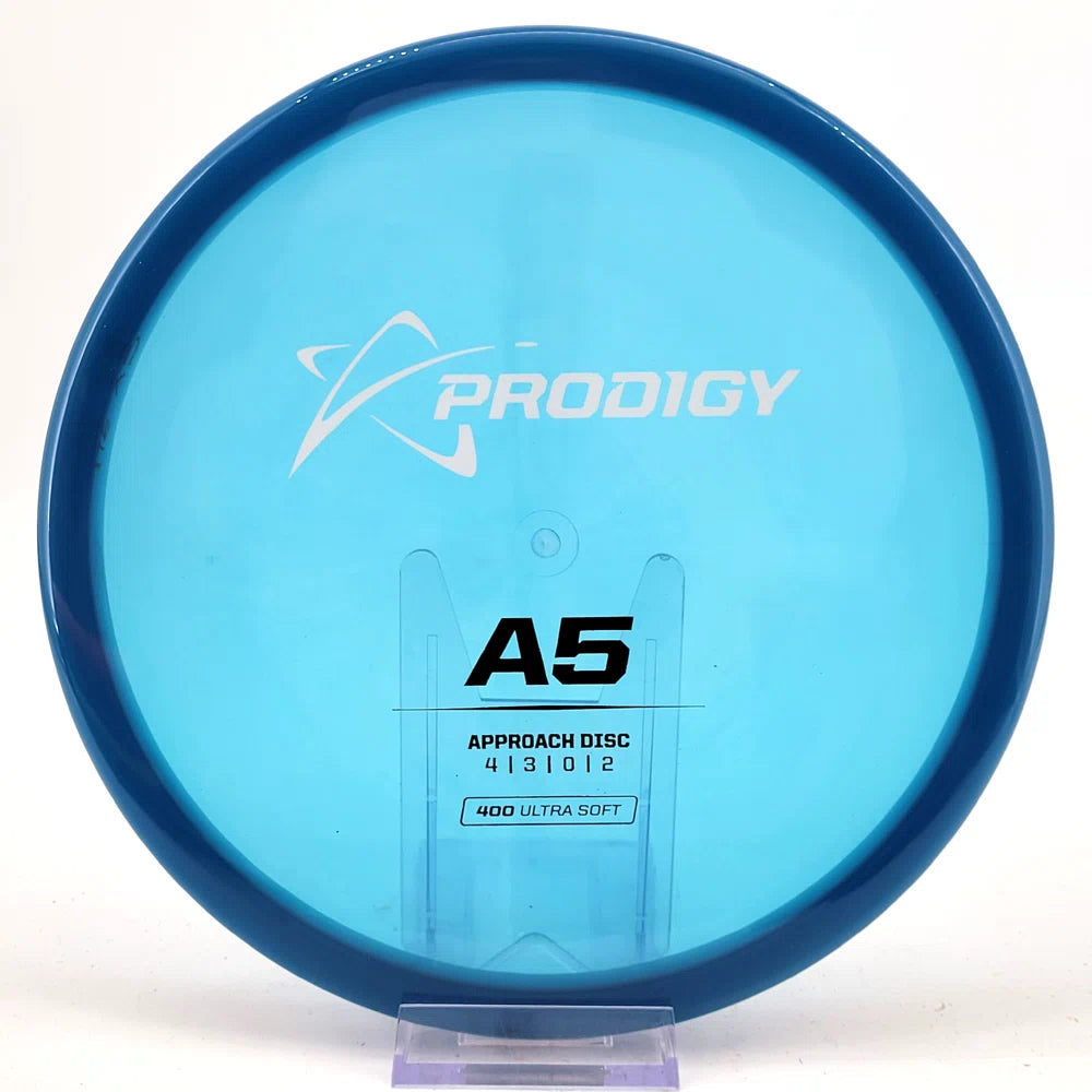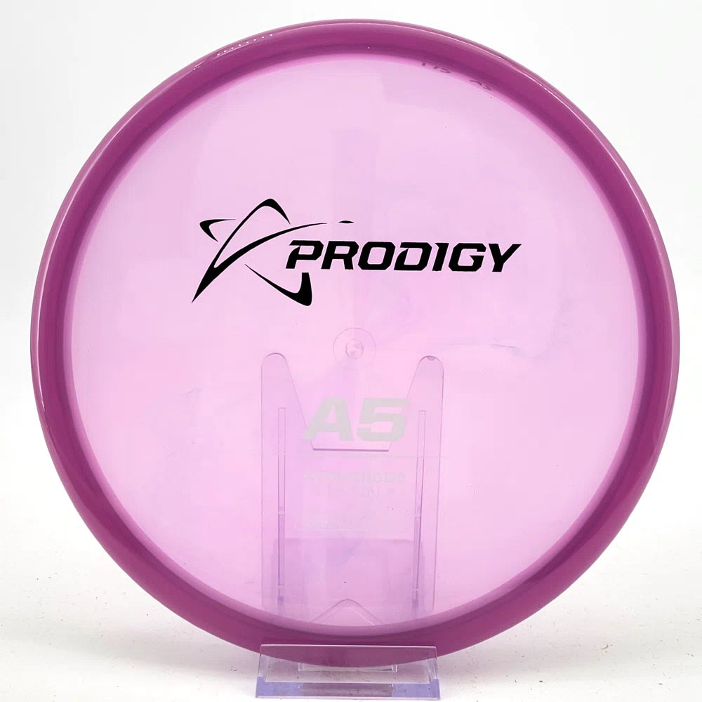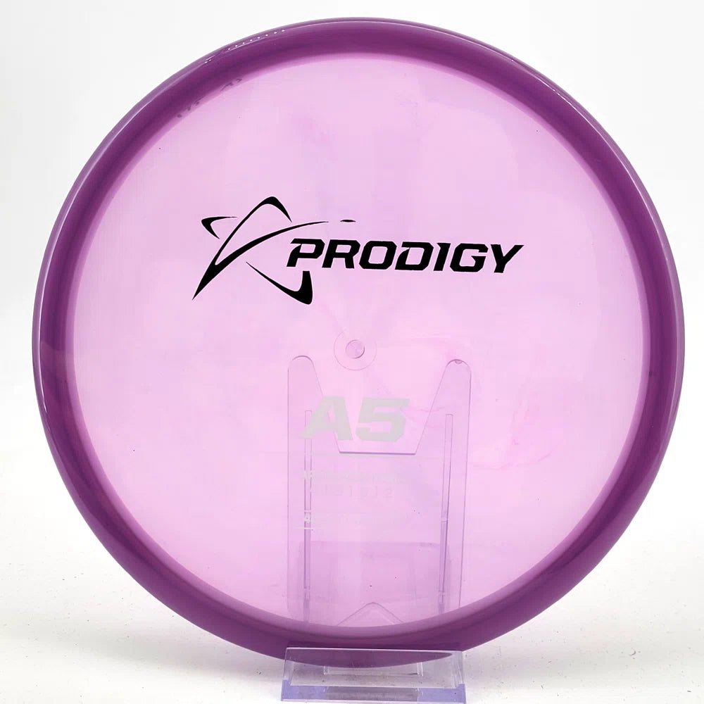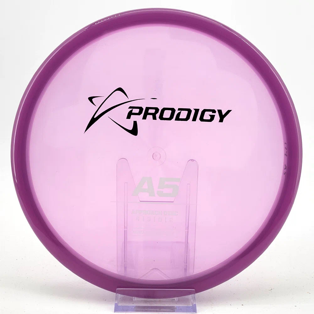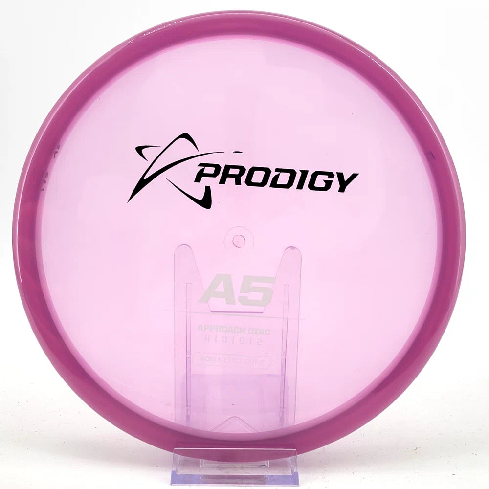 The Prodigy A5 is a slightly overstable approach disc that will work in to be a straight flyer. It has a nice, smooth feel with a shallow profile and flat top, which makes it ideal for sidearm approaches. It can handle torque well and has a mild finish on the end, so it won't skip too far from where it lands.