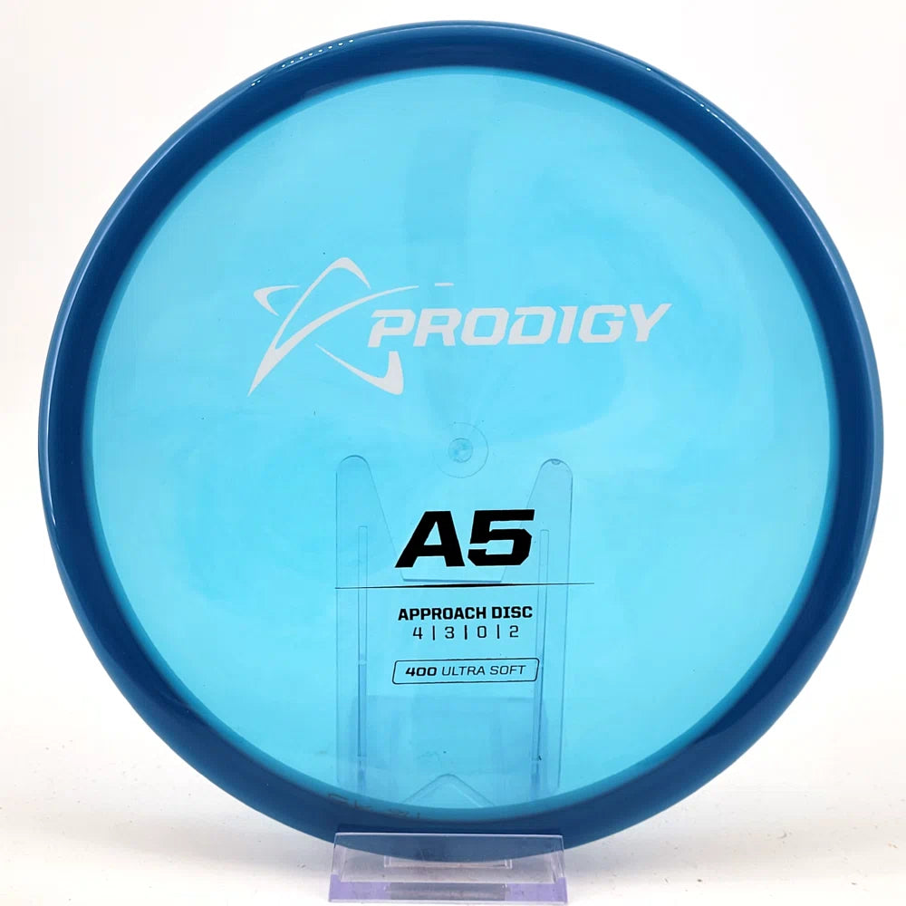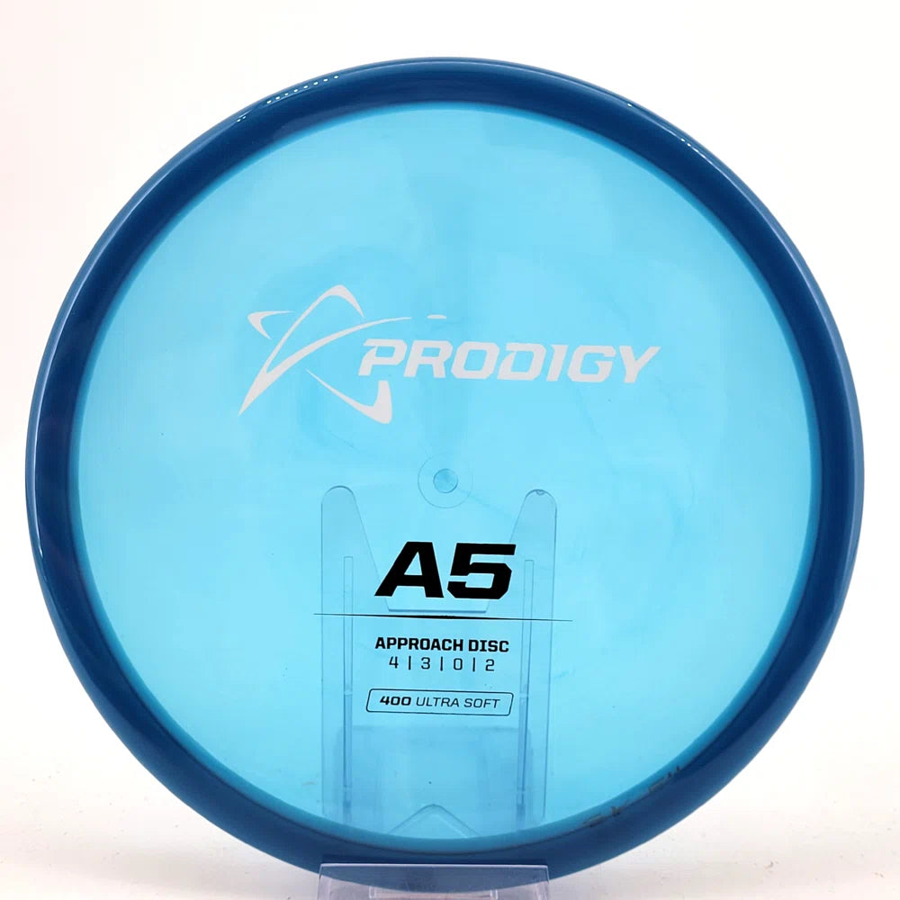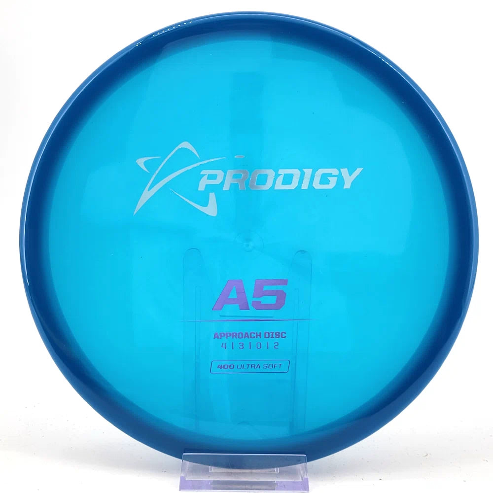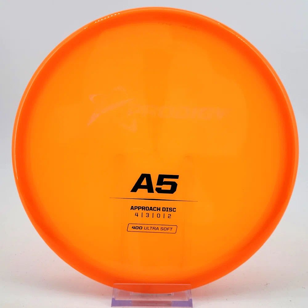 The Prodigy A5 is a slightly overstable approach disc that will work in to be a straight flyer. It has a nice, smooth feel with a shallow profile and flat top, which makes it ideal for sidearm approaches. It can handle torque well and has a mild finish on the end, so it won't skip too far from where it lands.