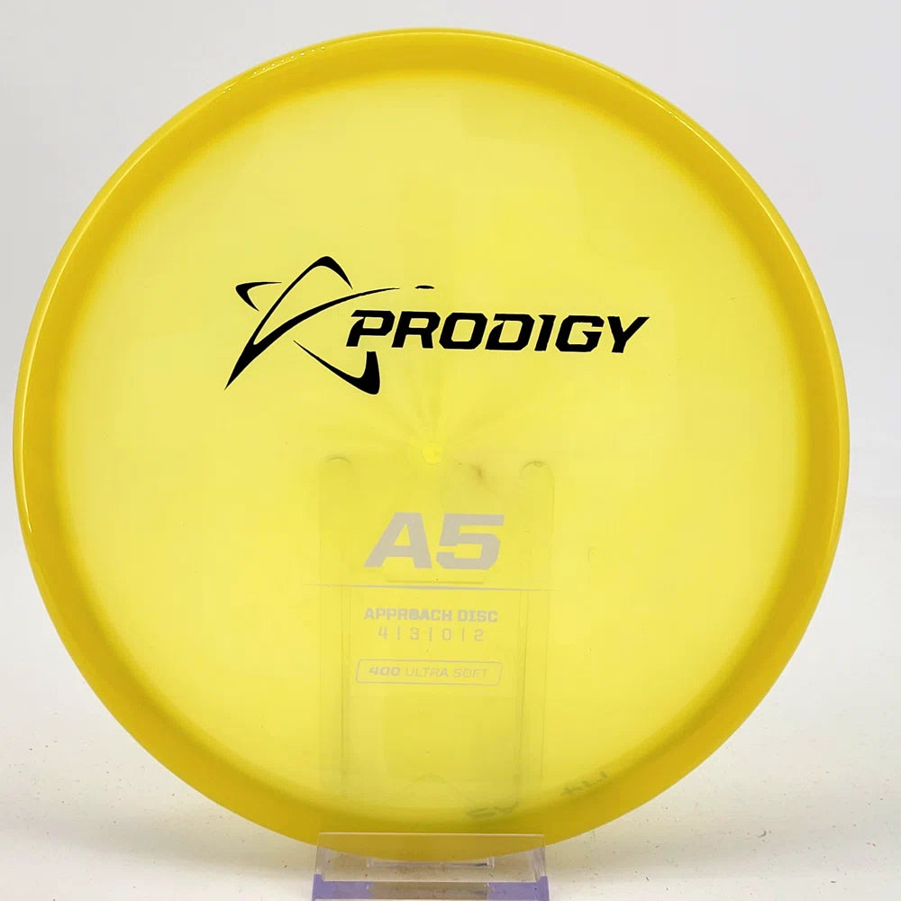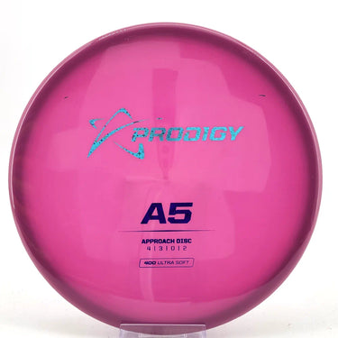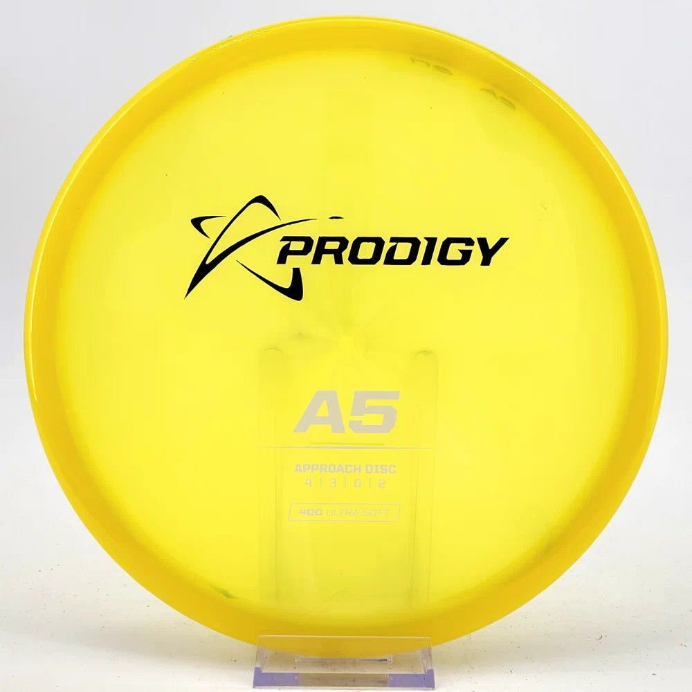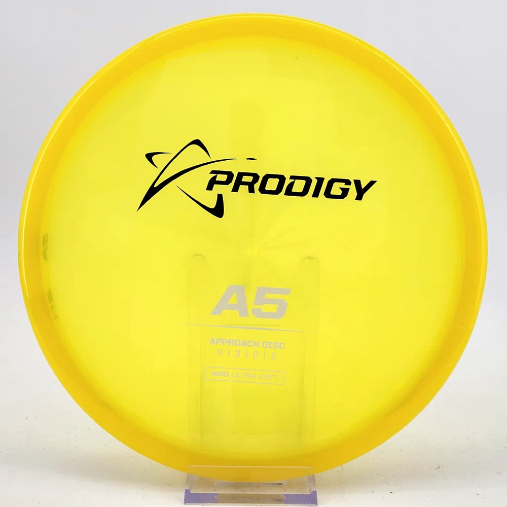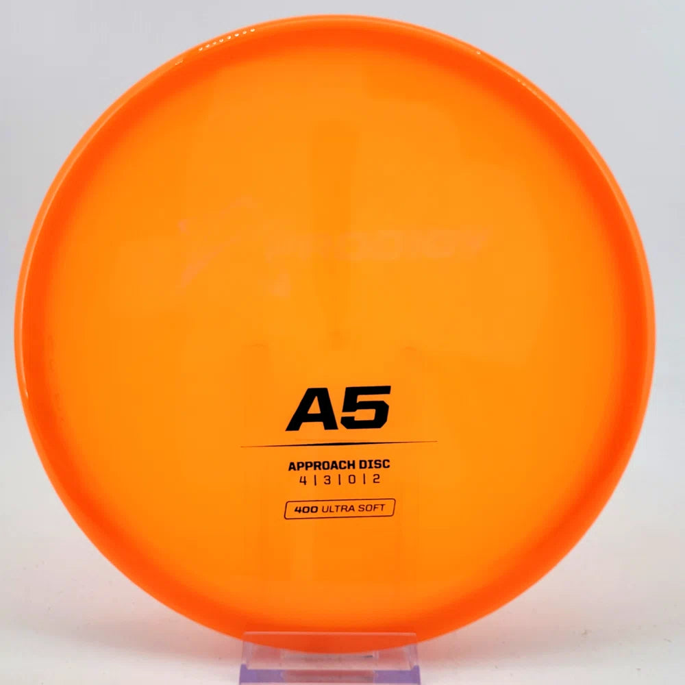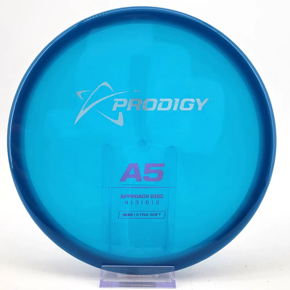 The Prodigy A5 is a slightly overstable approach disc that will work in to be a straight flyer. It has a nice, smooth feel with a shallow profile and flat top, which makes it ideal for sidearm approaches. It can handle torque well and has a mild finish on the end, so it won't skip too far from where it lands.