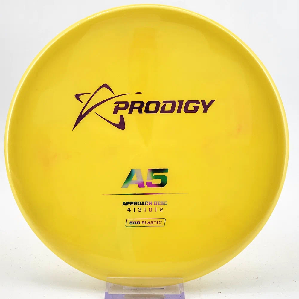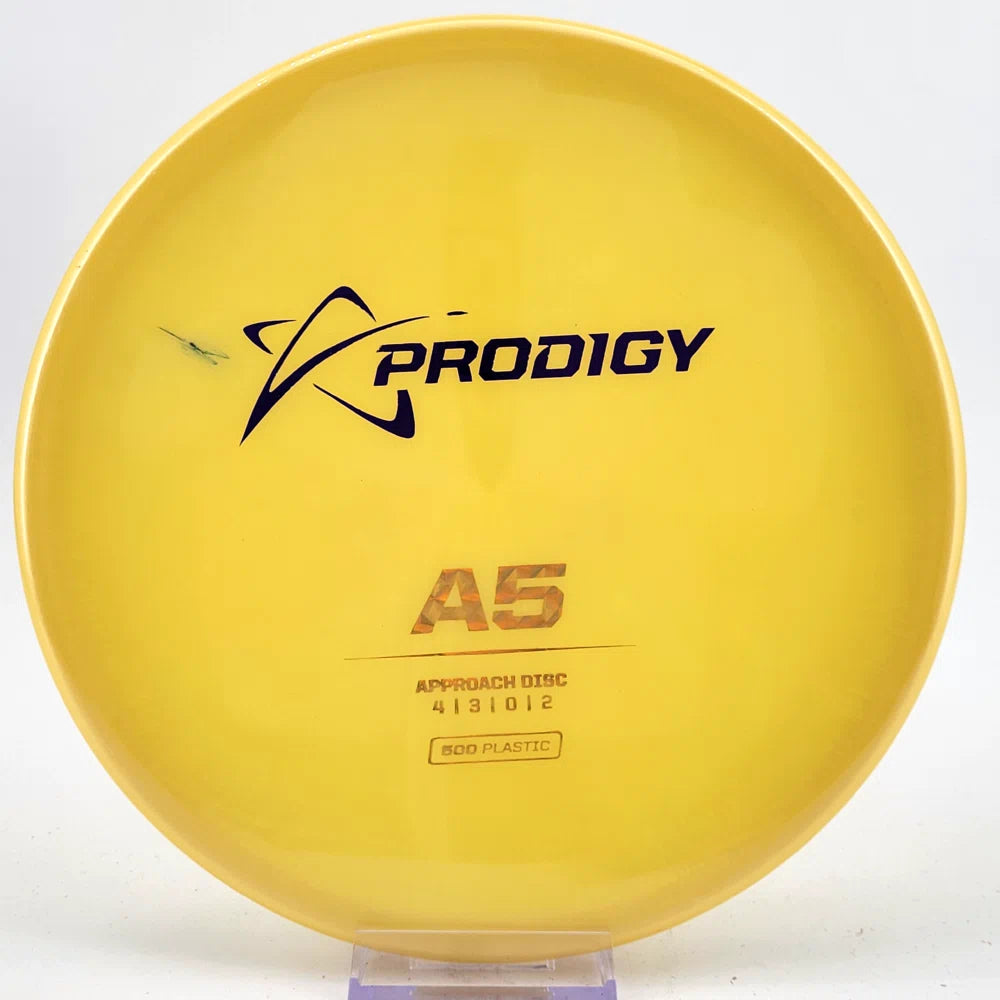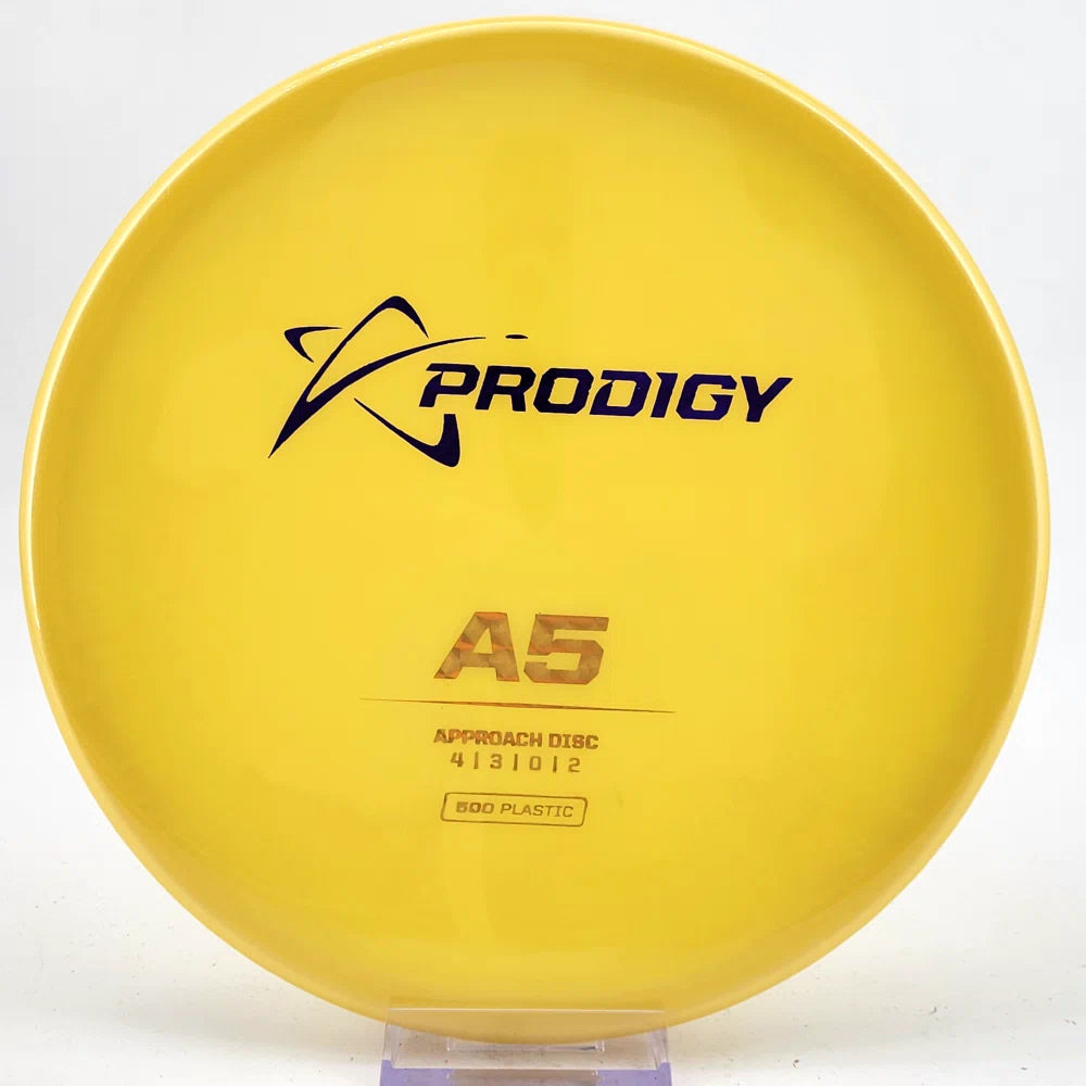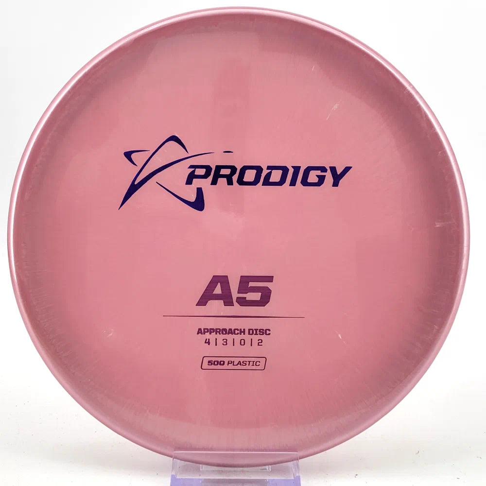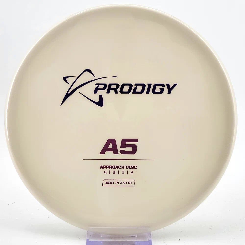 The Prodigy A5 is a slightly overstable approach disc that will work in to be a straight flyer. It has a nice, smooth feel with a shallow profile and flat top, which makes it ideal for sidearm approaches. It can handle torque well and has a mild finish on the end, so it won't skip too far from where it lands.