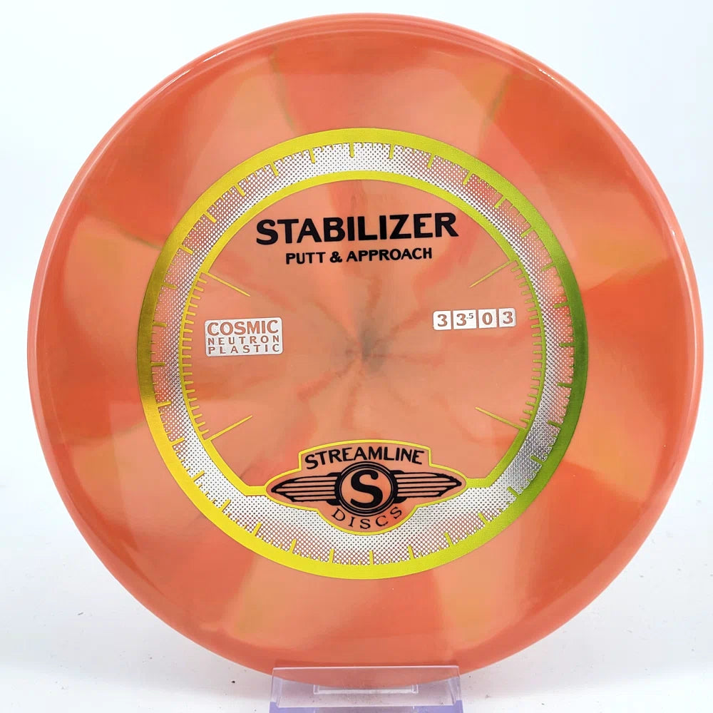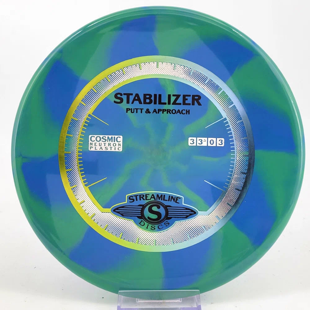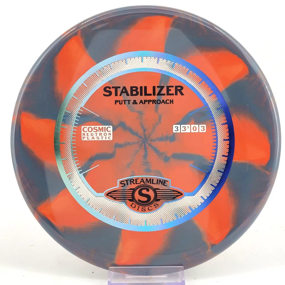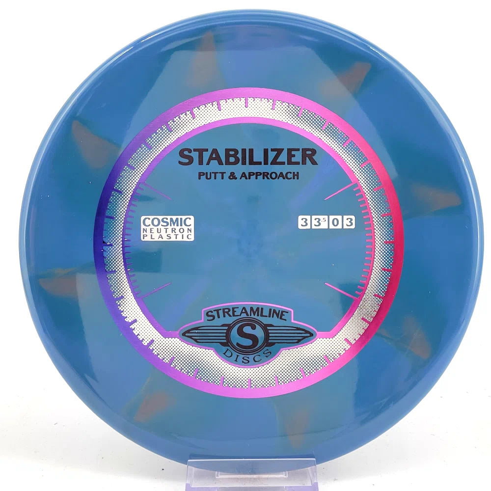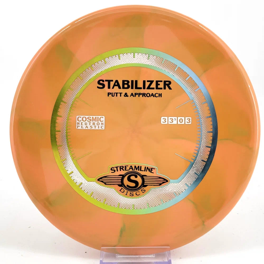 The Stabilizer is a new overstable putter from Streamline Discs, making its debut in Streamline Neutron and Cosmic Neutron plastic. This is the second putter from Streamline Discs and is the overstable compliment to the Streamline Pilot. The Stabilizer has a similar hand feel and depth as the Neutron Pilot, but with a slightly raised shoulder and more pointed nose that produces a flatter and more stable putter. The Stabilizers defining flight characteristic is straight flights with minimal turn, into a strong finishing fade for point and shoot accuracy on the approach.