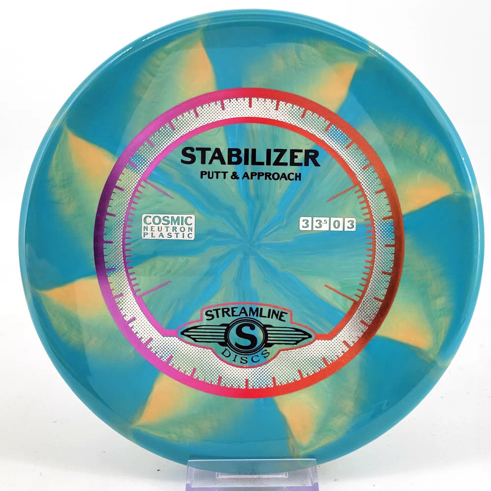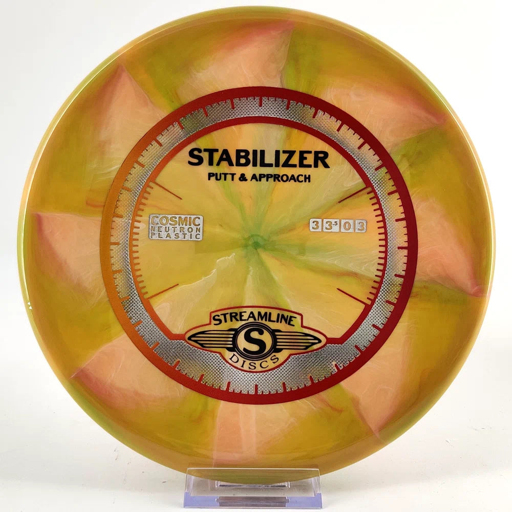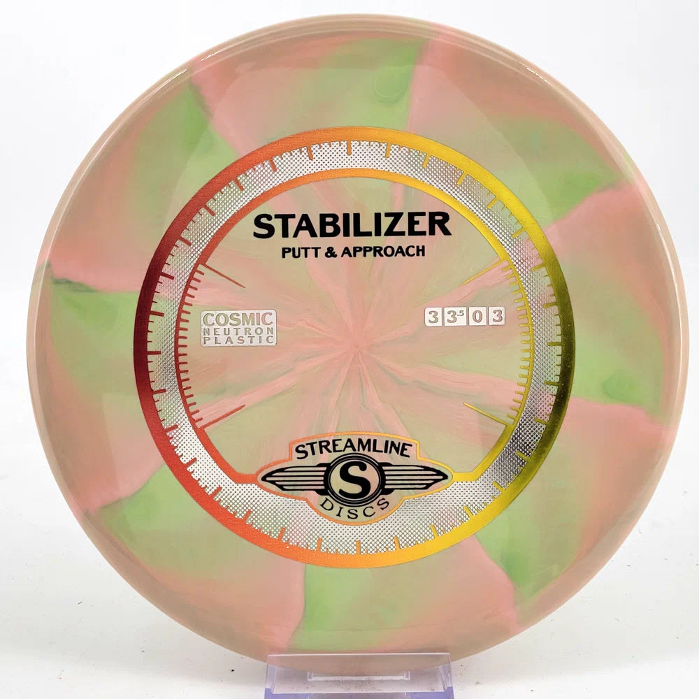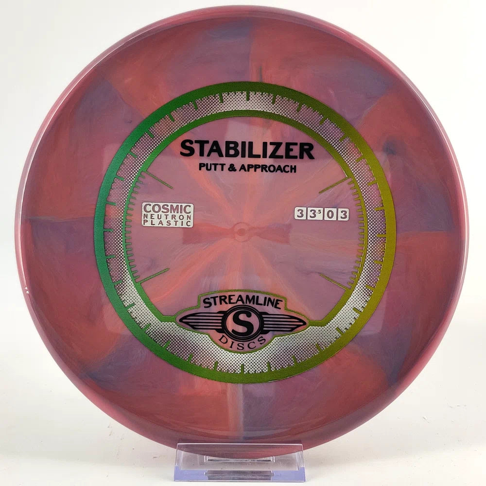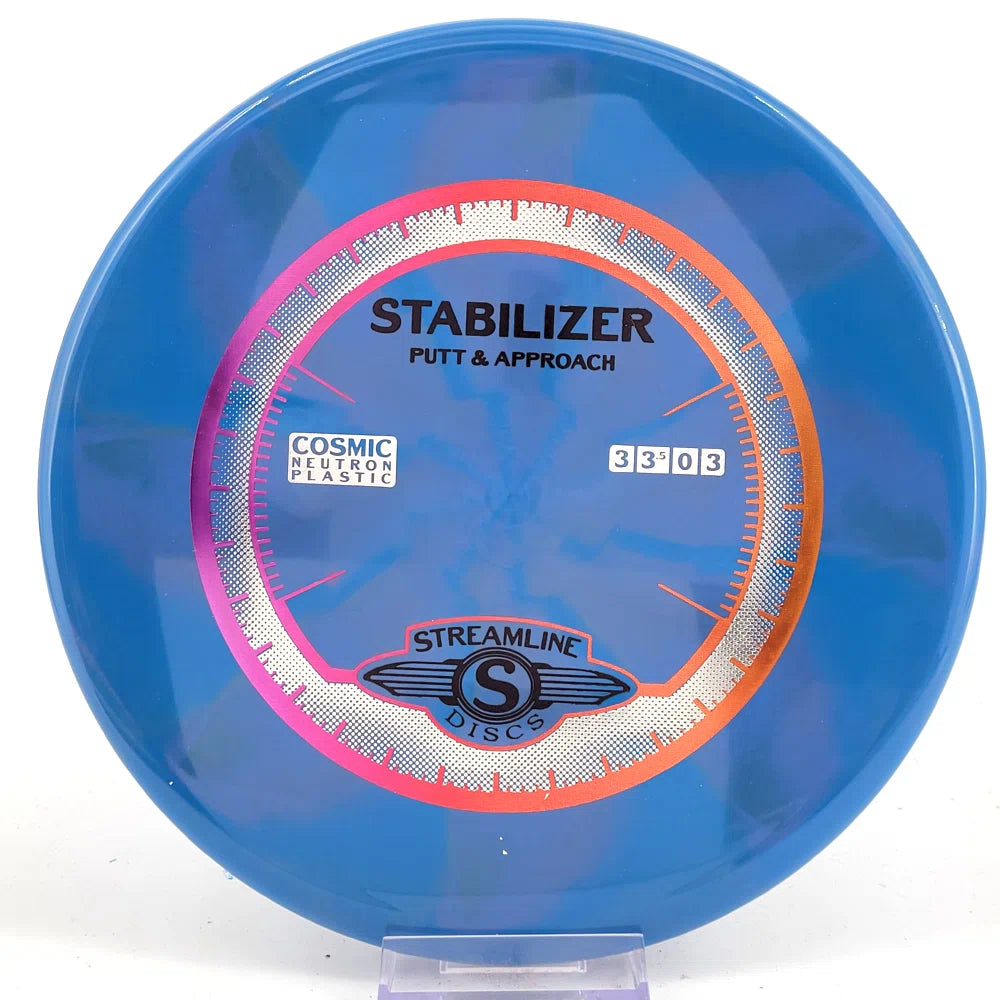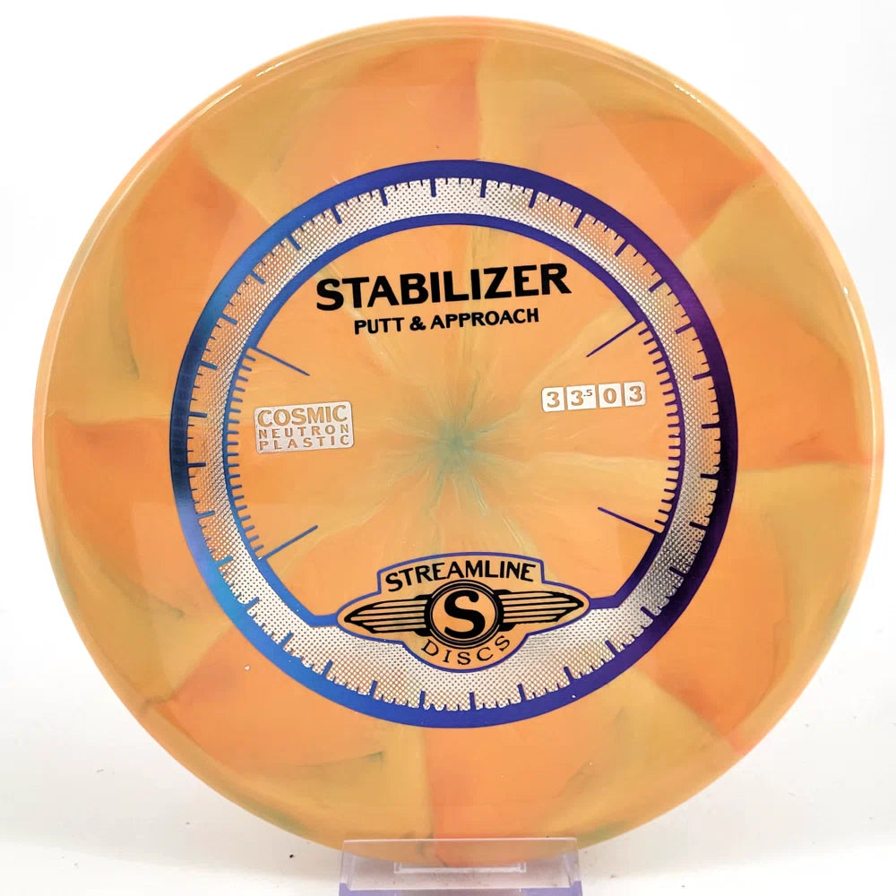 The Stabilizer is a new overstable putter from Streamline Discs, making its debut in Streamline Neutron and Cosmic Neutron plastic. This is the second putter from Streamline Discs and is the overstable compliment to the Streamline Pilot. The Stabilizer has a similar hand feel and depth as the Neutron Pilot, but with a slightly raised shoulder and more pointed nose that produces a flatter and more stable putter. The Stabilizers defining flight characteristic is straight flights with minimal turn, into a strong finishing fade for point and shoot accuracy on the approach.